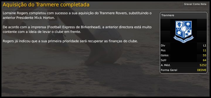 Bruno Trink Postado 13 de Março 2009 Autor Denunciar Postado 13 de Março 2009 É que gosto mais de Hyde do que este outro nome :lol: Só errei o time mas o comentário era aquele mesmo :heh: Já não possui grandes aspirações mas também não teve sofrimento para se manter, com esta classificação dá pra ter esperanças na próxima temporada.Boa sorte com o Tranmere Rovers!!!!!! :D É, eu também preferia. E não só o nome!!! :heh: Faltou sorte contra o Qatar. Bom ver que o Tranmere evoluiu e manteve-se firme na liga. Agora é a hora de repensar no elenco e almejar novos objetivos na próxima temporada. Vamos ver... Não sei nem ainda se fico! 05.05.2012 Um clima de fim de festa pairava em Prenton Park no último mês. E nem foi uma festa daquelas... Tivemos seis jogos apenas para cumprir tabela, vencemos apenas um, contra o já rebaixado Swindon. Nem o Brentford, lanterna do campeonato, conseguimos derrotar. Mesmo assim, terminamos a Coca-Cola League 1 na 11ª posição, mais ou menos onde eu esperava chegar quando assumi o Tranmere Rovers. Apesar de um ou outro torcedor mais empolgado com uma boa fase que tivemos, eu nunca acreditei em nada além disso. Estamos em meio a uma possível saída do presidente Mick Horton. Os boatos dão conta de que a vice-presidente Lorraine Rogers deve assumir, mas não há nada certo ainda. Não sei até que ponto isso influencia na minha continuidade aqui, terei que esperar para ver. Só sei que, se ficar, farei uma limpa no elenco. Alguns jogadores ainda não engoliram o fato de serem dirigidos por um treinador não tão experiente. Outros muitos não estão nos meus planos. De qualquer forma, não posso fazer muito agora, enquanto o futuro do próprio clube não está claro. Citar