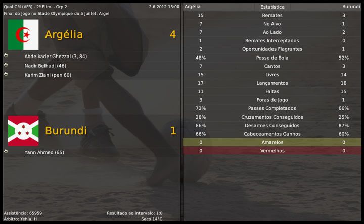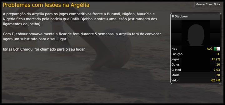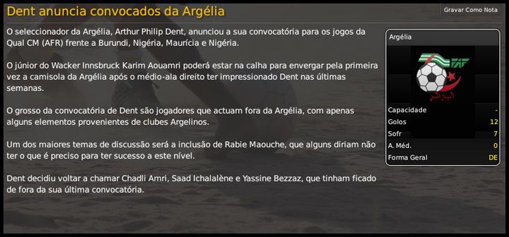Bruno Trink Postado 13 de Março 2009 Autor Denunciar Postado 13 de Março 2009 Eh foi bem caótico este final, não ganhou posições mas também não perdeu.Agora é trabalhar para a nova temporada. Achei até curioso, até a diferença pra zona de playoffs ficou mais ou menos a mesma. É difícil conseguir motivar o time para jogos que não valem nada. Temporada muito boa para quem pegou um clube na zona do rebaixamento. Agora é como você disse, esperar a mudança na presidência e iniciar a reformulação do elenco. O meu objetivo foi cumprido. Só vou poder começar a reformular o elenco no final de junho, quando os contratos se encerram e eu posso negociar as contratações, já que estou limitadíssimo financeiramente. Confiou no teu próprio taco e levou o clube para o meião da tabela. Quem sabe agora, se tudo der certo com o novo presidente, pegando o time durante a pré-temporada e obviamente tendo mais tempo, não vai mais longe? E o Hyde? É nisso que eu aposto, tentar moldar o elenco ao meu gosto. O Hyde fez uma graça no início da temporada, chegou a ficar na zona de playoff, mas terminou a League 2 em 15º. ya e o hide favor atualixar eu tou a ficar viciado na ixtoria :) 02.06.2012 Os jogadores do Tranmere já estão de férias, mas eu não. Hoje começam, para a Argélia, as eliminatórias para a Copa do Mundo de 2014, que será disputada no Brasil. Quarenta e oito equipes estão divididas em doze grupos e nós estamos junto com Nigéria, Burundi e Maurícia. Classificam-se para a próxima fase os doze primeiros colocados e mais os oito melhores segundos. Nossa disputa, na teoria, é com a Nigéria, mas, por isso mesmo, não podemos nos descuidar com os outros dois adversários. Estreamos, hoje, em casa, contra Burundi. No momento da convocação, tinha todos os jogadores a minha disposição, sem problema nenhum de ordem médica. Pude escolher, então, os melhores, inclusive o jovem Karim Aouamri, que se destacou na base do Wacker Innsbruck. Dois dias depois, recebi a notícia de que não poderia contar com o atacante Rafik Djebbour, que teve um estiramento dos ligamentos do joelho. Chamei, em seu lugar, o meia atacante Idriss Ech Chergui, que estava fazendo muitos gols no Levski Sofia. Minhas fichas serão apostadas, novamente, no quarteto Belhadj-Ziani-Ghillas-Ghezzal, espero que eles mostrem mais do que fizeram nos amistosos contra Inglaterra e Qatar. Antes de viajar para a Argélia, recebi a notícia da mudança na direção do Tranmere Rovers. Conforme os boatos apontava, Lorraine Rogers será nossa nova presidente e já avisou que sua prioridade é recuperar as finanças e que não fará novos investimentos no clube. A temporada "promete"... Citar