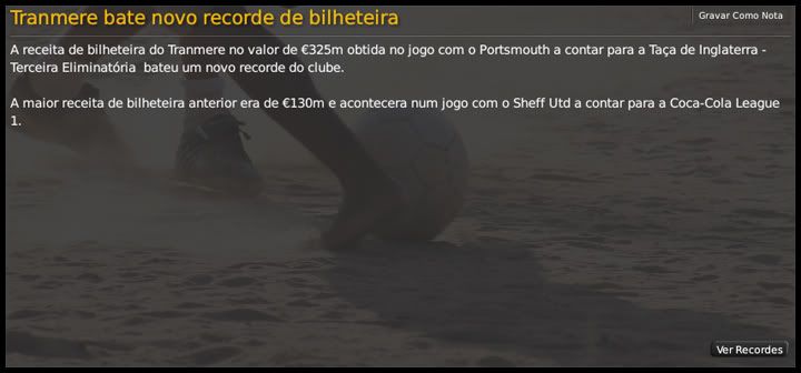 Bruno Trink Postado 19 de Março 2009 Autor Denunciar Postado 19 de Março 2009 Verdade. Os diretores de futebol são peças importantíssimas no futebol :D Concordo!!! :P isso ta perigoso normalmente uma equipa muito regular no final da época costuma azedar vê se conchegue no mínimo dez pontos de vantagem do segundo classificado Espero manter o ritmo, mas sei que é difícil mesmo... Vamos subir, você consegue Força! Valeu!!! 07.01.2013 Ninguém, em sã consciência, esperava que o Tranmere pudesse proporcionar alguma surpresa na FA Cup. O adversário era o Portsmouth, 6º colocado na Premier League, atrás apenas dos quatro grandes e do City. Prenton Park estava praticamente lotado, muitos dos nossos torcedores estavam lá para ver o Pompey já, que com exceção do nosso parceiro Wigan, é raro termos uma equipe de primeira divisão em nosso estádio. Eu era um dos que, pelo menos internamente, não acreditava. Passei, inclusive, para nossos jogadores (os reservas, como tem sido hábito nas copas) no vestiário para que jogassem sem se preocupar com o resultado, apenas para fazer o melhor possível. Ainda tinha torcedor chegando ao estádio quando Darby tabelou com Helton dos Reis pela direita e cruzou a bola para a meia lua da área. McDonald chutou como ela veio, Begovic ainda tocou na bola, que caprichosamente bateu na trave antes de entrar. Foi, com 36 segundos de jogo, o gol mais rápido marcado em um jogo. O Portsmouth sentiu. Pressionamos, conseguimos alguns escanteios, e, aos 16, Alan Gow avançou, tocou para Helton dos Reis que acertou um chute espírita, a 30 metros de distância. A torcida não sabia se comemorava, não estava entendendo bem o que estava acontecendo. O Pompey só se achou em campo aos 28 minutos, mas Manninger defendeu uma cabeçada de Koroma. Eles vieram pra cima, mas isso não quis dizer que recuamos. Ficou um jogo igual, nem parecia uma partida entre times com duas divisões de diferença. Chances tanto para nós quanto para eles, a 1ª etapa terminou mesmo 2 a 0 pra nós. Da mesma forma começou o 2º tempo, igual. Numa ótima jogada do holandês Riga, Daniel Sturridge diminuiu. Aos 19, Darby perdeu a oportunidade de matar o jogo. Sabia que eles viriam pra dentro depois do gol. Stiliyan Petrov, que entrou na 2ª etapa, acertou um belo chute na trave. Mas foi a única grande chance deles. Vitória épica, que marcou, também, outro recorde, o de bilheteria. Na próxima fase, outra pedreira, o Tottenham, 7º na Premier League. Mais uma chance para uma boa bilheteria, estamos precisando! Citar