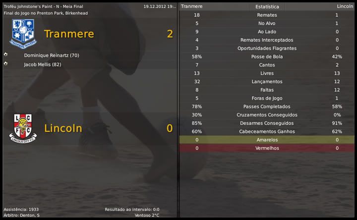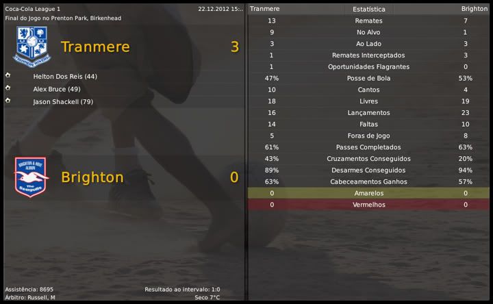 Bruno Trink Postado 19 de Março 2009 Autor Denunciar Postado 19 de Março 2009 29.12.2012 Fim do ano, fim também do que seria o 1º turno da Coca-Cola League 1. Chegamos à metade do campeonato e aparecemos isolados no topo da classificação. Não é para menos, o time não perde. Estamos a 23 jogos sem saber o que é uma derrota, o que é um novo recorde na história do clube. Das últimas dez partidas, vencemos oito e empatamos duas, a última sobre o até então vice-líder Northampton. O placar de 3 a 1 não mostra o equilíbrio da partida. Fomos melhores sim, aproveitamos o fato de jogar no Prenton Park, mas os Cobblers estavam arrancando um empate até os 45 do segundo tempo, quando Miku fez seu 2º gol e, logo depois, McDonald ampliou. Algumas partidas tem, realmente, sido tranquilas, como quando vencemos o Brighton Hove and Albion, onde os derrotamos com autoridade. Outras são mais difíceis, a vitória sobre o Doncaster, por exemplo, com o time reserva em campo e um jogador a menos desde os 38 minutos da primeira etapa. Continuamos, também, avançando nas outras competições. Na FA Cup, só precisamos de 15 minutos para bater o Bromley e, na Johnstone's Paint Trophy, chegamos à final da Zona Norte depois de vencer o Lincoln. Ainda bem que o Burnley bateu o Hyde United e eu não vou precisar, ainda, enfrentar a equipe que me deu a primeira chance no futebol. Citar