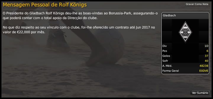 Bruno Trink Postado 23 de Março 2009 Autor Denunciar Postado 23 de Março 2009 orra.. perdi mta coisa.. vamos lá.. parabens pelo titulo com o tranmere.. campanha irretocavel! no clube grego lá, foi só a passeio né? :heh: eu faria o mesmo que voce.. levando em conta que eles estavam bem na copa, é um titulo que se disputa.. pena que tenha prevalecido a superioridade do panathinaikos! =[ quero ver agora na alemanha.. qual a cotação da imprensa sobre o borussia monchengldbach? Falei que você tinha perdido muito!!! :) Ainda não saiu a previsão da imprensa, os jogadores nem saíram de férias. A gente sempre pensa nisso, daí em uma ou duas temporadas brilha, chega aquela oferta tentadora de um clube gigante e pronto, fudeu os planos todos. :heh: Só se for um clube gigante mesmo... ;) 10.06.2013 Coloquei meia dúzia de camisas, umas gravatas, vesti o terno e fui para Heathrow, pegar o avião para Düsseldorf. Uma hora e pouco de viagem, de lá parti para Mönchengladbach, cidade natal dos ex-pilotos de F1 Nick Heidfeld e Heinz-Harald Frentzen. Cheguei no Borussia Park por volta das 2 da tarde e lá estavam para me receber, além do presidente Ralf Königs, alguns diretores e o treinador adjunto, Markus Gellhaus. Depois das formalidades com a diretoria, fui conversar com ele, saber mais sobre o elenco do Gladbach. Ele me disse que, se minhas pretensões fossem ficar no meio da tabela, numa posição confortável, sem riscos de rebaixamento, o plantel era suficiente. Respondi logo que queria mais, que minha idéia era, pelo menos, conseguir classificação para a Taça EURO. Para isso, ele me disse, teremos que reforçar a equipe, principalmente no meio de campo. Pelo que eu vi, falta ao elenco um pouco de equilíbrio. Temos muitos meias e poucos volantes. Falta um zagueiro para jogar ao lado de Lukasz Mielec. Os atacantes são bons, mas todos tem mais de 32 anos. Peças de reposição para as laterais e um goleiro reserva mais qualificado serão procurados. Financeiramente, a situação é segura. Um balanço de quase €25 milhões, o contrato do fornecedor de equipamento está encerrando, espero conseguir mais que os €2,68M anuais. Estamos no limite do orçamento de salários, mas isso pode ser negociado, já que eu tenho por hábito buscar jogadores que estão com seus contratos no fim. Vou para o hotel agora descansar, o dia amanhã vai ser longo... Citar