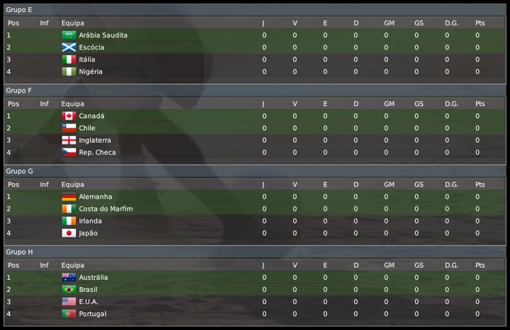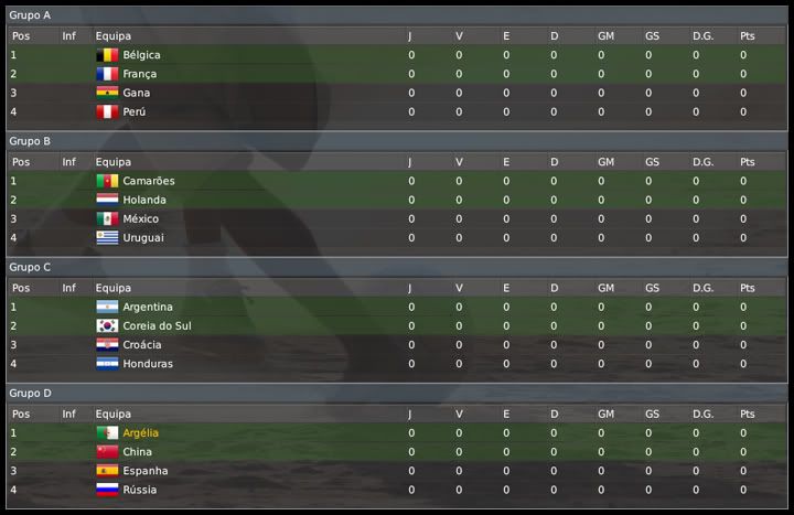 Bruno Trink Postado 28 de Março 2009 Autor Denunciar Postado 28 de Março 2009 eu disse que a vaga pá champions esta mais que garantida Tem muito jogo pela frente ainda... 31.01.2014 O ano de 2014 não começou bem mesmo. Com a Argélia, disputamos a fase de classificação da Taça das Nações Africanas no grupo A com República do Congo, Egito e Nigéria. Estreamos contra a seleção congolesa do goleiro Gérard Bokuma, treinado por mim no Hyde. Ele não teve muito trabalho, uma vez que a maioria dos nossos chutes não tinham a direção do gol. Ghezzal marcou o gol único da nossa vitória. Contra o Egito, conseguiríamos a classificação antecipada se vencêssemos. Não jogamos tão mal como na estréia, mas a defesa (reserva, por causa das contusões de Halliche e Yahia) vacilou e Hossam Ghaly abriu o placar para os egípcios. Uma bronca básica no vestiário e o time entrou mais ligado. Virou o jogo em quatro minutos, com Ghezzal e Ziani, mas dormiu novamente. Mesmo com Ghaly se arrastando em campo nos dez minutos finais, com uma contusão, os egípcios conseguiram empatar a partida. Precisaríamos do empate contra a já classificada Nigéria para não depender do resultado de Egito e República do Congo. Mas logo aos 30 segundos, Uche cruzou da direita e Obinna marcou. Menos mal que, na outra partida, Joël Sami também fez para os congoleses logo no começo da partida. A Nigéria continuou melhor depois do gol, mas fomos nós quem empatamos, com Ghilas. Oito minutos depois, Bougherra fez pênalti em Obodo, que Chinedu Obasi converteu. Logo no comecinho do segundo tempo, Laurent Agouazi empatou com um golaço de fora da área. Mas não deu nem pra comemorar, já que Obasi completou de primeira um cruzamento de Taye Taiwo e fez o terceiro. Os nigerianos perderam ainda vários gols antes do final da partida. Sorte nossa que o Egito perdeu por 3 a 1 e acabamos nos classificando para as quartas de finais, quando enfrentaremos a forte seleção camaronesa. Em Gladbach, os problemas são ainda maiores. Como o elenco está um pouco inchado, acabou acontecendo o que eu previa, problemas internos. O mais incomodado era o meia Luís Ricardo, que eu tratava como uma jóia. Vários grandes vieram atrás dele e eu recusei todas as propostas. O garoto ficou chateado e, no final, preferi emprestá-lo para o Atlético de Madrid para evitar mais confusão. Mesmo assim, o clima ainda não está bom no Borussia-Park. Alguns jogadores, fora dos nossos planos, foram negociados e deixam o Gladbach ao fim da temporada. Mais alguns jovens chegaram, sempre na nossa idéia de montar um elenco forte para os próximos anos. São eles os meias ofensivos sulamericanos Miguel Angel Vaca e Antonio Luis Ramos e os atacantes Emin Öz e Christian Weber, Nosso primeiro jogo no ano foi pela 3ª Fase Eliminatória da DFB_Pokal. Jogo duro, violento até, o 0 a 0 se manteve até o final. Vários jogadores saíram contundidos e Carlos Alberto, com um estiramento dos ligamentos do joelho, ficará mais de um mês fora. Na decisão por pênaltis, o Leverkusen errou menos e passou para a próxima fase. Antes de finalizar, o sorteio dos grupos da Copa do Mundo foi realizado no mês passado. Caímos no grupo D, junto com China, Espanha Rússia. Difícil, mas brigaremos com todas as forças pela segunda vaga. Grupos A - D Grupos E - H Citar