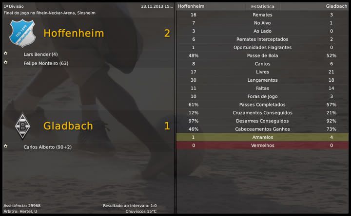 Bruno Trink Postado 27 de Março 2009 Autor Denunciar Postado 27 de Março 2009 GRANDE CAMPANHA!!!! ARGÉLIA FOOODA! Na Alemanha as coisas vão normalmente, dá pra melhorar!! COPA AI VAMOS NÓS. Tudo dentro dos conformes. Ou melhor... ;) 23.11.2013 O sonho da Copa do Mundo continua para 32 países. Ontem, a última seleção classificada foi conhecida. Honduras surpreendeu e bateu a Colômbia na repescagem. Por falar em surpresas, tivemos poucas nessas eliminatórias. Os sete campeões do mundo estarão lá, Portugal, Espanha, Holanda, as sempre fortes seleções africanas. Talvez nós possamos ser considerados supresas, o Peru nas eliminatórias sulamericanas, Irlanda do Norte e Escócia também. Enfim, tem tudo para ser uma das melhores Copas da história e estaremos no Brasil. Surpresa mesmo para muitos é a campanha do Gladbach na Bundesliga. Até hoje, antes da derrota para o Hoffenheim, estávamos invictos há nove jogos. Estamos na vice-liderança do campeonato, atrás apenas do Werder Bremen, temos o 2º melhor ataque e a 3ª melhor defesa. O Gladbach está começando a ser chamado pela imprensa alemã de "time da virada". Foi assim que conseguimos três de nossas vitórias, sobre Frankfurt, Fürth e Bayer Leverkusen. Contra o Borussia Dortmund, que briga conosco lá no topo da tabela, fizemos um jogo muito disputado, brigado, com poucas oportunidades, onde só conseguimos a vitória depois da expulsão do iraniano Nekounam. Essa expulsão, inclusive, foi por uma entrada dura no Jovetic, que quebrou a perna e ficará vários meses de fora. Eu ainda sou a favor de que as punições para lances assim sejam do mesmo tempo que o agredido fica de fora... O montenegrino era o nosso vice-artilheiro, líder das assistências e fará muita falta. A renovação do elenco, que eu pensava em fazer apenas na próxima temporada, emprestando a garotada que eu trouxe para o Gladbach, acabou começando mais cedo. Dei chance para os garotos e eles aproveitaram. Milos e Marinov são titulares e já fizeram dois gols cada. Stepanek tem substituído Compper sempre que necessário e não decepcionou. Os "velhinhos", como Misimovic, já começaram a reclamar mas, comigo, jogam os melhores, independente de idade. Citar