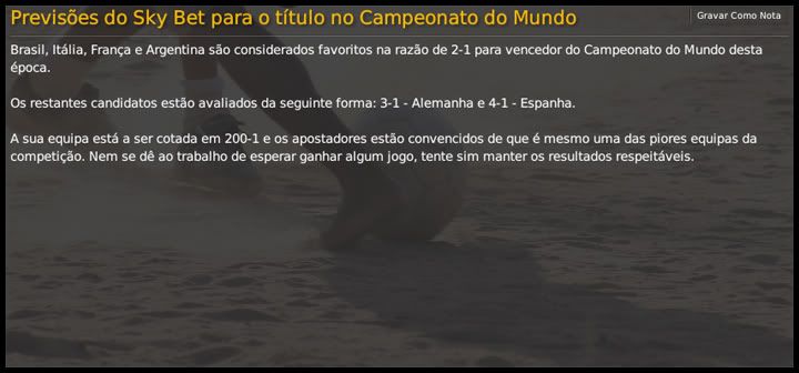 Bruno Trink Postado 31 de Março 2009 Autor Denunciar Postado 31 de Março 2009 Parabéns pelo vice. Deu uma paulada no Werder, mesmo com o time reserva deles. Legal mesmo foi depois de estar na frente, ceder o empate com um jogador a mais e nos acréscimos marcar mais duas vezes. Não acreditei quando o Naldo empatou e quase larguei o jogo pra lá. Quando Eguren fez o terceiro, segurei o grito de gol, já era mais de uma da manhã! :lol: Bela temporada, mto boa msm! E foi estranho o Bayern ter feito essa campanha ruim, eles perderam mtos jogadores bons? Eu não prestei muita atenção na campanha deles, mas sei que tinham uns veteranos (Ballack, Klose, Lahm, que nem é tão velho) e eles pegaram um garoto que eu estava querendo no início da temporada e o Welliton (ex-Goiás) na janela de inverno. Não sei o que houve, posso ver depois pra você... Que venha a Copa. Dent surpreenderá a todos novamente? Não sabemos mas torço por isso. Acho difícil demais surpreender alguém com essa seleção da Argélia... :heh: 2º lugar mais que merecido! A imagem do melhores do campeonato não está aparecendo. :( Força na Copa! Valeu, Pedro! Já acertei a imagem... 08.06.2014 Uma Copa do Mundo é o objetivo máximo de todos que trabalham com futebol, jogadores e treinadores. A 20ª edição, no Brasil, começou nessa última sexta-feira, no Maracanã, com a vitória da França, atual campeã, sobre a Bélgica por 2 a 1. A Argélia estréia logo mais contra a Rússia, no Castelão, em Fortaleza. De acordo com a agência Sky Bet, os favoritos para a conquista da Copa são Brasil, Itália, França e Argentina, com Alemanha e Espanha correndo por fora. A convocação não fugiu muito dos jogadores que eu vinha chamando. Alguns dos garotos que eu testei nos amistosos contra Bósnia e Coreia do Norte, Walid Derrardja, Aymen Tahar e Karim Aouamri, estão na lista. Assim como estão os já veteranos em seleção Ziani, Ghilas e nosso artilheiro Ghezzal. O jogo de hoje praticamente define nossas pretensões. Se perdermos para a Rússia, dificilmente conseguiremos a classificação para a fase seguinte. Mas será uma tarefa complicada bater Zhirkov, Pogrebniak, Akinfeev e cia. O time já está escalado: Ali Benamara; Saad Ichalène, Rafik Halliche, Anthar Yahia e Walid Cherfa; Mehdi Lacen, Laurent Agouazi, Kamel Ghilas, Karim Ziani e Nadir Belhadj; Abdelkader Ghezzal. Citar