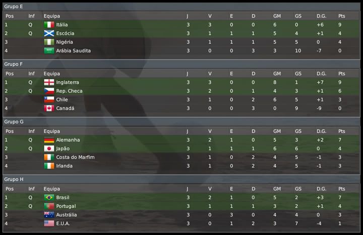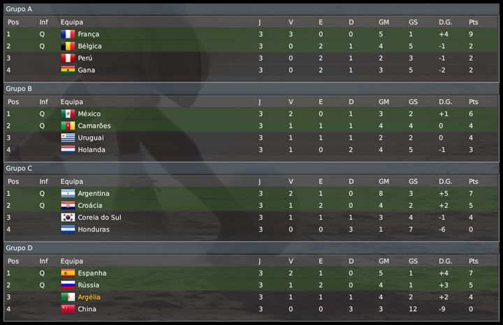 Bruno Trink Postado 1 de Abril 2009 Autor Denunciar Postado 1 de Abril 2009 Deve ter feito uma linha de impedimento sensacional.... eh arriscado mas contra seleções bem ofensivas como eh a espanha, mtas vezes dah certo, eh uma pena que o poder de fogo da sua seleção seja um pouco baixo! Agora eh ganhar da China e torcer pela espanha e se classificar!!!! Não tinha outra coisa a fazer, tinha que arriscar para tentar alguma coisa. você fica em terceiro vala com a Argélia naum e mal você pá passar tem de ser muitos golos e e se a russia não empatar faça o que lhe ensinaram estes anos todos de carreira !!!!!!!! ^_^ Fizemos a nossa parte... 13.06.2014 Melhores Momentos: 2': Cherfa vai ao fundo, cruza e Ghezzal cabeceia por cima. 10': Ghilas ganha do lateral, cruza na cabeça de Ghezzal mas Fan Minghao defende. 10': Xie Minghui dá um chutão para a frente, Zhang Chengjun domina, abre e bate, mas Benamara defende. 14': Ghilas recebe de Ichalène, vai ao fundo e cruza para trás. Ghezzal domina e chuta na trave. A bola bate nas costas do goleiro e sai para escanteio. Na cobrança, Yahia cabeceia no cantinho, mas a zaga tira. 24': Tang Qingdond lança Zhang Chengjun na esquerda. O atacante avança e cruza para Wang Xiao que toca de primeira. GOL DA CHINA! 40': Belhadj cobra escanteio da esquerda, Ghezzal sobe mais alto que Qing Yongqiang e marca. GOL DA ARGÉLIA! 50': Ghilas toca para Ziani que acha Ghezzal. O chute de esquerda do atacante passa perto, à esquerda do gol. 53': Agouazi rebate a bola de cabeça, Ghezzal recebe avança e bate de esquerda. A bola sai perto. 55': Ichalène passa para Agouazi que bate de longe, no canto, mas Minghao defende. 60': Ichalène cruza da direita, Lacen disputa com Yang Xia e a bola sobra para Ghezzal que bate para fora. Ziani pediu pênalti no lance com Lacen. 61': De novo, Ghilas para Ziani que enfia para Ghezzal. O chute do atacante vai por cima do gol. 64': Ghilas cobra escanteio, Ghezzal, de novo, sobe mais que a zaga chinesa e faz. GOL DA ARGÉLIA! 69': Ziani briga, ganha a bola de Zhang Miao, avança e chuta por cima do gol. 79': Outro escanteio pela direita, mais uma vez na cabeça de Ghezzal. Dessa vez a bola explode no travessão mas sobra para Yahia, livre, colocar no fundo do gol. GOL DA ARGÉLIA! 88': Depois da bola passar pelos pés de todos os argelinos, da esquerda para a direita, Ichalène rolou para Ghilas avançar e cruzar no 2º pau. Ghezzal, livre, cabeceou e guardou. GOL DA ARGÉLIA! Fizemos a nossa parte, goleamos a China e igualamos o saldo russo. Mas, no outro jogo, Akinfeev fechou o gol e garantiu o 0 a 0. Assim, terminamos em 3º e voltamos para casa. Uma participação digna, surpreendente até. Fica para a próxima... Resultados da 3ª rodada: Grupo A França (Nasri, Flamini) 2 x 0 Gana Bélgica (Vanden Borre) 1 x 1 Peru (Hidalgo) Grupo B Camarões (Makoun, Mbia, Eto'o) 3 x 2 Holanda (Huntelaar, Babel) Uruguai 0 x 1 México (Pineda) Grupo C Coreia do Sul (Kim Young-Hoo-2) 2 x 1 Honduras (Reyna) Croácia (Kalinic, Srna) 2 x 2 Argentina (Tevez, Agüero) Grupo D China (Wang Xiao) 1 x 4 Argélia (Ghezzal-3, Yahia) Espanha 0 x 0 Rússia Grupo E Itália (Pazzini, Foti) 2 x 0 Escócia Nigéria (Uche, Martins-2, Odiah) 4 x 2 Arábia Saudita (Al-Qahtani, Abdulla) Grupo F Chile (Alexis Sánchez) 1 x 3 Inglaterra (Walcott, Rooney, Vaughan) Rep. Checa (Kadlec, Simunek) 2 x 0 Canadá Grupo G Alemanha (Anders-2) 2 x 1 Irlanda (Doyle) Costa do Marfim (Touré, Drogba) 2 x 3 Japão (Maeda, Kawamata, Kobayashi) Grupo H Brasil (Kaká) 1 x 1 Austrália (Roberts) Portugal (Cristiano Ronaldo, Pepe) 2 x 0 E.U.A. Com esses resultados, a classificação dos grupos ficou a seguinte: Grupos A - D Grupos E - H Os confrontos das oitavas de finais são: França x Camarões México x Bélgica Rússia x Argentina Espanha x Croácia Itália x Rep. Checa Escócia x Inglaterra Portugal x Alemanha Brasil x Japão Citar