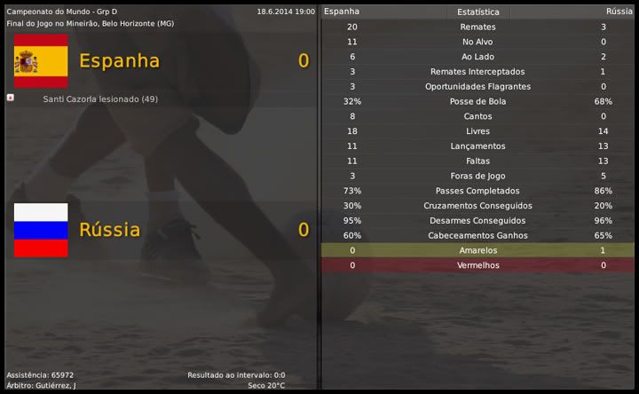 Bruno Trink Postado 1 de Abril 2009 Autor Denunciar Postado 1 de Abril 2009 13.06.2014 Melhores Momentos: 2': Tahar entrega de primeira para Djebbour que bate longe, pro alto. 9': Mostefa cobra lateral para Djebbour. O atacante avança, rola para trás para Kadir que chuta. A bola vai no travessão e sai. 28': Piqué enfia bola para Jesús Navas que chuta por cima do gol. 30': Torres passa por Ferradj mas adianta demais e Benamara sai do gol. 32': Iniesta passa para Torres que chuta de fora no meio do gol. 37': Torres toca na direita para Jesús Navas que vai ao fundo e cruza. Fábregas escora de cabeça para Torres, mas Iniesta se antecipa e marca. GOL DA ESPANHA! 40': Novamente Torres abre na direita para Navas que rola no meio. Iniesta bate no canto mas a bola vai na trave. 40': No contra-ataque, Kadir enfia para Djebbour mas ele chuta para fora. 40': Mais uma vez, a Espanha pela direita. Navas rola para Iniesta que acerta a outra trave. 45'+3: Sergio Ramos divide com Tayar e tem que sair com uma ruptura no tornozelo. Alexis entra em seu lugar. 68': Torres se contunde em uma dividida com Réda Johnson e sofre a mesma lesão de Ramos. Villa vem pro jogo. 71': Silva cobra falta lateral na cabeça de Pablo, mas a bola bate na rede pelo lado de fora. 76': Depois de confusão na frente da área argelina, Alexis cruza forte, no 2º pau, Silva se estica e Benamara defende, mas o meia já estava impedido. 78': Silva sai com uma micro-ruptura na virilha e é substituído por Antonio López. 86': De la Red toca para Fábregas que gira e bate por cima do gol. Essa era uma partida em que a derrota era quase inevitável. Por isso, surpreendi e arrisquei. Escalei uma equipe quase toda com reservas, para poupar os titulares para o jogo contra a China. Dei sorte. A Rússia venceu e precisa apenas de um empate com a Espanha na última rodada. Resultados da 2ª rodada: Grupo A Gana (Pocognoli-c, Muntari) 2 x 2 Bélgica (Mirallas, Defour) França (Benzema) 1 x 0 Peru Grupo B Uruguai (Fornaroli-2) 2 x 1 Holanda (Sneijder) México (Vela-2) 2 x 1 Camarões (Makoun) Grupo C Honduras 0 x 2 Croácia (Modric, Skolnik) Argentina 3 (Messi, Tevez, Lisandro López) x 1 Coreia do Sul (Lima) Grupo D Argélia 0 x 1 Espanha (Iniesta) Rússia (Zhirkov, Sychev, Pogrebnyak, Bystrov) 4 x 1 China (Wang Xiao) Grupo E Arábia Saudita 0 x 2 Itália (Giovinco, Rossi) Escócia (Fletcher) 1 x 1 Nigéria (Uche) Grupo F Canadá 0 x 4 Chile (Brito-3, Alexis Sánchez) Inglaterra (Rooney, Owen) 2 x 0 Rep. Checa Grupo G Irlanda 0 x 1 Costa do Marfim (Eboué) Japão (Ishizaki) 1 x 1 Alemanha (Noll) Grupo H Austrália (Cahill) 1 x 1 Portugal (Hugo Almeida) E.U.A. (Channell) 1 x 3 Brasil (Anderson, Marquinhos, Hernandes) Citar