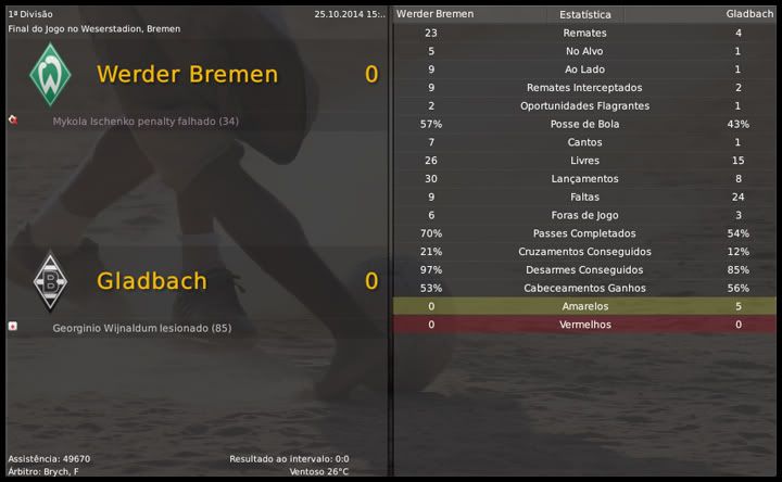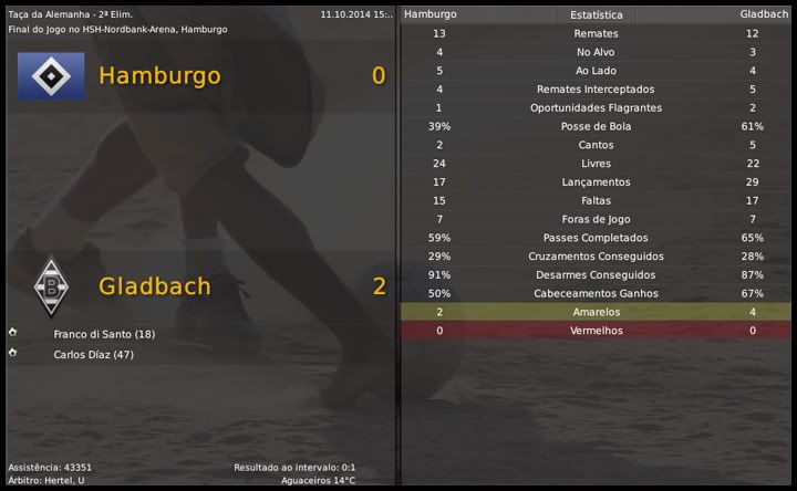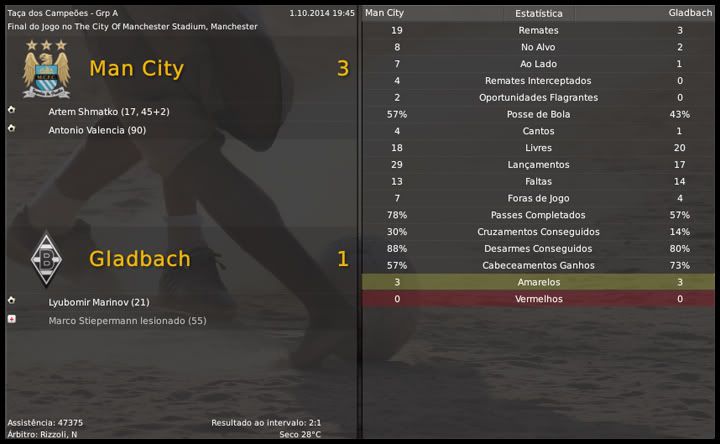 Bruno Trink Postado 4 de Abril 2009 Autor Denunciar Postado 4 de Abril 2009 Nossa, é um grupo daqueles, pelo menso o PSV acho que conseggue vencer, sem contar que pode aprontar contra os outros, no Fm tudo é possível, e o treinador tem estrela Tudo é possível mas, que é difícil, não dá pra negar... Não achei o grupo tão complicado assim, da pra buscar essa segunda vaga! Dá pra buscar, mas claro que é complicado! Grupo difícil, sem dúvida, mas acho que dá pra passar por PSV e City, e quem sabe, buscar essa segunda vaga. Ou a terceira... hehe :specool: Só o TKD que achou facil! :heh: 21.09.2014 A liderança da Bundesliga voltou às nossas mãos, depois da vitória sobre o Bayern no Borussia-Park. O jogo não foi nada fácil, muito pelo contrário. O primeiro tempo foi duro, nos dois sentidos. Algumas chances, duas bolas na trave, uma para cada lado, e quatro cartões amarelos, três para o Bayern. Logo na volta dos vestiários, Breno recebeu seu segundo e deixou os bávaros com 10. Mas nem assim, nós conseguimos mandar no jogo. Mudei o time, tirei um dos volantes e coloquei Stiepermann, mais um atacante. Fomos recompensados com o gol de Milos, que nos reconduziu ao 1º lugar.. A surpresa do campeonato nesse início é o campeão Werder Bremen. Às voltas com as lesões de Thiago Neves, Diego, Husejinovic e Michael Wilke, o time ainda não conseguiu vencer e está rondando a zona do rebaixamento. Mas, na minha opinião, é questão de tempo para se recuperar. A estréia na UEFA Champions League foi muito boa. O Borussia-Park estava praticamente lotado e viu uma vitória que foi facilitada por outra expulsão. Milos tinha aberto o placar e, no início da 2ª etapa, Jon Goossens foi expulso direto por uma carrinho por trás. Eguren, num belo chute de efeito, ampliou e apenas administramos até o final do jogo. Na outra partida, a Juventus venceu o City por 2 a 1, gols do Dentinho e do zagueiro Felipe, contra um gol da nova sensação bielorussa, o atacante Artem Shmatko. Por falar em sensação, a imprensa ficou surpresa com o investimento que eu resolvi fazer ao contratar o uruguaio Carlos Diáz. Foi a maior transferência da história do clube, pagamos ao Vasco €4M, mais 24 parcelas de €550m. É um investimento que eu espero que se transforme em gols. Citar