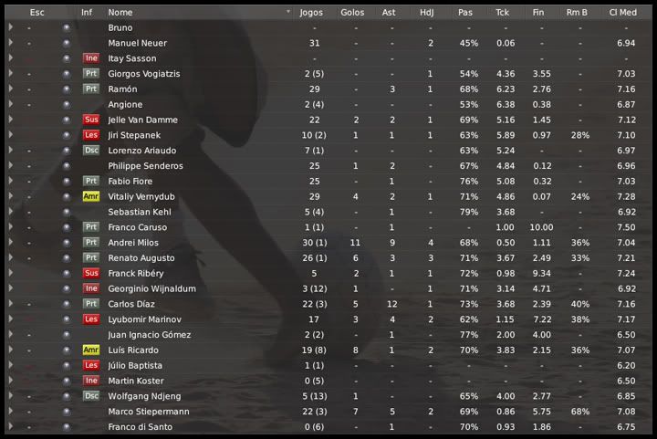 Bruno Trink Postado 29 de Abril 2009 Autor Denunciar Postado 29 de Abril 2009 Vo t fala que eu tb sofri um gol nos ultimos minutos contra o Man Utd no meu save, mesmo depois de estar ganhando de 2 a 0, mas dai no jogo da volta consegui empatar fora de casa e me classifiquei! Espero que consigo aconteça a mesma coisa, e realmente incrivel esta parada de inverno, a equipe voltou voando, como confirmaram as vitorias até agora. Boa sorte no jogo da volta.! Até voando a gente tropeça! :heh: 13.03.2016 Em uma competição de alto nível, é praticamente impossível se manter no topo o tempo todo. Tropeços sempre acontecem e, nessas duas últimas semanas, nós abusamos de tropeçar. O primeiro aconteceu no Allianz-Arena, contra um dos nossos rivais diretos na Bundesliga. A partida tinha tudo para ser equilibrada, até começou dessa forma, mas Jelle Van Damme fez o favor de ser expulso aos 17 minutos de jogo. Recompus a defesa, mas fiquei sem saída de bola. Mesmo assim, o Bayern não nos ameaçou no primeiro tempo, que terminou logo depois da séria contusão do Carlos Díaz. Na volta do vestiário, como era de se esperar, pressão dos bávaros, mas nos seguramos bem. Até que dois lances decidiram a partida. Aos 43, Vernydub sentiu um problema na coxa. Dois minutos depois, Holtby cruzou, Loïc Rémy fugiu da marcação do ucraniano e, cara a cara com Neuer, decidiu a parada. Lá fomos nós para Bremen jogar as quartas de final da DFB-Pokal. Aproveitando as várias contusões, a proximidade entre as partidas e a pouca importância dada por mim a essa taça, entramos com um time quase inteiro de reservas. Tivemos uma chance apenas aos 8 minutos, a primeira do jogo, e só. Daí para frente o que se viu foi uma pressão absurda do Werder e um show do recém-contratado Bruno. Tudo que ia para o nosso gol, e não foi pouca coisa, Bruno pegava. A partida foi para a prorrogação e o gol só foi sair aos 7 minutos do primeiro tempo. O Werder já estava jogando com quatro atacantes, pressionando demais e Michael Wilke, artilheiro da Alemanha na temporada, marcou o único gol do jogo. Voltamos para Mönchengladbach para enfrentar o Eintracht Frankfurt. Jogo na nossa casa, obrigação de vencer. Logo aos 5 minutos, Ribéry sentiu uma contusão e já comecei a prever outro tropeço. Mas aos 10, Andrei Milos deu fim a um jejum de gols e abriu a partida. Ribéry saiu para a entrada do Stiepermann e o time continuou em cima, obrigando várias boas defesas de Rémy Riou. Acontece que, no finalzinho da primeira etapa, Marinov deu uma entrada no lateral Volodymyr Polyovyi e foi justamente expulso. Mais uma expulsão atrapalhando nossos planos. Perdemos a saída pelos lados do campo e o Frankfurt voltou dos vestiários em cima de nós. Até que aos 13 minutos, Ramón fez penalti em Hovland. Hassan Yebda bateu e empatou. O rubro-negro pareceu se contentar com o empate e recuou. Mesmo com um a menos, tivemos algumas chances de marcar o 2º gol, mas eles se seguraram e tropeçamos mais uma vez. Sorte nossa que o Bayern também empatou nessa rodada e a nossa distância para eles continua em dois pontos. Na quarta-feira, temos o jogo de volta contra a Inter, em Milão. Com as várias lesões, estou com poucas opções, ainda vou pensar como escalar a equipe. Espero não tropeçar mais uma vez... Citar