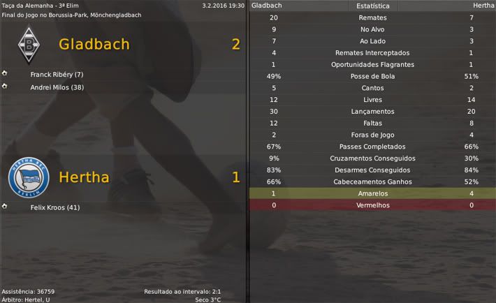 Bruno Trink Postado 28 de Abril 2009 Autor Denunciar Postado 28 de Abril 2009 A intra-temporada deu resultado, e o Gladbach vai embalado. Gostei do Stiepermann. Ainda mais que ele é real. Ele é bom mesmo e está quebrando vários galhos... A seqüencia foi boa. Acho que os jogos contra os líderes é que vão decidir. Que venha a Inter mesmo com o Borussia com alguns desfalques importantes. Teremos que nos superar... 01.03.2016 O primeiro passo foi dado. Poderia ter sido um passo mais largo, se não fosse o gol de Salvatore Foti aos 42 minutos do 2º tempo. Mas a vitória por 2 a 1 sobre a Inter em casa nos deixa em uma situação de precisar apenas de um empate no Giuseppe Meazza daqui a duas semanas. Sem Marinov e Ribéry, optei mesmo pelo esquema com três zagueiros para bater com os dois atacantes rápidos interistas, Keirrison e Foti. Mesmo em casa, preferi jogar fechado e sair nos contra-ataques, como já é hábito da nossa equipe. Assim, a Inter até tinha um pouco mais a posse da bola, mas não ameaçava o gol de Neuer. Aos 13 minutos, o primeiro contragolpe funcionou. Milos tocou para Ramón que lançou para Stiepermann. Ele ganhou na velocidade do lento Alessandro Gamberini e bateu no canto do Júlio César. Pouco depois, novo contra-ataque pela esquerda com Stiepermann e Davide Santon o derrubou no lado da área. Díaz cobrou na cabeça de Ariaudo que testou no canto. A bola ainda bateu na trave antes de entrar, mas o árbitro viu uma falta do nosso zagueiro e invalidou o gol. Eles sentiram e nós passamos a mandar na partida. Júlio César defendeu um chute à queima-roupa do Díaz, Milos e Fiore mandaram para fora chutes de fora da área. O mesmo Fabio Fiore, aos 7 minutos da 2ª etapa, acabou acertando outro chute de fora e ampliou o placar. Com a vantagem, o time recuou um pouco. Renato Augusto já tinha deixado o campo no 1º tempo com um incômodo na coxa, o espanhol Marcelino lançou Ricardo Quaresma no lugar de Santon e colocou seu time mais ao ataque. Mesmo assim, a Inter não parecia que conseguiria reagir. Mas aos 42 minutos, a dupla de ataque deles funcionou num vacilo da nossa defesa. Gökhan Inler lançou Keirrison no meio dos nossos zagueiros, Neuer fez um milagre, mas Foti diminuiu no rebote. A vitória foi ótima, mas pelas circunstâncias poderia ter sido melhor. Esse gol no final pode fazer a diferença, já que uma vitória simples dá a classificação para a Inter. Antes do jogo de volta, temos três jogos dificílimos: Bayern, no Allianz-Arena, Werder, pela DFB-Pokal, no Weserstadion, e Eintracht Frankfurt. Nem posso me dar ao luxo de poupar titulares nesses jogos. Citar