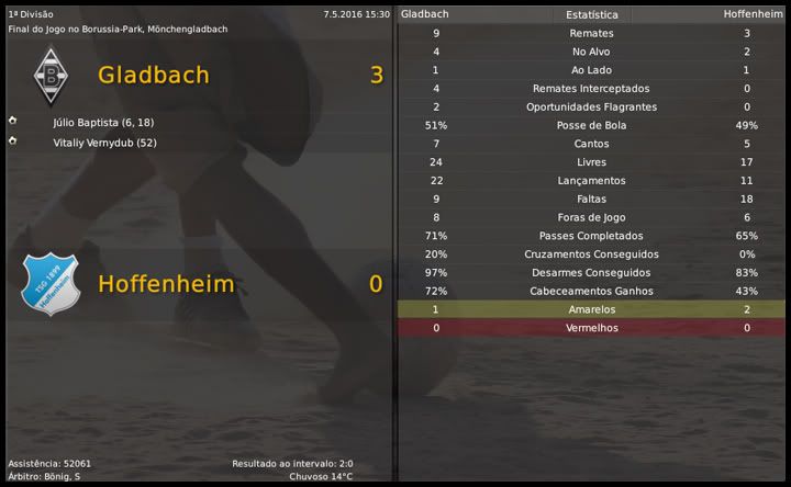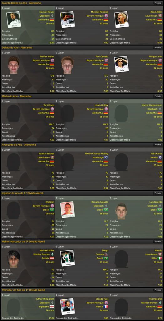 Bruno Trink Postado 7 de Maio 2009 Autor Denunciar Postado 7 de Maio 2009 dolorido mesmo... lutou bastante.. acho q o fato de vc nao ter feito nenhum gol fora acabou complicando... ao menos no alemao conseguiu distanciar do bayern.. e o titulo esta mto proximo! Complicou mesmo. Pelo menos, temos a Bundesliga para consolar... 07.06.2016 Com o empate do Bayern na antepenúltima rodada, o título era questão de tempo. Ainda um pouco abatidos pela eliminação na Champions, fomos enfrentar o Hamburgo na HSH-Nordbank-Arena. Mutombo, ex-jogador do Gladbach, abriu o placar aos 15 minutos, mas Luís Ricardo e Milos viraram para 2 a 1 ainda no primeiro tempo. No intervalo, o Bayern estava perdendo para o Hertha por 1 a 0, mas conseguiu o empate no início da 2ª etapa. Nos acréscimos, Thomas Rosicky empatou de falta, mas, com o resultado em Berlim, conquistamos o título com uma rodada de antecipação. No último jogo, apenas para cumprir tabela, fomos a Dortmund e derrotamos os donos da casa por 1 a 0. Bayern e Werder Bremen disputarão, junto conosco, a UEFA Champions League 2016/17, enquanto Leverkusen, Dortmund e Wolfsburgo jogarão a Europa League. Hoffenheim e Stuttgart, que por pouco não foi rebaixado, foram as grandes decepções. Posso destacar alguns jogadores do elenco nessa temporada. Alguns deles até estiveram na premiação dos melhores da Bundesliga. Os brasileiros Renato Augusto e Luís Ricardo ficaram, respectivamente, com o 2º e 3º lugares no prêmio de melhor jogador do campeonato. Manuel Neuer foi o melhor goleiro, um paredão. O ucraniano Vitaliy Vernydub, que não ganhou prêmios mas está na seleção da Bundesliga, foi, mais uma vez, o grande xerife da nossa defesa. Os campeões nas ligas mais importantes foram: Alemanha: Gladbach (Bayern Munique) Escócia: Dundee Utd (Hearts) Espanha: Atletico Madrid (Real Madrid) * Atletico, Real e Barcelona empataram com 85 pontos França: Lyon (Olymipque de Marseille) Grécia: Asteras Tr. (Panathinaikos) Holanda: PSV (Ajax) Inglaterra: Liverpool (Arsenal) Itália: Juventus (Lazio) Portugal: Porto (Benfica) Ucrânia: Shakhtar (Dinamo Kiev) Meu contrato com o Gladbach se encerra no final da próxima temporada. Não tenho planos de sair desse clube que eu aprendi a gostar, principalmente porque ainda pretendo levá-lo a um título continental. Mas nunca se sabe o que o futuro nos reserva... Citar