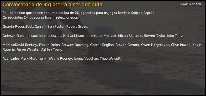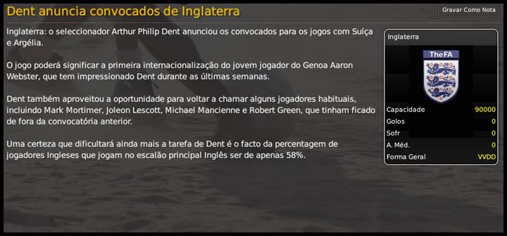 Bruno Trink Postado 10 de Maio 2009 Autor Denunciar Postado 10 de Maio 2009 Acho q este ano vai ser o ano do Borussia. Tem tudo pra fazer bonito na UCL, e os jogadores promessas já estão mais expeientes e entrosados. Os reforços parecem bons também. Boa sorte nessa temporada que vem por aí! (sem contar é claro q vai ser muito interessante ver vc dividindo tempo com o English team XD) Espero que você tenha razão, cansei de sair nas semi da Champions! E acho que vai ser tranquilo dividir meu tempo, já que o English Team não precisará disputar as Eliminatórias para a Copa, só faremos amistosos. 14.09.2016 Não poderia ter sido melhor meu início no English Team. Dois jogos em Wembley, duas vitórias incontestáveis. A convocação, no geral, não teve muitas surpresas, mas, pensando em renovação, chamei o volante do Genoa Aaron Webster. Ainda convoquei alguns jogadores que não vinham sendo chamados por Paul Ince, mas as estrelas estavam na lista. A estréia foi contra a Suíça, do treinador Lucien Favre, no sábado. Escalei o que, no momento, é o time que eu penso como titular. Com Gerrard como cérebro da equipe e jogando muito pelos lados com David Bentley e Ashley Young, era essa a maneira que eu usei para tentar abrir a defesa suíça. Gerrard, por duas vezes, bateu de fora, uma delas acertou o travessão de Diego Benaglio. Aos 15 minutos, Gerrard abriu na direita para Bentley que cruzou na área. Walcott subiu mais que Liechsteiner e marcou. Aos 28, escanteio cobrado por Bentley e Micah Richards foi mais alto que todo mundo para ampliar para 2 a 0. Rooney não estava com sua pontaria calibrada e desperdiçou duas chances com chutes para fora. No início do 2º tempo, o atacante do Manchester United dividiu uma bola com Djorou e saiu machucado. James Vaughan entrou no seu lugar e, aos 21 minutos, completou um cruzamento de Joe Mattock da esquerda, em mais um gol de cabeça. Mexi bastante no time, fazendo experiências, o nível caiu um pouco e o placar terminou mesmo em 3 a 0. O segundo jogo foi contra um velho conhecido meu, a seleção da Argélia. Sem Rooney, Vaughan entrou normalmente no seu lugar e eu dei chances para o goleiro Scott Carson, para o zagueiro Steven Taylor, do City e para o meia Stewart Downing. O time demorou um pouco a engrenar, e Walcott era o nosso atacante mais perigoso. O primeiro gol saiu apenas aos 31 minutos e foi do atacante do Arsenal, de cabeça, depois de um cruzamento de Glen Johnson da direita. Sempre pelas pontas, assim saiu o 2º gol. Downing cruzou rasteiro da esquerda e James Vaughan completou. No início da 2ª etapa, depois de uma bela troca de passes no meio de campo, Steven Gerrard bateu forte da entrada da área e fez o terceiro. Mais uma vez, mexi bastante na equipe e, mesmo assim, os jogadores mostraram que estão começando a assimilar o estilo de toque de bola rápido que eu tento impor nos meus times. Depois de uma troca de passes em que a bola passou por quase todos os jogadores do time, James Vaughan completou para as redes. Nada de importante aconteceu até o final da partida e o placar de 4 a o disse o que foi o jogo. Fiquei bastante satisfeito com o que vi e acredito que poderei fazer um bom trabalho na frente do English Team. Voltamos a jogar apenas no ano que vem, uma pedreira contra a Itália. Poderei agora voltar minha concentração para o Gladbach, feliz depois dessa estréia na seleção inglesa. Citar
