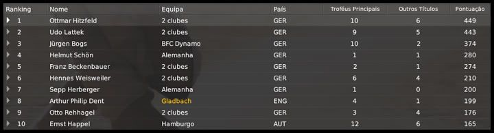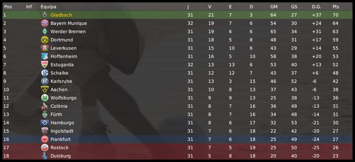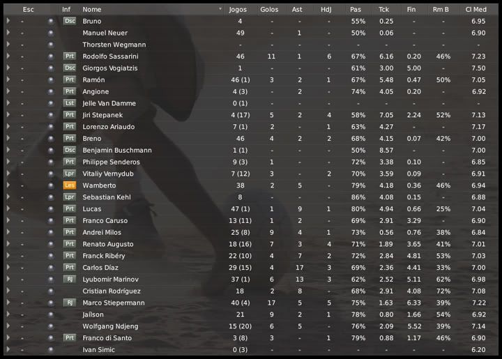 Bruno Trink Postado 21 de Maio 2009 Autor Denunciar Postado 21 de Maio 2009 Posta aí uma screen do time do Atlético. Que curioso jogar a final no Bernabéu. Estou sem o jogo aqui, mas só para você ter uma idéia, a escalação para a final deve ser: Asenjo; Heitinga, Chatzis (newgen), Rafhael (ex-Gladbach) e Esteve (newgen); Gabriel Obertan, Philippe Coutinho, Rafael Carioca e Clive Powell (newgen); Bojan e Agüero. E ainda tem Denis Alibec, Gökhan Inler, João Moutinho, Neri Cardozo... É um timão, principalmente os titulares. 20.05.2017 O tricampeonato na Bundesliga era questão de tempo. Para ser mais exato, questão de um ponto, com mais três partidas restando. Poderia ter acontecido na BayArena, em Leverkusen, na repetição do confronto da final da DFB-Pokal. Não sei o que houve, se foi a difícil classificação para a final da Champions, se foi a proximidade do título. Sei que o foco da equipe não estava ali no campo. Não fizemos um mau jogo, é verdade, mas o Leverkusen foi um pouco mais eficiente e marcou na única real chance de gol do jogo inteiro. Patrick Helmes veio do banco e adiou nosso título. Quis o destino que ele fosse conquistado na nossa casa, onde fomos quase imbatíveis. A única derrota do time no Borussia-Park foi contra o Real, mas foi uma derrota com sabor de vitória pela classificação. Nosso adversário era o Hansa Rostock, lutando contra o rebaixamento, num jogo isolado, adiado por causa da final da DFB-Pokal. Todos os olhos da Alemanha estavam em Mönchengladbach. O time foi avassalador, um verdadeiro rolo compressor. Atropelamos o Rostock. Com pouco mais da metade da 1ª etapa, o placar já marcava 4 a 0. Não tinha mais o que fazer, só esperar o tempo passar e comemorar mais um título. Na última rodada, jogo de entrega das faixas. O Schalke 04 já não buscava mais nada, estava fora da briga por vagas nas competições européias. Optei por escalar um time quase titular, a final da Champions é somente daqui a uma semana. Precisava manter a equipe com ritmo. A exemplo da partida anterior, nosso início foi excelente. Ariaudo abriu o placar, de cabeça, aos 8 minutos. O argentino Franco Caruso ampliou, aos 28, com um belo chute cruzado e Jaílson, quase no final, fez 3 a 0. Marinov fez o quarto, um golaço num remate cruzado, de muito longe, no ângulo. O Schalke ainda diminuiu, mas nada que manchasse nossa vitória e a comemoração da torcida e do time. Uma conquista indiscutível. Começamos muito bem o campeonato, tivemos um período de desequilíbrio no final da primeira metade, mas nos recuperamos depois da parada de inverno e disparamos para o título. Bayern e Werder Bremen ficaram sempre a uma distância considerável de nós. A decepção ficou pelo rebaixamento do tradicional Eintracht Frankfurt. Citar