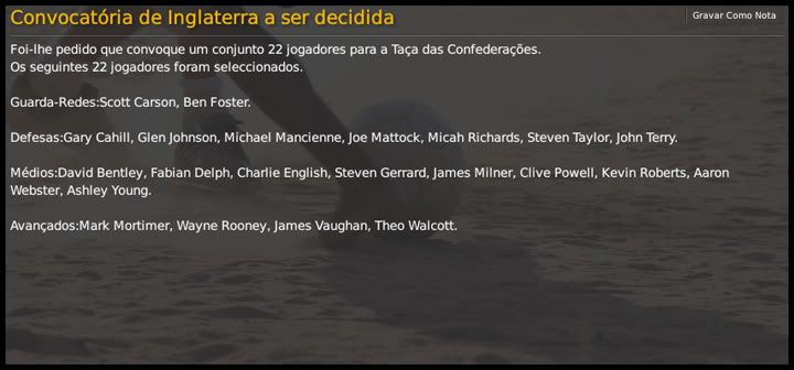Bruno Trink Postado 22 de Maio 2009 Autor Denunciar Postado 22 de Maio 2009 15.06.2016 Hoje fizemos a convocação do English Team para a Copa das Confederações. Sem surpresas e sem lesões importantes, chamei o que nós tínhamos de melhor. Ontem, o último amistoso antes da competição. Enfrentamos a Nigéria, em Wembley, e vencemos por 2 a 1. No primeiro tempo, o time que considero ideal: Scott Carson; Glen Johnson, Micah Richards, John Terry e Joe Mattock; David Bentley, Kevin Roberts, Fabian Delph e Ashley Young; Wayne Rooney e Theo Walcott. Fizemos 2 a 0, gols de Richards e Rooney, e o time foi bem na primeira etapa. Depois do intervalo, com as alterações, o ritmo caiu um pouco e as Águias diminuiram no final. Estreamos contra a Itália e ainda temos Mali e Japão no nosos grupo. Recebi, ainda, nessa semana a notícia de que foi aprovada a construção de um novo estádio para o Gladbach. O Estádio Kamps, homenagem ao ex-jogador Uwe Kamps, agora preparador físico, terá capacidade para 71173 espectadores e deverá ficar pronto em um ano. Citar
