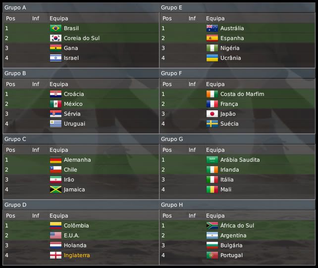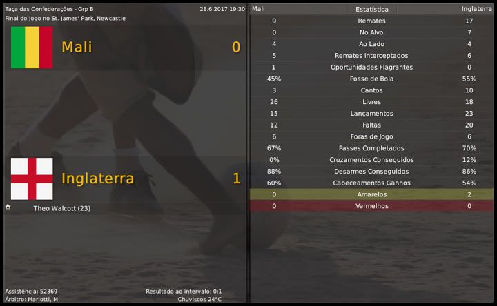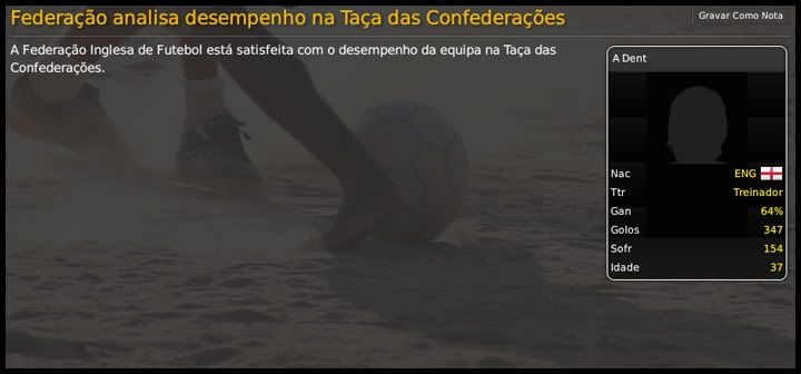 Bruno Trink Postado 23 de Maio 2009 Autor Denunciar Postado 23 de Maio 2009 05.07.2017 Não era o que eu queria, mas, dentro do possível, a campanha do English Team foi bem razoável. Perder uma final nunca é agradável. Mesmo assim, a Federação Inglesa ficou contente com nosso desempenho na Copa das Confederações. O país mostrou-se preparadíssimo para sediar a Copa do Mundo no próximo ano e isso que fica de saldo positivo. O ponto alto da nossa campanha foi, sem dúvida, a vitória sobre a seleção brasileira na semifinal. O atual campeão do mundo tinha Kaká de volta, recuperado de uma leve lesão na coxa. A primeira chance foi brasileira, mas o chute de Rafael Carioca foi para fora, raspando a trave. Nosso time estava bem arrumado em campo, explorando os contra-ataques. Terry cabeceou uma bola para fora, Bentley completou outro cruzamento também sem a direção do gol. Mas, aos 11 minutos, em jogada bem inglesa, Foster cobrou tiro de meta e Kevin Roberts desviou de cabeça. A bola veio para Rooney qua avançou e bateu de esquerda, sem chances para Renan. Cinco minutos depois, Pato marcou, mas o lance já estava parado por causa de uma falta do atacante Guilherme no Terry. Theo Walcott era nosso atacante mais perigoso, mas suas finalizações não estavam calibradas. O Brasil perdeu Daniel Alves, que teve que ser substituído por Valdomiro, lateral do Zaragoza. Logo depois, Bentley cobrou escanteio, Terry subiu muito e fez 2 a 0. O Brasil veio pra cima depois do intervalo e logo aos 6 minutos, Anderson tocou para Guilherme que chutou forte. Foster espalmou para frente e Pato aproveitou o rebote para diminuir. Nosso goleiro se redimiu, entretanto, dessa falha com duas ótimas defesas, em lances com Kaká e Guilherme. Renato Gaúcho trocou Ramires por um velho conhecido meu, Luís Ricardo. Depois ainda fez o Brasil jogar com quatro atacantes, colocando Keirrison no lugar do Kaká. Mas nada adiantou e o placar ficou assim mesmo. A final foi contra aquela seleção que está se transformando no nosso maior rival, a Itália. Quem estava em campo pela Azzurra era Sassarini, zagueiro do Gladbach, jogando na lateral esquerda. Com Giuseppe Rossi no ataque, os italianos começaram melhor e o próprio Rossi perdeu a primeira chance. A nossa primeira boa chance foi com um chute de curva de Rooney, que o goleiro italiano defendeu. O gol italiano era questão de tempo e aconteceu aos 33 minutos. Troca de bola entre Giovinco, Damonte e Rossi, o meia esquerda do Real Madrid cruzou e Giovinco completou sozinho. Podíamos ter empatado logo na saída, mas o chute de Rooney resvalou no travessão de Alfonso. Voltei do intervalo com Clive Powell no lugar de Ashley Young e deixei Rooney em campo, mesmo com a lesão sofrida no final do primeiro tempo. Walcott, com a mesma falta de pontaria da partida contra o Brasil, jogou duas chances para fora. Tentando melhorar a qualidade do ataque, coloquei Vaughan no lugar do Bentley, recuando Walcott para a meia direita. Rooney, mesmo machucado, era nosso jogador mais perigoso, mas tive que substituí-lo por Mark Mortimer aos 31 minutos. Nós pressionamos bastante, mas a Azzurra estava muito bem fechada. Nos chutes de longe, nenhum perigo. Micah Richards ainda se contundiu no finalzinho do jogo e esfriou qualquer tentativa de empate. Como eu disse, perder nunca é bom, mas mostramos que podemos brigar em pé de igualdade com as grandes seleções do planeta. Temos mais um amistoso em setembro contra a Coreia do Sul e outro contra a Lituânia em fevereiro do ano que vem. Citar