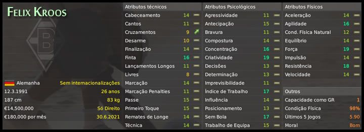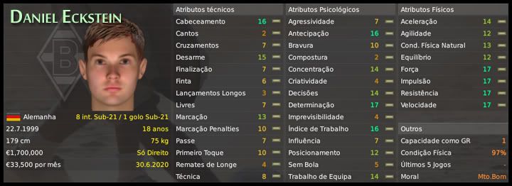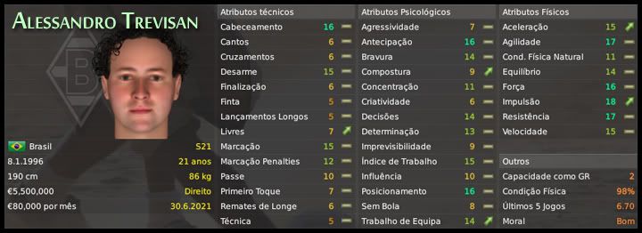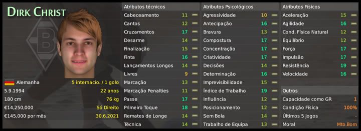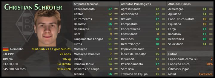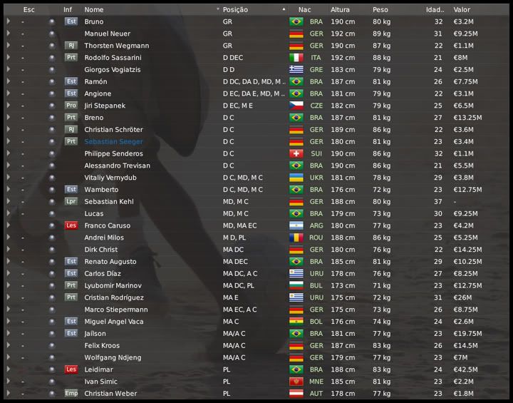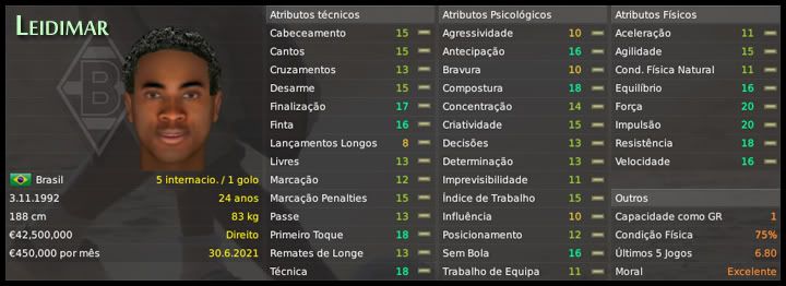 Bruno Trink Postado 25 de Maio 2009 Autor Denunciar Postado 25 de Maio 2009 er pena o estadio nao ficar com a dimensao do maracana . lol e bem a copa das naçoes desanimou esperava a vitoria Acho que 70 mil está de bom tamanho. Tinha que construir um estádio maior mesmo, a torcida estava lotando sempre o Borussia-Park. 12.08.2017 A pré-temporada foi bem mais tranquila que as últimas. Como sempre, algumas propostas para nossos jogadores, mas parece que as conquistas nos últimos anos tem mostrado a eles que o Gladbach é um clube que está se consolidando entre os grandes. Dessa forma, todos eles aceitaram bem o fato de eu não querer negociá-los. Apenas Breno ficou um pouco chateado por eu não deixá-lo ir para o Arsenal. Insatisfeito estavam alguns jogadores que tiveram poucas chances na temporada passada. Dessa forma, preferi liberá-los para que procurassem novos ares. O grande nome para a temporada é o o atacante brasileiro Leidimar. Formado nas categorias de base do Paysandu, passou por Israel e Portugal, voltou ao Brasil para jogar no Corinthians onde, finalmente estourou e foi contratado pelo Real Madrid. No clube merengue, não teve chances e acabou vendido para a Fiorentina, onde ficou duas temporadas. Antes mesmo de terminar a temporada passada, eu já tinha acertado com o zagueiro Alessandro Trevisan, jovem, mas já com capacidade para brigar por posição. Na minha nova proposta de priorizar a contratação de jogadores alemães, trouxe quatro para o clube. Os destaques são os meias Felix Kroos, irmão mais novo do craque Toni Kroos, que veio do Hertha Berlin, e Dirk Christ, meia direita do Bayer Leverkusen. Vieram ainda os jovens zagueiros Christian Schröter e Daniel Eckstein, este último ainda para o sub-19. O elenco ainda não está fechado, alguns jogadores podem sair, ainda existem uma ou outra negociação encaminhada para reforçar o grupo. O fato é que o Gladbach, agora, é o alvo, o time a ser batido. Temos que ver se estamos prontos para encarar essa nova condição. Citar
