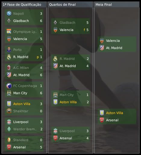 Bruno Trink Postado 21 de Julho 2009 Autor Denunciar Postado 21 de Julho 2009 Aston Villa começa a se tornar o time das goleadas e jogos de muitos gols! 6x0 no CSKA Sofia fora de casa! 5x4 na Inter de Milão não é um feito dos mais simples de se alcançar. Dominaram o Chelsea na Carling Cup de maneira indiscutível. 2x0 no Valência, ótima vitória dentro de casa. Karim Benzema, na minha opinião, não está a render os milhões gastos por ele, apesar de estar balançando as redes, são 4 gols em 8 jogos. Por outro lado, Mehmet Ekici vem se mostrando um goleador! 8 gols em 8 jogos! Média de 1 gol por jogo. Qualquer atacante gostaria de uma média dessas!! Na Premier League: ... apesar de faltar MUITO ainda, em 8 jogos... - Manchester City se consolidando como o grande time Inglês ! Finalmente! 8 jogos invicto! :heh: - Manchester United na 16ª posição !? Que que aconteceu ? - Birmingham na 4ª colocação? - Reading, Charlton e Q.P.R mostram que pretendem continuar na primeira divisão. O francês acabou de chegar e você já quer que ele destrua?! :) O Ekici foi bem sim, bate muito bem de fora da área e chega bem para ajudar o Benzema. Curioso esse contraste entre os times de Manchester, não? O City não vê adversários, atropela todo mundo, enquanto o United está lá embaixo. O que acontece é que o time é velho e não houve renovação. Trocaram de treinador no meio da temporada passada e ele não aguentou nem um ano inteiro. Já trocaram de novo, mas nada funciona. Só pra você ter uma idéia, tomaram de 7 a 1 do Arsenal. O Birmingham ali era cavalo paraguaio, já está caindo. Está muito bem na UCL, na EPL, o City tá mto foda, é tentar ir se aproximando aos poucos. Está difícil de aproximar... :( caramba.. que bela campanha na UCL... nao é pra qualquer um vencer Inter e valencia nao!! parabens! Pois é, mas não podemos nos acomodar. Fora de casa vai ser pedreira. 25.11.2020 As vitórias sobre Valencia e Inter, no Villa Park, nos deram uma vantagem considerável, mas não definitiva, no grupo D da UEFA Champions League. Isso porque teríamos que enfrentá-los novamente fora de casa. O primeiro foi a Inter, no Giuseppe Meazza. Vínhamos de um empate com o Everton, uma derrota categórica para o City e uma vitória pouco convincente sobre o Sunderland, pela Premier League, que aumentava ainda mais a distância na luta pela liderança. Na preleção, fiz questão de tranquilizar o time, mesmo com a pressão por uma vitória. Sabia que a Inter era a favorita para a partida, principalmente porque não tínhamos nosso trio ofensivo Jones, Ekici e Benzema, todos contundidos. No campo, a torcida empurrou e os italianos eram melhores. Seguramos bem o ímpeto do adversário durante todo o primeiro tempo, mas a casa começou a cair num pênalti duvidoso que Salvatore Foti converteu. Kevin Roberts ainda fez o segundo nos acréscimos. Ainda sem os três, a fase continuou ruim. Fizemos um jogo equilibrado com o Portsmouth, mas nos faltou poder de decisão. A sequência de jogos já estava comprometendo a atuação de alguns jogadores. Então, preferi arriscar e escalei os reservas para enfrentar o Sheffield Wednesday pela Carling Cup. Felizmente, vencemos por 1 a 0, gol do garoto Adrian Kedziora. Os titulares voltaram e a produção do time melhorou. Goleamos o Charlton, vencemos uma partida dificílima contra os Spurs, a pedra no nosso sapato no final da temporada passada, e batemos facilmente o Bolton. O City perdeu sua primeira partida no campeonato, mas a vantagem azul na liderança da Premier League ainda é muito grande. Voltando para a Champions, recebemos o CSKA no Villa Park. A vitória era uma obrigação. Para conseguir a classificação sem depender de outros resultados, precisávamos bater os búlgaros e de mais um ponto. Em 15 minutos, já tínhamos 3 a 0 no placar e o time diminuiu o ritmo em campo. Mesmo quando ficamos com um jogador a mais logo depois. Em Milão, o Valencia segurou um 0 a 0 com a Inter e o ponto que precisávamos para a classificação veio de lá mesmo. Citar