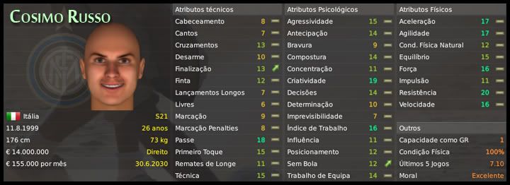 Bruno Trink Postado 14 de Outubro 2009 Autor Denunciar Postado 14 de Outubro 2009 Segue atropeland, que goleada no Milan, vitória sofrida contra a Juve... Estou sentindo o cheiro de campeão, mas ainda é cedo ? Cedo, é, mas está a caminho... 11.03.2026 Reforçar uma equipe de futebol é uma arte e não uma ciência exata. Um jogador pode arrebentar em determinado clube mas, ao ser negociado, não funcionar da mesma forma na nova casa. O contrário também acontece, um jogador que, ao mudar de ares, passa a jogar muito bem. Todos sabem que eu sou um negociador inveterado. Assim, para eu ter contratado apenas um jogador na janela de inverno, é sinal de que estou muito satisfeito com o meu elenco. Cosimo Russo, meia atacante, estava no CSKA Moscowo e veio para compensar a saída de Moisés Corral, que pediu para ser negociado e voltou para o Barcelona. Além dele, o veterano zagueiro Axel também foi negociado, acertando com a Salernitana. Tudo isso é fruto do desempenho do time em campo. Dos quinze jogos que fizemos em pouco mais de dois meses, vencemos treze e empatamos dois. Verdade que, a exemplo do campeonato espanhol que disputei com o Real Madrid, a diferença entre Inter, Milan, Juventus e Roma e os demais times é razoável. Isso, inclusive, pode provocar uma certa acomodação dos jogadores. Minimizei esse problema com um rodízio no elenco, colocando alguns reservas em jogos, teoricamente, mais tranquilos, e com conversas individuais, antes das partidas, com os jogadores com maior propensão a esse tipo de relaxamento. O único tropeço foi em casa, quando empatamos com a Atalanta, numa partida em que fomos muito superiores mas não conseguimos confirmar isso com gols. Sendo assim, abrimos mais três pontos sobre o Milan na liderança da serie A e, continuando assim, o título deve vir com uma certa antecedência. Na Coppa Italia, passamos, com um time inteiro de reservas, pela Fiorentina e chegamos à semifinal. Na primeira partida, vencemos o Empoli no Meazza e podemos até perder por um gol no jogo de volta. Começamos o mata-mata na UEFA Champions League contra um velho conhecido meu. A primeira partida foi no Estádio Kamps, mas nós que parecíamos em casa. Com quarenta e cinco minutos iniciais de gala, fizemos três a zero e praticamente selamos a classificação. Em Milão, acomodados com a enorme vantagem e com mais um gol no início do segundo tempo, deixamos o Gladback empatar. Na próxima fase, teremos um confronto que já estão chamando de final antecipada contra mais um clube pelo qual passei. O Real Madrid é, assim como nós, líder disparado no seu campeonato nacional e é considerado por muitos como o melhor time do mundo, apesar de não ter ido bem na competição continental na temporada passada. Citar
