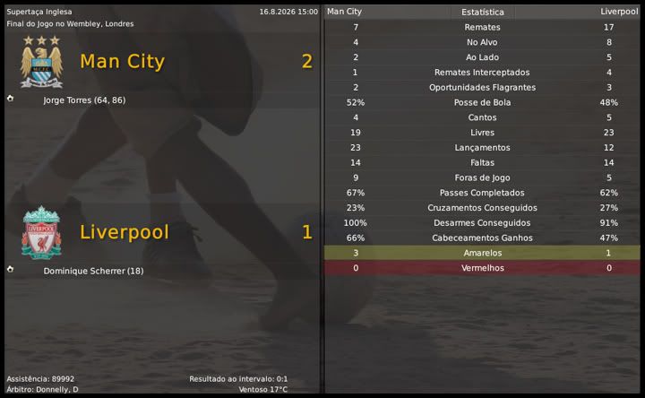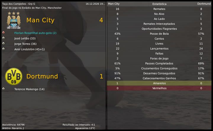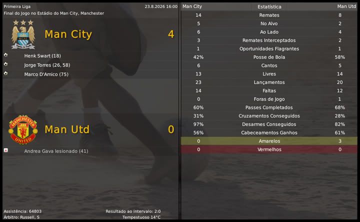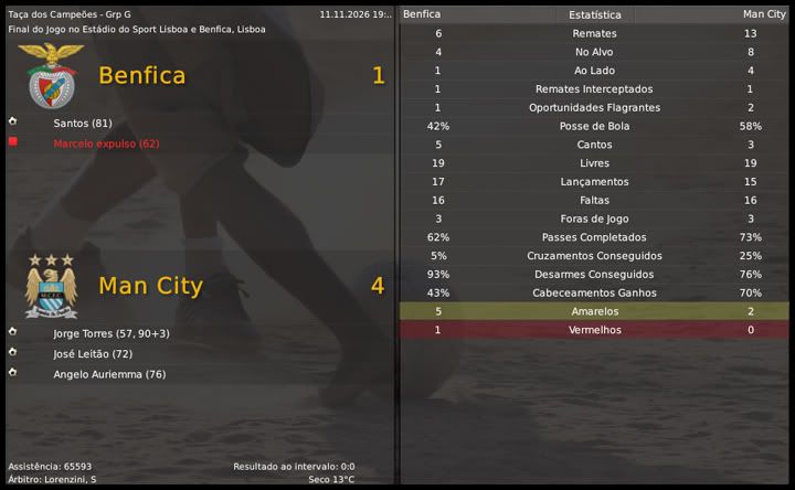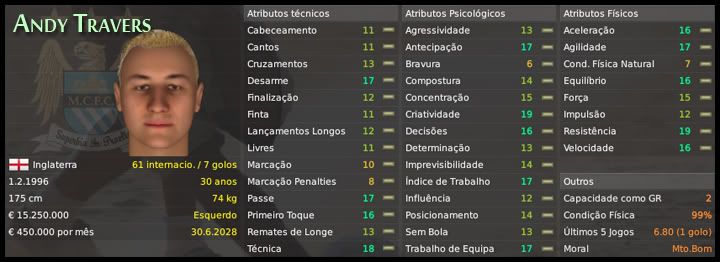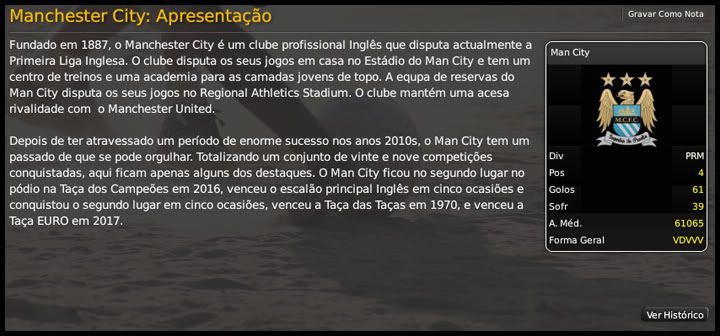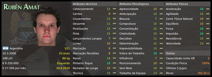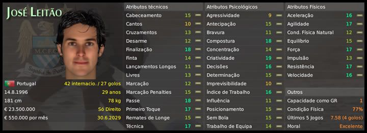 Bruno Trink Postado 26 de Outubro 2009 Autor Denunciar Postado 26 de Outubro 2009 Legal neste save foi ver tantos newgens com qualidade. Agora é para conquistar o título. Espero que sim! Os newgens estão mesmo muito bons. Pelo que eu vi nesse save, apenas os goleiros que não mantem o nível dos reais. 01.11.2026 Quando a pequena Guatemala conquistou uma vaga para disputar a Copa do Mundo da Itália, a surpresa só não foi maior porque todos já conheciam o seu atacante. Jorge Torres não fez uma boa Copa, foi expulso infantilmente logo na estreia da sua seleção, mas tinha crédito. Já confessei que, quando estava procurando um matador para o City, Santaniello era minha primeira opção, até porque já tinha trabalhado com ele, mas acertamos mesmo com Torres. Ele passou em branco na pré-temporada. Estava guardando seus gols para quando pontos estivessem em jogo. Logo no primeiro jogo, decisão da Supertaça, Torres marcou duas vezes e levamos o título sobre o Liverpool campeão inglês. Até agora, em dois meses e meio, o guatemalteco marcou absurdos 19 gols em 13 jogos e é, disparado, o jogador mais importante do elenco. Muitos dos seus gols foram de cabeça, aproveitando suas excelentes habilidades no jogo aéreo, mas ele já mostrou também que sabe marcar com a bola no chão. Outro destaque, esse sem muito alarde, é o meia Edward Gibson, que já eleito melhor jogador do mundo, e é líder de assistências. Quem não vem empolgando tanto é o português José Leitão, mas acho que é, em parte, por culpa minha que ainda não achei a função ideal para ele. Conseguimos nossa classificação para a fase de grupos da Champions vencendo bem o Galatasaray em casa. Na Turquia, cansamos de perder gols e fomos punidos com um gol no final da partida. O grupo, com Borussia Dortmund, Benfica e AIK é razoavelmente tranquilo e espero não ter problemas para passar para a próxima fase. Inclusive, foi o que mostramos nos três primeiros jogos. Contra os suecos do AIK, fizemos 4 a 0 em 15 minutos e estreamos com uma sonora goleada. Depois fomos a Dortmund e Michael Schikora resolveu, no final do primeiro tempo, um jogo que começou bem equilibrado. De novo na nossa casa, mais uma goleada, essa sobre o Benfica, com uma atuação de gala de Jorge Torres. Na Premier League, o campeonato mais disputado do mundo, chegamos no primeiro quarto da competição com uma pequena, mas importante vantagem na liderança. A campanha é ótima, com o ataque mais positivo, mas Liverpool e Arsenal estão na cola. A estreia foi logo no derby de Manchester, um jogo cheio de rivalidade. Mas o United vem numa fase muito ruim que se arrasta desde a aposentadoria de sir Alex Ferguson. Os diabos vermelhos já passearam pela Championship e tem ocupado sempre posições intermediárias na Premier League nas últimas temporadas. Na nossa casa, eles não foram páreo e vencemos sem contestação. Apenas enfrentaremos os dois maiores rivais pelo título no final do primeiro turno e, então, terei uma ideia se realmente poderei me aposentar no final da temporada. Citar