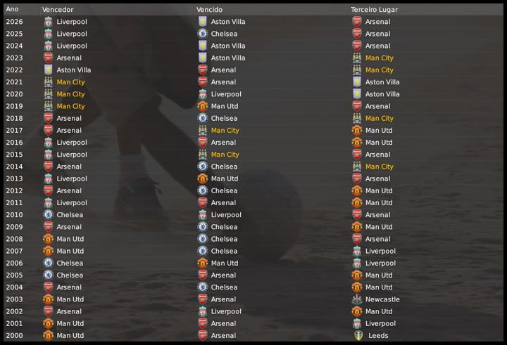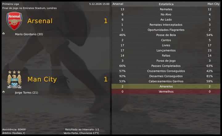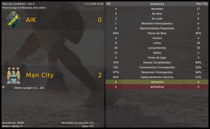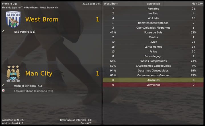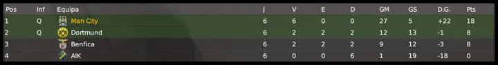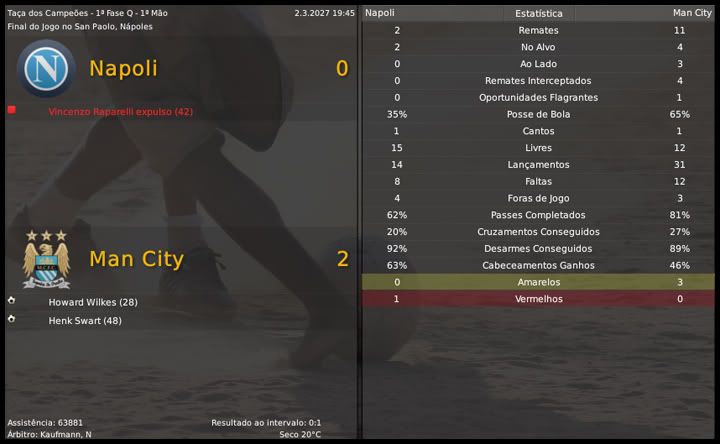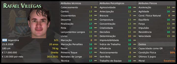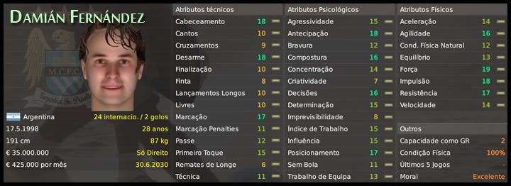 Bruno Trink Postado 28 de Outubro 2009 Autor Denunciar Postado 28 de Outubro 2009 01.01.2027 Para quem começou fazendo omelete sem ovos no pequeno Hyde United, as condições que eu encontrei aqui no quase vizinho Manchester City são de outro mundo. Condições de treino de altíssimo nível e fundos quase sem fim. Com um alto orçamento para transferências e salários, eu consigo reforçar ainda mais o elenco do City. No final da outra janela, eu tentei contratar o argentino Rafael Villegas para servir como opção para a função do português José Leitão. Como o garoto, que jogou comigo em Sarandí, tem apenas 20 anos e nenhuma convocação para a seleção argentina, ele não conseguiu o visto de trabalho para jogar na Inglaterra. Acabei acertando com o holandês Henk Swart. Curiosamente, algumas semanas depois do fechamento da janela, conseguimos o visto para Villegas e ele se junta ao grupo em janeiro. Não tivemos esse problema com outro argentino, o zagueiro Damián Fernández. Desde garoto no Boca Juniors, Fernández vem para suprir uma carência de zagueiros, uma vez que D'Amico e Forsberg já estão com 33 anos e deram claros sinais de declínio físico nessa primeira metade da temporada. A campanha no campo continua brilhante. Enquanto um time cheio de reservas avança na Taça da Liga Inglesa, os titulares abrem vantagem na Premier League. Antes dos confrontos diretos, tanto Arsenal quanto Liverpool tropeçaram enquanto nós tropeçamos apenas num surpreendente West Brom. No momento de encarar os rivais, fizemos o esperado. No Emirates, no duelo dos atacantes, Torres abriu o placar, mas Mario Giordano empatou logo depois. Contra o Liverpool, em casa, já éramos melhores antes da expulsão de Kéfi e despachamos os Reds. Chegamos, assim, à metade do campeonato com uma bela vantagem de nove pontos sobre os gunners. O sonho do tetra do Liverpool ficou mais distante. Terminamos a fase de grupos da UEFA Champions League com 100% de aproveitamento. Goleamos o Benfica em Lisboa, vencemos o AIK com dois gols de falta de Dieter Langen e precisamos de apenas metade do jogo para bater o Dortmund. Mas mata-mata é outra história e começaremos enfrentando a boa equipe do Napoli, numa fase que terá outros confrontos interessantes de ingleses contra italianos. Citar