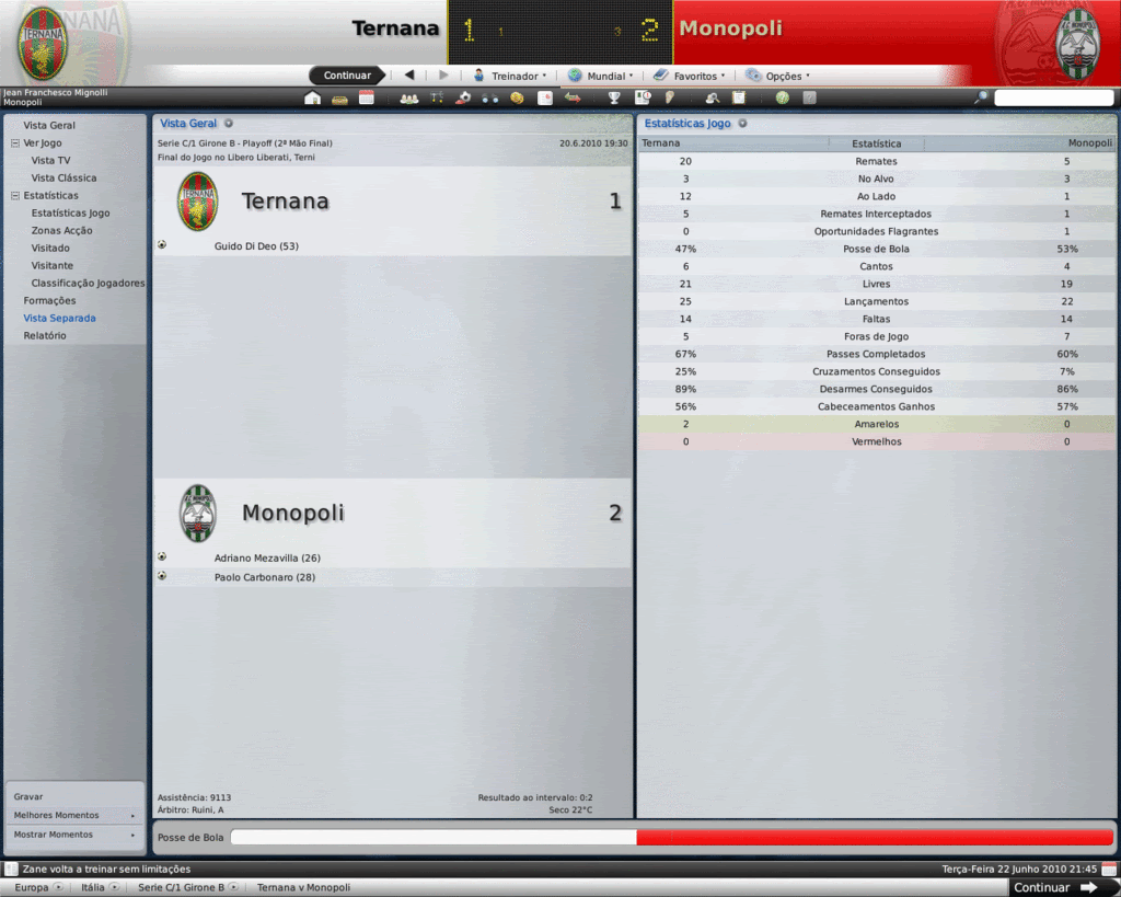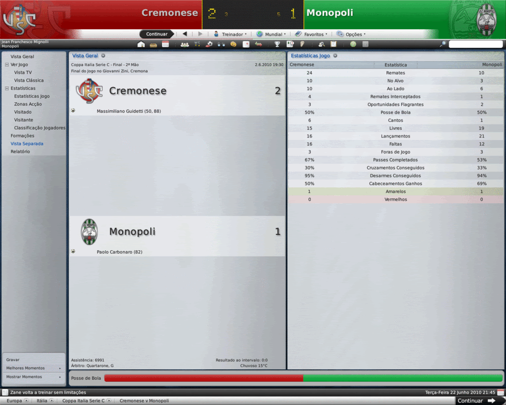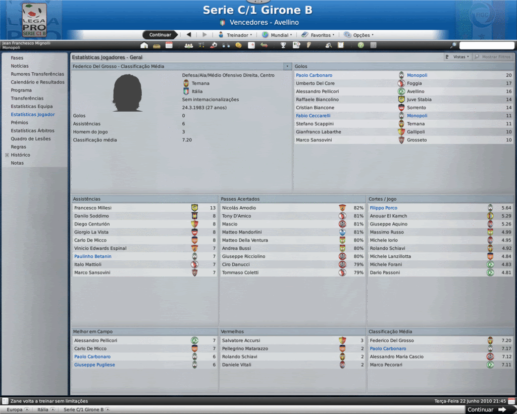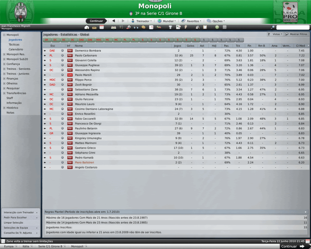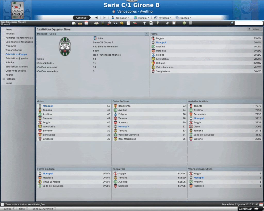 Jirimias Postado 20 de Março 2009 Autor Denunciar Postado 20 de Março 2009 2009/2010 - Promovido e campeão O verde do Monopoli não amarelou nas decisões.Carbonaro que havia ressurgido das cinzas, não deixou o time na mão e foi decisivo e porque não um dos principais responsáveis pelo sucesso no fim da temporada. 2009/2010 - Série C/1 Jogamos dois jogos para cumprir tabela, vencemos um e empatamos outro.Foi importante não perder , pois assim fomos com moral para os jogos decisivos.Classificado para os playoffs como terceiro colocado, nosso adversário foi o Benevento, que fez tudo para complicar as coisas, e eu havia julgado que eles seriam o adversário que nos daria menos trabalho nesta fase do campeonato.Com um empate e uma vitória simples passamos adiante para a grande final contra o Ternana, que ganhasse estaria na Série B no ano que vem. ] A vitória por 1x0 não dava-nos direito à comemorações, ainda mais com a lesão do nosso principal jogador da defesa, o Marsill.O segundo jogo tinha tudo para ser uma guerra.E assim foi... Na partida de volta, o Ternana foi quem dominou a partida, mas fomos felizes nos contra-ataques.Carbonaro o carrasco do Ternana marcou o nosso segundo gol na vitória por 2x1.Estamos na Série B! artilheiro | estatísticas clubes | estatísticas jogadores Monopoli 2009/2010 - Coppa Itália Série C A primeira final da Copa da Itália foi acima de todas as expectativa, uma goleada de 4x1 sobre a Cremonese deu-nos o gosto do título já naquele instante.A segunda partida seria para confirmar o título.A Cremonese pressinou bastante, e até emrecia uma sorte maior, mas nós tínhamos Carbonaro, o homem das finais.Monopoli campeão da Copa da Série C!! 2009/2010 - Notícias 2009/2010 - Histórico 2009/2010 - Atualizações informações do clube Citar