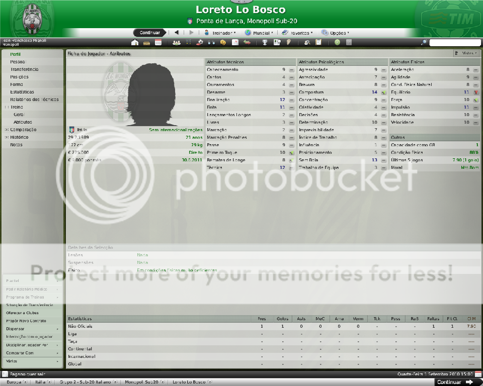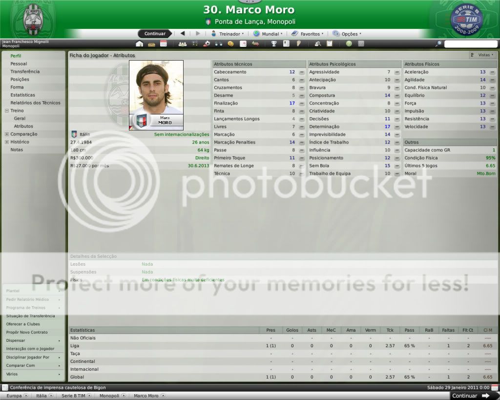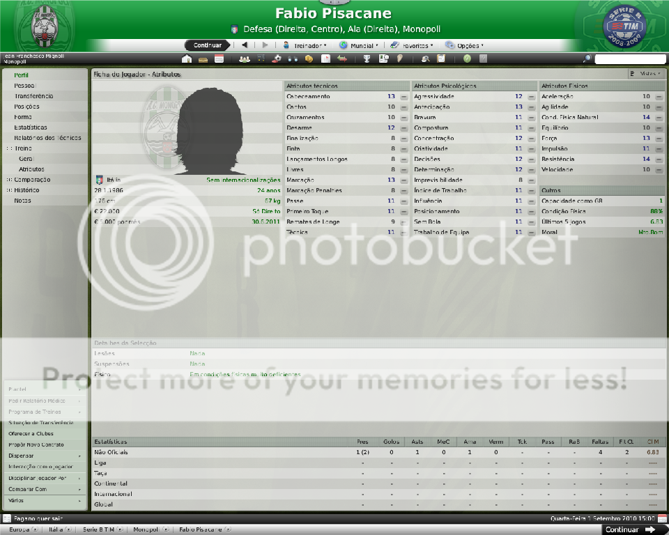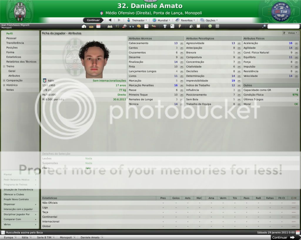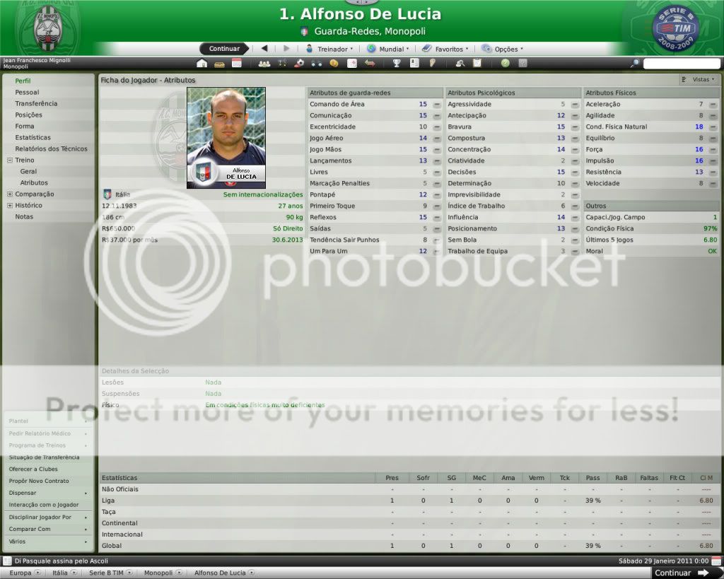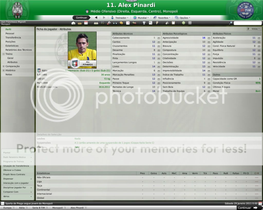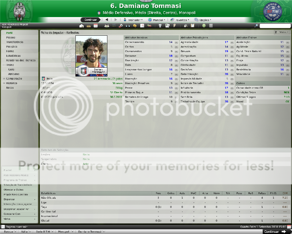 Jirimias Postado 26 de Março 2009 Autor Denunciar Postado 26 de Março 2009 Nova divisão,novo layout. Toda temporada tenho modificado a forma de postagem, o que acaba marcando esteticamente as temporadas.Agora na Série B decidi por um layout mais leve,bem simples, com mais textos e mais imagens do jogo do que imagens do photoshop.Para quem tem que administrar dois saves acaba sendo uma boa alternativa. Nos bastidores. A diretoria do Monopoli liberou e eu não perdi tempo de reforçar a comissão técnica, foram seis novos membros sendo dois olheiros, um prepador de goleiros e três preparadores físicos.A única baixa foi a demissão de Trentadue. Com as mudanças na comissão técnica, os treinos ganharam algumas estrelas, com destaque para os treinos de bola parada, que era algo que eu queria explorar nesta nova temporada. Parceria indesejada. Desde o começo que me propus a fazer uma LLM eu me recusei a fazer parcerias, apesar de pensar que elas fazem parte da realidade dos clubes.Só que aconteceu um fato pitoresco, algo que eu não tinha visto ainda nestes anos de FM: a diretoria acertou a parceria sozinha, e fui comunicado sobre ela, sem poder fazer nada, nem menos cancelar-la já que o prazo mínimo para finalizar ela é em maio de 2011.Desta forma, o Monopoli conta com uma parceria com o Heerenveen, onde o clube receberá uma ajuda anual de cerca de R$120 mil e terá alguns jogadores emprestados ao clube. Por sorte eles não contam com bons jogadores disponíveis, então a parceria pouco interferiu até agora no andamento do save. Entre eles e o Monopoli. Existe um abismo entre Monopoli e pelo menos 16 equipes da Série B, as demais superam o Monopoli em alguns setores, porém possuem alguns pontos fracos que tento explorar.Realmente a Série B é uma barra, talvez pior do que eu imaginava.A começar por eles explorarem bastante a dupla nacionalidade de alguns argentinos e terem fixado os olhos nos jogadores hermanos.Civelli,Gustavo Lorenzetti,Pablo Vitti,Morero entre outros deixam qualquer treinador adversário com inveja.No qusito números de argentinos o Pisa lidera : são cinco no total. Por enquanto eu tenho que me conformar de ver os argentinos que jogam na Itália, até que um dia a diretoria me libere para mandar meus olheiros italianos para a América.Ah, só olheiros itaianos, já que somente os desta nacionalidade responde ao anúncio de emprego. E outro grande empecilho é um razoável números clubes com alguma tradição na Série B nesta temporada, para eles isso não é nenhum órgulho e para nós soa ainda mais doloroso.Ter jogos contra Chievo,Bologna,Ascoli,Reggina,Siena,Livorno e outros não é nada fácil, principalmente quando você atenta jogar de igual para igual. Aqui se joga muito no 4-4-2 tradicional, com duas linhas de quatro, um esquema que eu, modestamente, sabia explorar muito bem nas divisões inferiores.Mas não é o sistema tático em si, são meus laterais, eles não conseguem dar conta dos pontas da Série B, que são melhores ou igual ao Carbonaro.Imagine encontrar um desses em todos os jogos? São lições que vou aprendendo, espero que o Monopoli não caia e eu possa utilizar este primeiro teste na Série B como inspiração para a próxima temporada. Como dizia o rei Roberto Carlos:"são tantas emoções!".Pois então, não faltaram momentos emocionantes neste primeiro turno de Série B.Tantas emoções que eu não consegui parar de jogar. A estréia. Dura estréia contra o Bari.Volpato que jogou na Juventus na temporada 2004/2005 foi o grande nome da partida, com dois gols marcados , o atacante mostrou-nos o cartão de visita da Série B, foi como se falasse:" Isso é só o começo". A partida terminou em 3x0 para dos donos da casa, e se fosse maior a diferença não seria nenhum exagero.Merecemos perder! A primeira vitória. Essa a gente não esquece.Foi na 5º rodada e foi na marra.Carbonaro cobrando falta fez o único gol da partida, e o Modena fez de tudo para tirar-nos os três pontos, mas a sorte nos sorriu com mais dentes.Esta vitória nos retirou da lanterna do campeonato. O alívio de voltar a vencer. Depois de vencer o Modena, empatamos jogos que pensei que devíamos sair vencedores.Rimini e Avellino são uma daquelas equipes que se igualam ao Monopoli, principalmente o Avellino ,que como o nosso time ainda se sentem meio "fora do ninho" na Série B.Mas o pior estava por vir: sete jogos sem vencer...triste!Neste momento pensei comigo:" acho que vamos voltar para onde saímos", mas a vitória voltou contra o Ravenna, e ficamos sem perder alguns jogos depois disto ,culminando em uma excelente partida contra o Treviso.Na casa deles:4x0 Monopoli. O alívio de ver o abismo há alguns metros. Sete pontos para o primeiro clube a ser rebaixado, sim posso comemorar, sem exageros, pois tem muitos jogos pela frente.No jogo de despedida de 2010, vencemos em casa o Triestina e garantimos um final de ano tranquilo, pelo menos na tabela... ...porque iniciou-se uma guerra de vaidades, coisas comuns de um time que passou por uma crise.Todos querem ser titulares, mas não jogam o suficiente para merecerem a titularidade, e aí a única solução é. .. sumir com eles para que reine a paz no Reino Biancoverde. Números coletivos. Os números não são muito animadores, pelo menos nas quatro linhas, já que pelo menos nas arquibancadas nossa torcida tem vindos nos apoiar: Jogos: 21 Gols marcados: 18 (0,9) Gols sofridos: 21 ( 1,3) Cartões amarelos: 18 (0,9) Cartões vermelhos: 1 (0,0) Assistência Média: 6.082 Números individuais. Raio-x. Curiosidades. A capacidade do estádio Vito Simone Veneziane, o Simonão, é de 6.880 pessoas, sendo 5.000 sentadas.Nunca em toda a história do Monopoli, o estádio registrou uma média tão perto da sua lotação máxima como nesta temporada. As condições de treino no Monopoli são adequadas, solicitei uma melhora mas terei que esperar por um momento mais próspero. A média de idade do Monopoli é 22 anos,