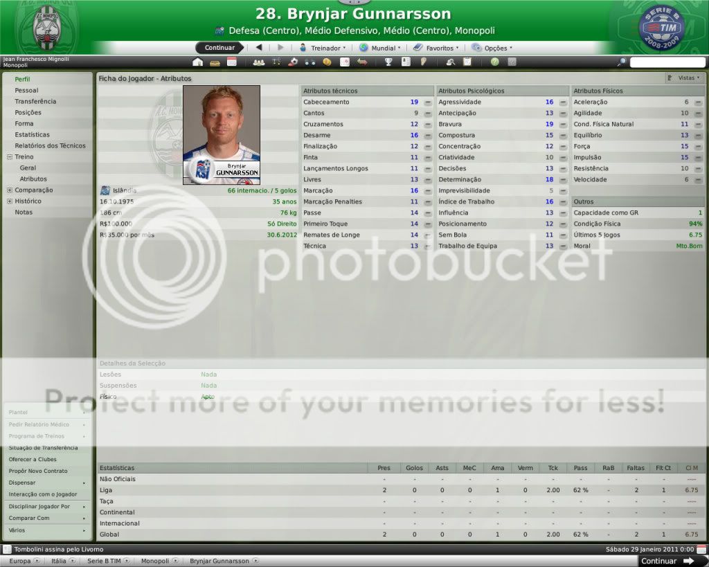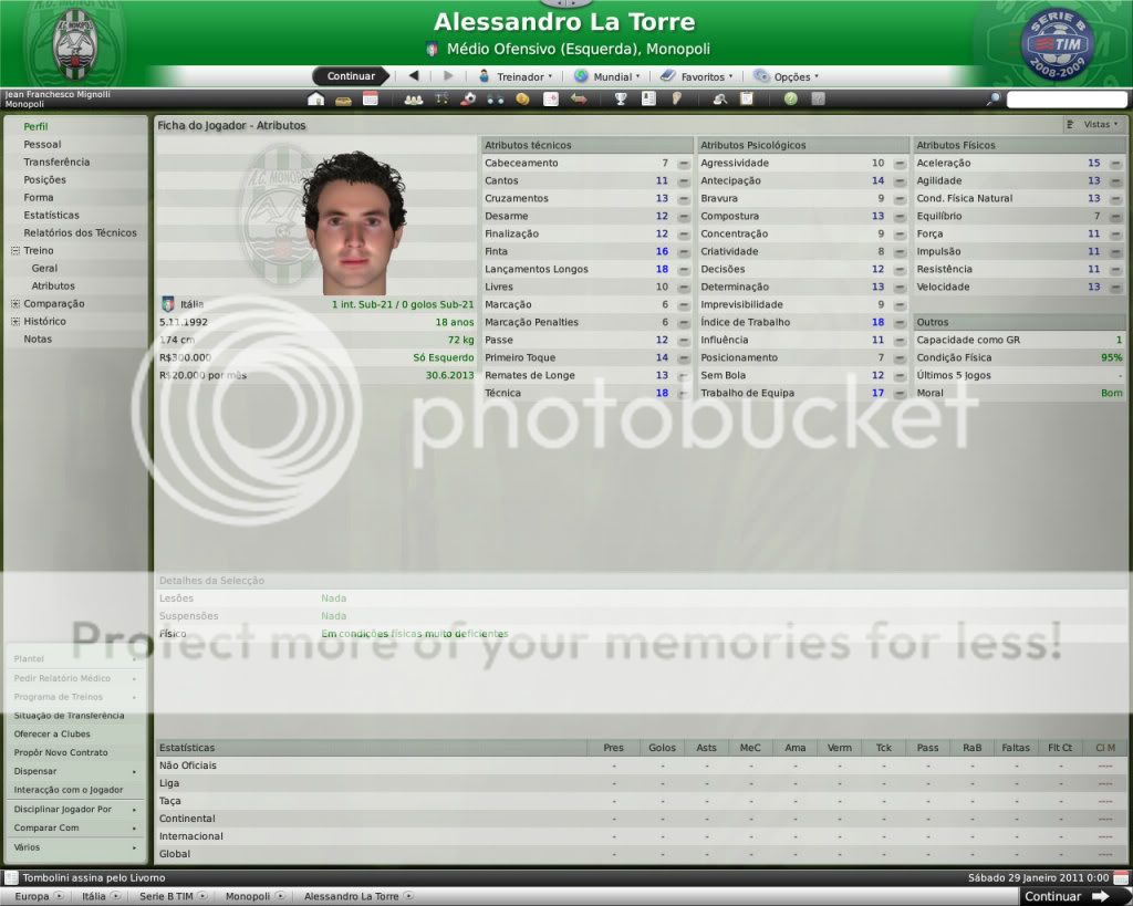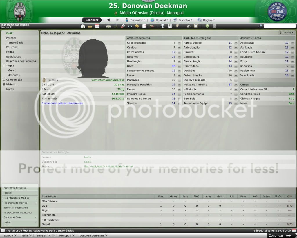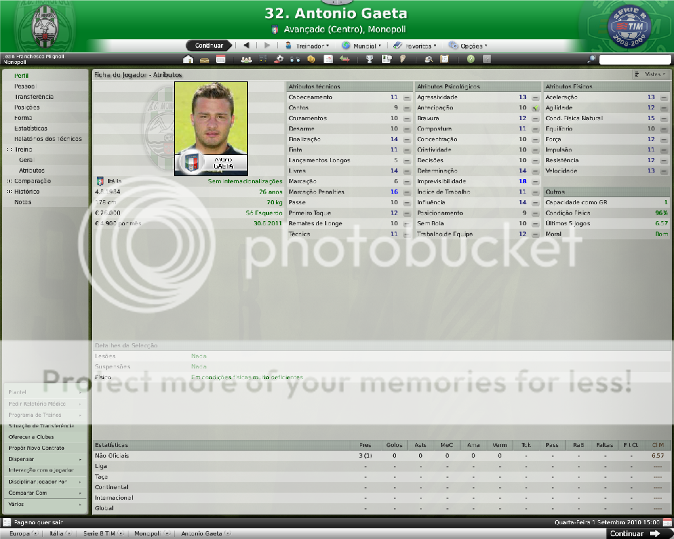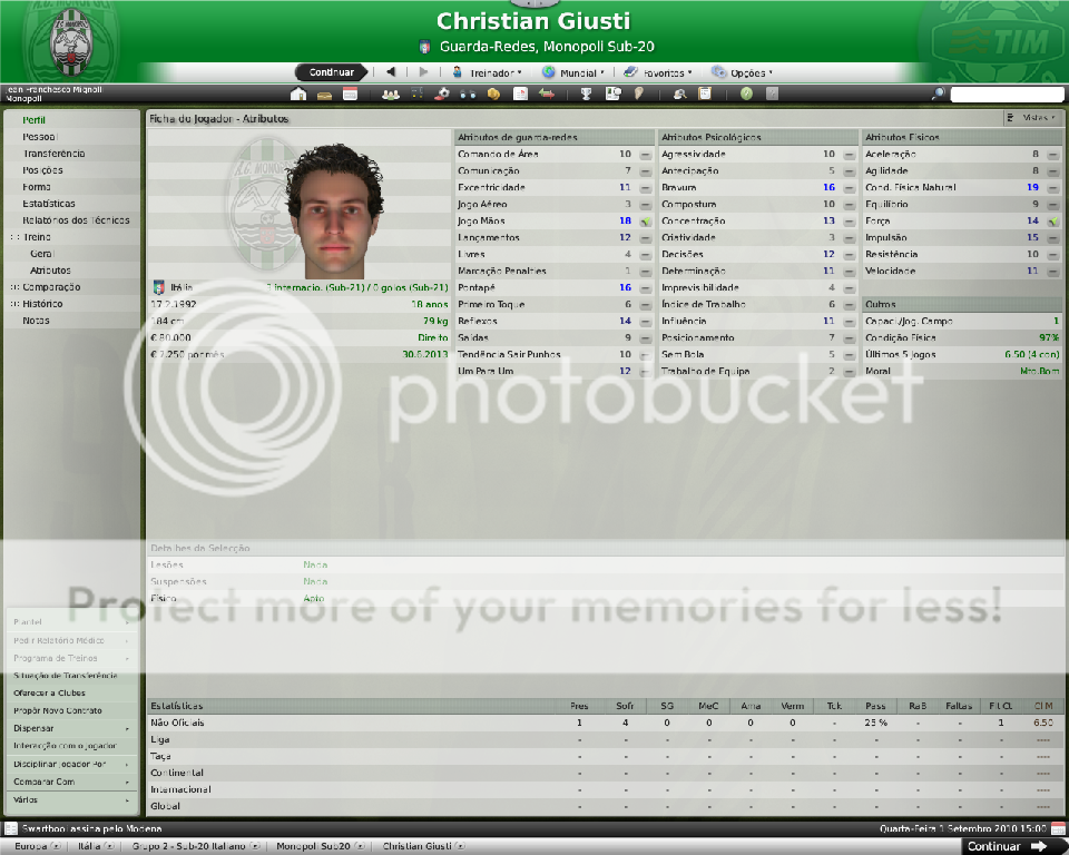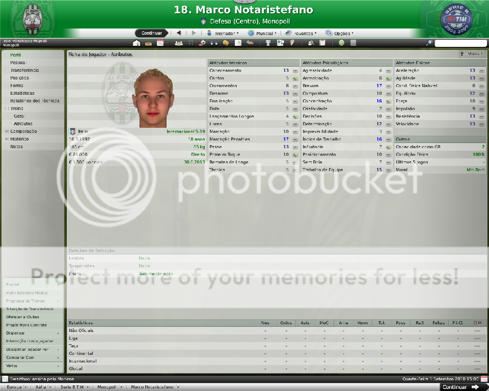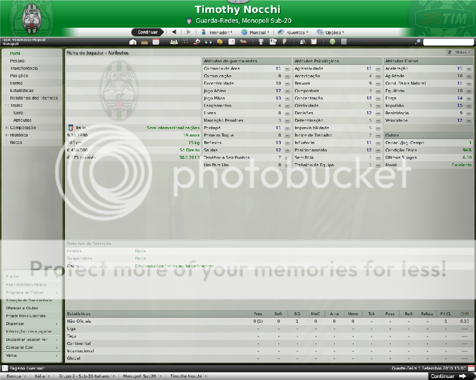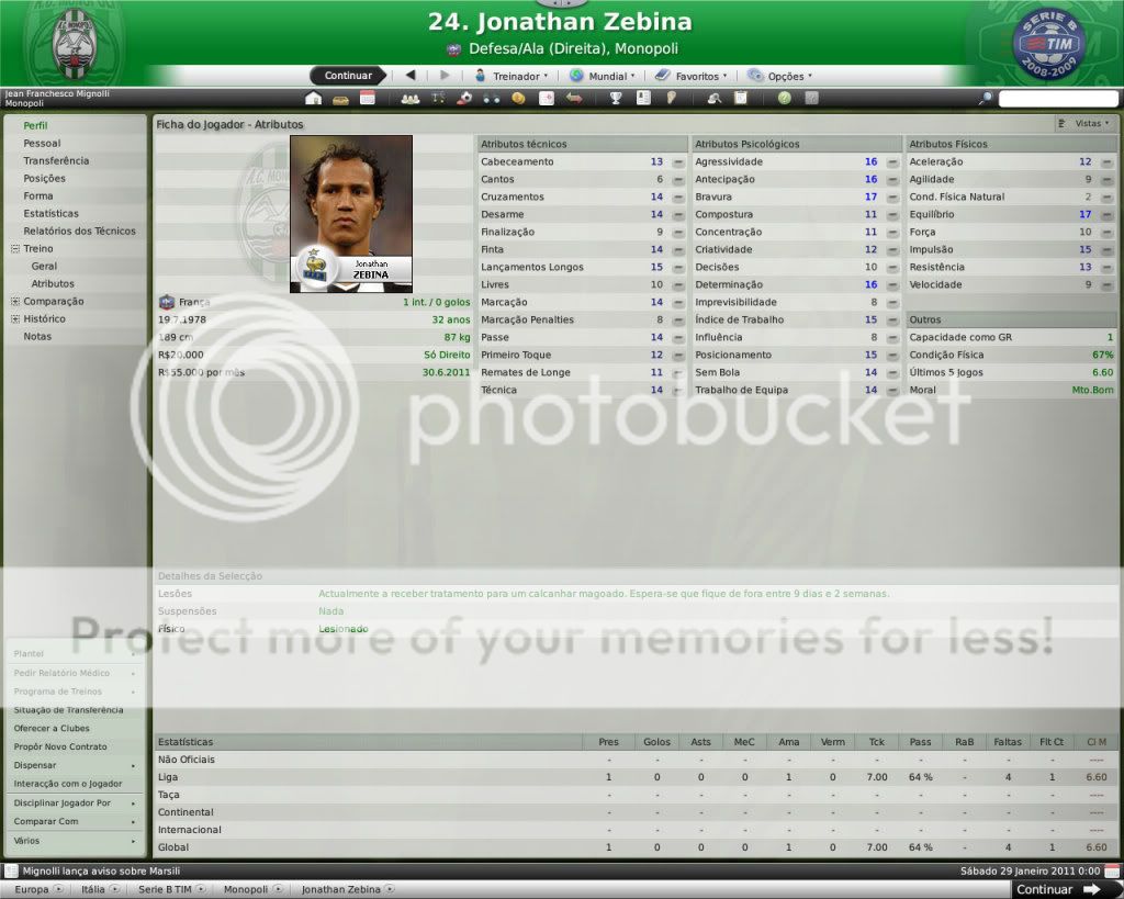 Jirimias Postado 26 de Março 2009 Autor Denunciar Postado 26 de Março 2009 Nova divisão,novo layout. Toda temporada tenho modificado a forma de postagem, o que acaba marcando esteticamente as temporadas.Agora na Série B decidi por um layout mais leve,bem simples, com mais textos e mais imagens do jogo do que imagens do photoshop.Para quem tem que administrar dois saves acaba sendo uma boa alternativa. Nos bastidores. A diretoria do Monopoli liberou e eu não perdi tempo de reforçar a comissão técnica, foram seis novos membros sendo dois olheiros, um prepador de goleiros e três preparadores físicos.A única baixa foi a demissão de Trentadue. Com as mudanças na comissão técnica, os treinos ganharam algumas estrelas, com destaque para os treinos de bola parada, que era algo que eu queria explorar nesta nova temporada. Parceria indesejada. Desde o começo que me propus a fazer uma LLM eu me recusei a fazer parcerias, apesar de pensar que elas fazem parte da realidade dos clubes.Só que aconteceu um fato pitoresco, algo que eu não tinha visto ainda nestes anos de FM: a diretoria acertou a parceria sozinha, e fui comunicado sobre ela, sem poder fazer nada, nem menos cancelar-la já que o prazo mínimo para finalizar ela é em maio de 2011.Desta forma, o Monopoli conta com uma parceria com o Heerenveen, onde o clube receberá uma ajuda anual de cerca de R$120 mil e terá alguns jogadores emprestados ao clube. Por sorte eles não contam com bons jogadores disponíveis, então a parceria pouco interferiu até agora no andamento do save. Entre eles e o Monopoli. Existe um abismo entre Monopoli e pelo menos 16 equipes da Série B, as demais superam o Monopoli em alguns setores, porém possuem alguns pontos fracos que tento explorar.Realmente a Série B é uma barra, talvez pior do que eu imaginava.A começar por eles explorarem bastante a dupla nacionalidade de alguns argentinos e terem fixado os olhos nos jogadores hermanos.Civelli,Gustavo Lorenzetti,Pablo Vitti,Morero entre outros deixam qualquer treinador adversário com inveja.No qusito números de argentinos o Pisa lidera : são cinco no total. Por enquanto eu tenho que me conformar de ver os argentinos que jogam na Itália, até que um dia a diretoria me libere para mandar meus olheiros italianos para a América.Ah, só olheiros itaianos, já que somente os desta nacionalidade responde ao anúncio de emprego. E outro grande empecilho é um razoável números clubes com alguma tradição na Série B nesta temporada, para eles isso não é nenhum órgulho e para nós soa ainda mais doloroso.Ter jogos contra Chievo,Bologna,Ascoli,Reggina,Siena,Livorno e outros não é nada fácil, principalmente quando você atenta jogar de igual para igual. Aqui se joga muito no 4-4-2 tradicional, com duas linhas de quatro, um esquema que eu, modestamente, sabia explorar muito bem nas divisões inferiores.Mas não é o sistema tático em si, são meus laterais, eles não conseguem dar conta dos pontas da Série B, que são melhores ou igual ao Carbonaro.Imagine encontrar um desses em todos os jogos? São lições que vou aprendendo, espero que o Monopoli não caia e eu possa utilizar este primeiro teste na Série B como inspiração para a próxima temporada. Como dizia o rei Roberto Carlos:"são tantas emoções!".Pois então, não faltaram momentos emocionantes neste primeiro turno de Série B.Tantas emoções que eu não consegui parar de jogar. A estréia. Dura estréia contra o Bari.Volpato que jogou na Juventus na temporada 2004/2005 foi o grande nome da partida, com dois gols marcados , o atacante mostrou-nos o cartão de visita da Série B, foi como se falasse:" Isso é só o começo". A partida terminou em 3x0 para dos donos da casa, e se fosse maior a diferença não seria nenhum exagero.Merecemos perder! A primeira vitória. Essa a gente não esquece.Foi na 5º rodada e foi na marra.Carbonaro cobrando falta fez o único gol da partida, e o Modena fez de tudo para tirar-nos os três pontos, mas a sorte nos sorriu com mais dentes.Esta vitória nos retirou da lanterna do campeonato. O alívio de voltar a vencer. Depois de vencer o Modena, empatamos jogos que pensei que devíamos sair vencedores.Rimini e Avellino são uma daquelas equipes que se igualam ao Monopoli, principalmente o Avellino ,que como o nosso time ainda se sentem meio "fora do ninho" na Série B.Mas o pior estava por vir: sete jogos sem vencer...triste!Neste momento pensei comigo:" acho que vamos voltar para onde saímos", mas a vitória voltou contra o Ravenna, e ficamos sem perder alguns jogos depois disto ,culminando em uma excelente partida contra o Treviso.Na casa deles:4x0 Monopoli. O alívio de ver o abismo há alguns metros. Sete pontos para o primeiro clube a ser rebaixado, sim posso comemorar, sem exageros, pois tem muitos jogos pela frente.No jogo de despedida de 2010, vencemos em casa o Triestina e garantimos um final de ano tranquilo, pelo menos na tabela... ...porque iniciou-se uma guerra de vaidades, coisas comuns de um time que passou por uma crise.Todos querem ser titulares, mas não jogam o suficiente para merecerem a titularidade, e aí a única solução é. .. sumir com eles para que reine a paz no Reino Biancoverde. Números coletivos. Os números não são muito animadores, pelo menos nas quatro linhas, já que pelo menos nas arquibancadas nossa torcida tem vindos nos apoiar: Jogos: 21 Gols marcados: 18 (0,9) Gols sofridos: 21 ( 1,3) Cartões amarelos: 18 (0,9) Cartões vermelhos: 1 (0,0) Assistência Média: 6.082 Números individuais. Raio-x. Curiosidades. A capacidade do estádio Vito Simone Veneziane, o Simonão, é de 6.880 pessoas, sendo 5.000 sentadas.Nunca em toda a história do Monopoli, o estádio registrou uma média tão perto da sua lotação máxima como nesta temporada. As condições de treino no Monopoli são adequadas, solicitei uma melhora mas terei que esperar por um momento mais próspero. A média de idade do Monopoli é 22 anos,