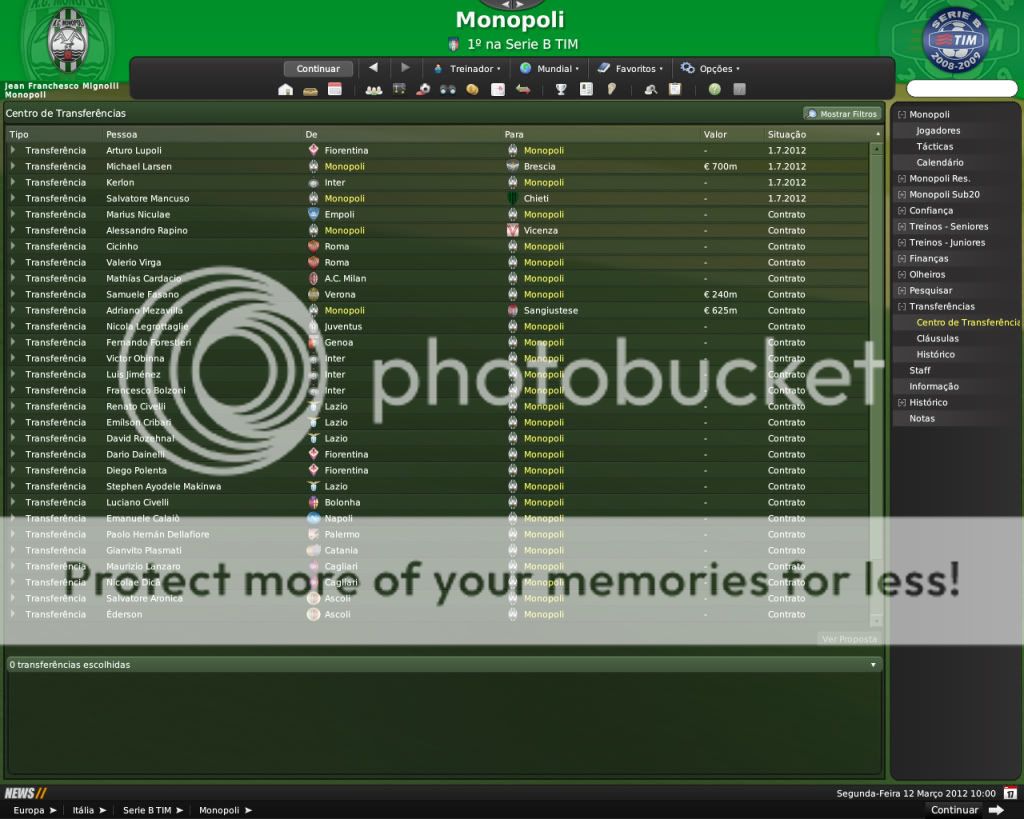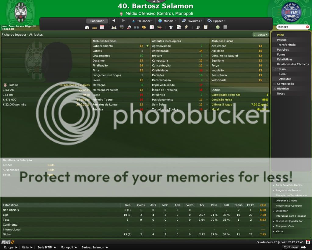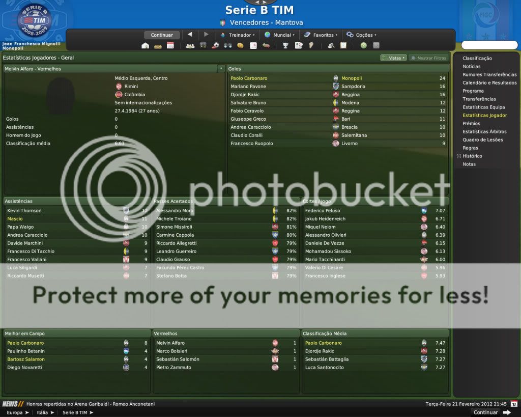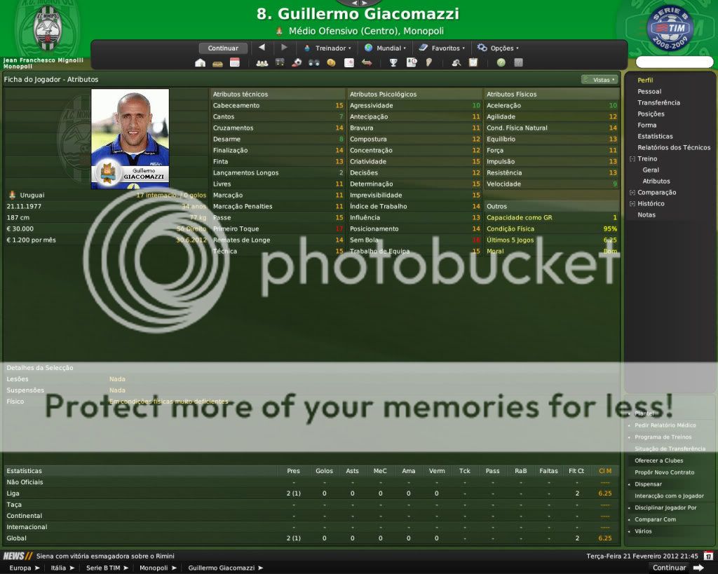 Jirimias Postado 6 de Abril 2009 Autor Denunciar Postado 6 de Abril 2009 Quem tem medo da Série B? Fechamos o ano de 2011 em grande estilo mesmo conhecendo as primeiras derrotas da temporada ( jogos oficiais ).Uma sequência de jogos que serviu também para espantar velhos fantasmas da temporada passada como por exemplo Salenitana e Pisa.A defesa foi um setor preocupante, não pelo número de gols sofridos (14), já que a Roma contribuiu com cinco gols para este número, mas o que mais me chamou a atenção foi que em quase todos os jogos nós sofremos gols, na maioria das vezes por acomodarmos com a vantagem no placar. Os resultados em campo, felizmente, não reflete o clima dos bastidores do clube que é horrível devido à demasiada de ambição dos jovens.Parece inevitável segurar alguns deles na equipe, como aconteceu com Luca Berardocco que reclamava lugar na equipe principal e foi negociado pelo afobado Sr. Mesto, presidente do Monopoli. Copa da Itália Roma 5x2 Monopoli Contra a Roma era impossível pensar em outra coisa senão perder de pouco, jogar no Olímpico então, era ter a certeza que perder de pouco também era uma tarefa bem complicada.A Roma não quis saber de poupar jogadores e nem energia para vencer o Monopoli, com uma vantagem de 4 gols até os 13 minutos do segundo tempo, nos restava fazer um ou dois gols para diminuir o vexame. Conseguimos diminuir o vexame com Mascio e Carbonaro, mas recebemos o golpe de misericórdia no último minuto com Totti.Por 5x2 fomos eliminados da Copa da Itália, naquela que foi a mais longa jornada do Monopoli nesta competição. 22º rodada - Série B Tim Cremonese 0x3 Monopoli No jogo de despedida do ano, viajamos até Cremona para enfrentar a equipe da casa.Eles vinha de quatro jogos sem perder, e jogando em casa era grande a chance deles manterem a sequência invicta.Porém, Carbonaro queria manter a boa média de gols, ele que caminha para um recorde histórico da Série B, marcou três gols , os três gols da goleada sobre os donos da casa. Associazione Calcio Monopoli Jogadores & Estatísticas Carbonaro segue sua rotina de matador (ainda bem!), Mascio voltou a ser o mesmo da temporada passada e Salomon é a grande revelação deste Monopoli.O polonês foi contratado a custo zero no final do período de transferência. (Giacomazzi e Ascentis foram contratados no início de 2012, as SS e os comentários a respeito estarão a seguir) Feliz 2012 O ano começou bem movimentado no que se refere ao mercado, principalmente em termos de saídas.A venda de jovens parece inevitável, nesta onda de aceites do Sr.Mesto, perdemos Marco Notaristefano, zagueiro tido como central espetacular, mas a proposta era mesmo irrecusável, €3,1M mais 20% na próxima transferência.Com Marco esta foi a segunda venda de jovens promissores , que já rendeu ao clube € 4,4M. Fruci era outro que esteve perto de ser negociado, mas no fim conseguimos emprestá-lo e ainda ganhar uma pequena quantia por isso. Boa parte dos jogadores negociados foram jogadores contratados nesta temporada, mas nenhuma transferência foi mais desastrosa que a de Diego De Ascentis, contratado para dar experiência ao time junto com Giacomazzi, o volante teve duas lesões, a última foi uma hérnia discal que me obrigou a dispensá-lo pagando €10 mil de rescisão. Quanto as contratações, além do Giacomazzi que eu citei acima, reforcei o time com dois atacantes: o norte-americano Gabriel Ferrari e o italiano Luca Paponetti.Com a saída de Pugliese, o jogador que mais vestiu a camisa biancoverde em toda história do clube, percebi a necessidade de contratar outro lateral esquerdo, este mais jovem: Gianluigi Bianco, pouco valorizado pela Sampdória, mas indiscutivelmente uma pérola. Guillermo Giacomazzi | Luca Paponetti | Gabriel Ferrari | Gianluigi Bianco E aí foi a vez de voltar a campo, marquei dois amistosos no meio da temporada para testar os jogadores que reclamavam titularidade: eles provaram que eu estou certo em esperar pelo amadurecimento deles: empate com os juniores e derrota pesada para o AZ. Mas na hora de jogar sério, os titulares apresentaram o futebol que vem consagrando o time como a grande surpresa da Série B.Destaque para o empate contra o forte Frosinome em casa e vitória sobre o Pescara, em um jogo que nos daria vantagem de consolidar a segunda colocação, e quem sabe dar um passo em direção à uma promoção sem playoff. 27º rodada - Série B Tim Monopoli 2x1 Pescara O jogo em destaque foi o último desta sequência contra o Pescara, um time que sempre nos causou sérios problemas.Uma vitória nos colocaria em uma posição bem tranquila na classificação.Não jogamos o nosso melhor e não merecemos a vitória, mas dizem que os vencedores também são feitos com pitadas de sorte, e ela sorriu para nós.A vitória por 2x1 não só aumentou a distãncia para seis pontos para o Bréscia , 3º colocado, como também nos deixou líderes juntamente com a Sampdória, que voltou a tropeça. Anexo: Estatística clubes Estatística jogador Finanças Resumo Notas plantel Citar
