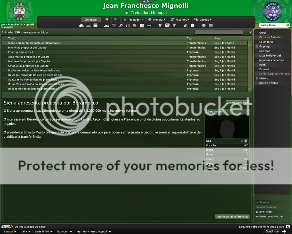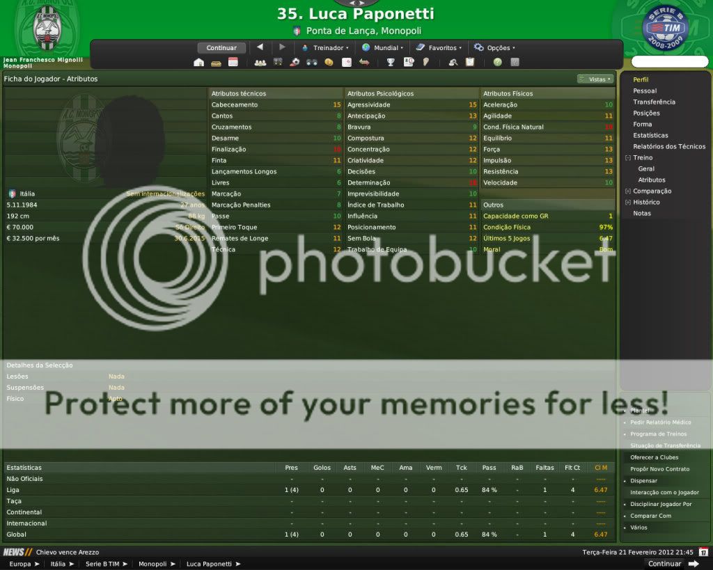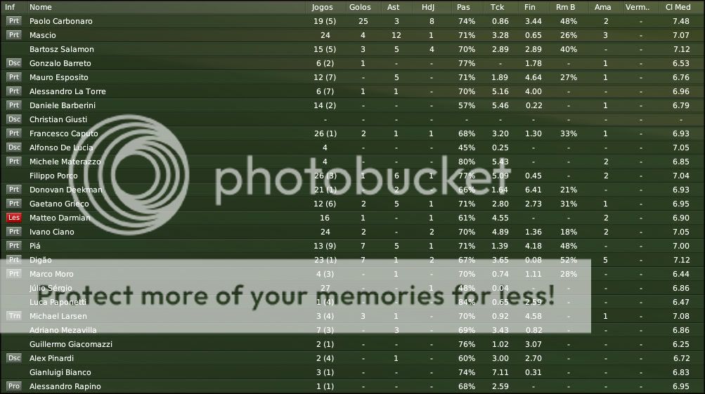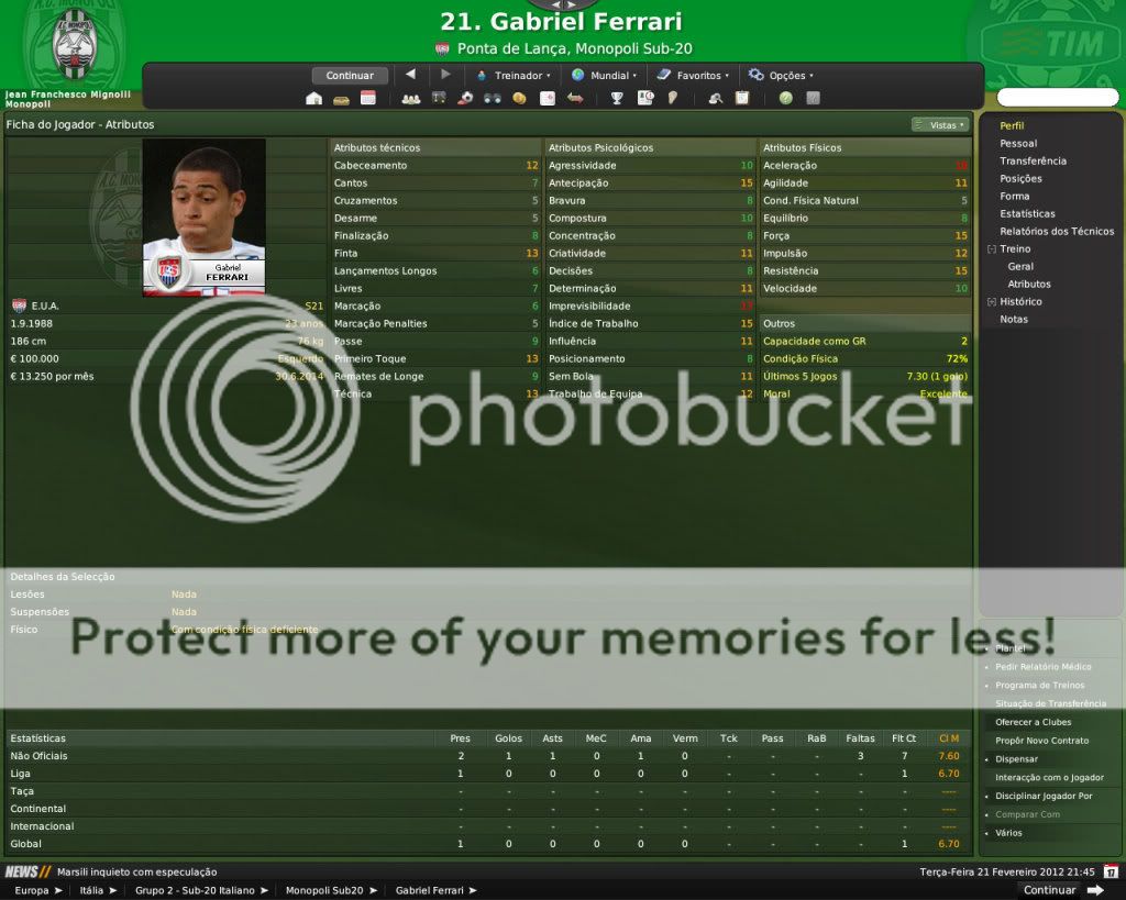 Jirimias Postado 6 de Abril 2009 Autor Denunciar Postado 6 de Abril 2009 Quem tem medo da Série B? Fechamos o ano de 2011 em grande estilo mesmo conhecendo as primeiras derrotas da temporada ( jogos oficiais ).Uma sequência de jogos que serviu também para espantar velhos fantasmas da temporada passada como por exemplo Salenitana e Pisa.A defesa foi um setor preocupante, não pelo número de gols sofridos (14), já que a Roma contribuiu com cinco gols para este número, mas o que mais me chamou a atenção foi que em quase todos os jogos nós sofremos gols, na maioria das vezes por acomodarmos com a vantagem no placar. Os resultados em campo, felizmente, não reflete o clima dos bastidores do clube que é horrível devido à demasiada de ambição dos jovens.Parece inevitável segurar alguns deles na equipe, como aconteceu com Luca Berardocco que reclamava lugar na equipe principal e foi negociado pelo afobado Sr. Mesto, presidente do Monopoli. Copa da Itália Roma 5x2 Monopoli Contra a Roma era impossível pensar em outra coisa senão perder de pouco, jogar no Olímpico então, era ter a certeza que perder de pouco também era uma tarefa bem complicada.A Roma não quis saber de poupar jogadores e nem energia para vencer o Monopoli, com uma vantagem de 4 gols até os 13 minutos do segundo tempo, nos restava fazer um ou dois gols para diminuir o vexame. Conseguimos diminuir o vexame com Mascio e Carbonaro, mas recebemos o golpe de misericórdia no último minuto com Totti.Por 5x2 fomos eliminados da Copa da Itália, naquela que foi a mais longa jornada do Monopoli nesta competição. 22º rodada - Série B Tim Cremonese 0x3 Monopoli No jogo de despedida do ano, viajamos até Cremona para enfrentar a equipe da casa.Eles vinha de quatro jogos sem perder, e jogando em casa era grande a chance deles manterem a sequência invicta.Porém, Carbonaro queria manter a boa média de gols, ele que caminha para um recorde histórico da Série B, marcou três gols , os três gols da goleada sobre os donos da casa. Associazione Calcio Monopoli Jogadores & Estatísticas Carbonaro segue sua rotina de matador (ainda bem!), Mascio voltou a ser o mesmo da temporada passada e Salomon é a grande revelação deste Monopoli.O polonês foi contratado a custo zero no final do período de transferência. (Giacomazzi e Ascentis foram contratados no início de 2012, as SS e os comentários a respeito estarão a seguir) Feliz 2012 O ano começou bem movimentado no que se refere ao mercado, principalmente em termos de saídas.A venda de jovens parece inevitável, nesta onda de aceites do Sr.Mesto, perdemos Marco Notaristefano, zagueiro tido como central espetacular, mas a proposta era mesmo irrecusável, €3,1M mais 20% na próxima transferência.Com Marco esta foi a segunda venda de jovens promissores , que já rendeu ao clube € 4,4M. Fruci era outro que esteve perto de ser negociado, mas no fim conseguimos emprestá-lo e ainda ganhar uma pequena quantia por isso. Boa parte dos jogadores negociados foram jogadores contratados nesta temporada, mas nenhuma transferência foi mais desastrosa que a de Diego De Ascentis, contratado para dar experiência ao time junto com Giacomazzi, o volante teve duas lesões, a última foi uma hérnia discal que me obrigou a dispensá-lo pagando €10 mil de rescisão. Quanto as contratações, além do Giacomazzi que eu citei acima, reforcei o time com dois atacantes: o norte-americano Gabriel Ferrari e o italiano Luca Paponetti.Com a saída de Pugliese, o jogador que mais vestiu a camisa biancoverde em toda história do clube, percebi a necessidade de contratar outro lateral esquerdo, este mais jovem: Gianluigi Bianco, pouco valorizado pela Sampdória, mas indiscutivelmente uma pérola. Guillermo Giacomazzi | Luca Paponetti | Gabriel Ferrari | Gianluigi Bianco E aí foi a vez de voltar a campo, marquei dois amistosos no meio da temporada para testar os jogadores que reclamavam titularidade: eles provaram que eu estou certo em esperar pelo amadurecimento deles: empate com os juniores e derrota pesada para o AZ. Mas na hora de jogar sério, os titulares apresentaram o futebol que vem consagrando o time como a grande surpresa da Série B.Destaque para o empate contra o forte Frosinome em casa e vitória sobre o Pescara, em um jogo que nos daria vantagem de consolidar a segunda colocação, e quem sabe dar um passo em direção à uma promoção sem playoff. 27º rodada - Série B Tim Monopoli 2x1 Pescara O jogo em destaque foi o último desta sequência contra o Pescara, um time que sempre nos causou sérios problemas.Uma vitória nos colocaria em uma posição bem tranquila na classificação.Não jogamos o nosso melhor e não merecemos a vitória, mas dizem que os vencedores também são feitos com pitadas de sorte, e ela sorriu para nós.A vitória por 2x1 não só aumentou a distãncia para seis pontos para o Bréscia , 3º colocado, como também nos deixou líderes juntamente com a Sampdória, que voltou a tropeça. Anexo: Estatística clubes Estatística jogador Finanças Resumo Notas plantel Citar
