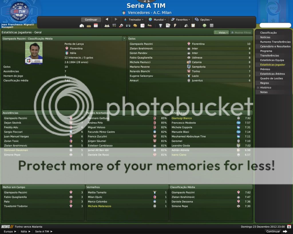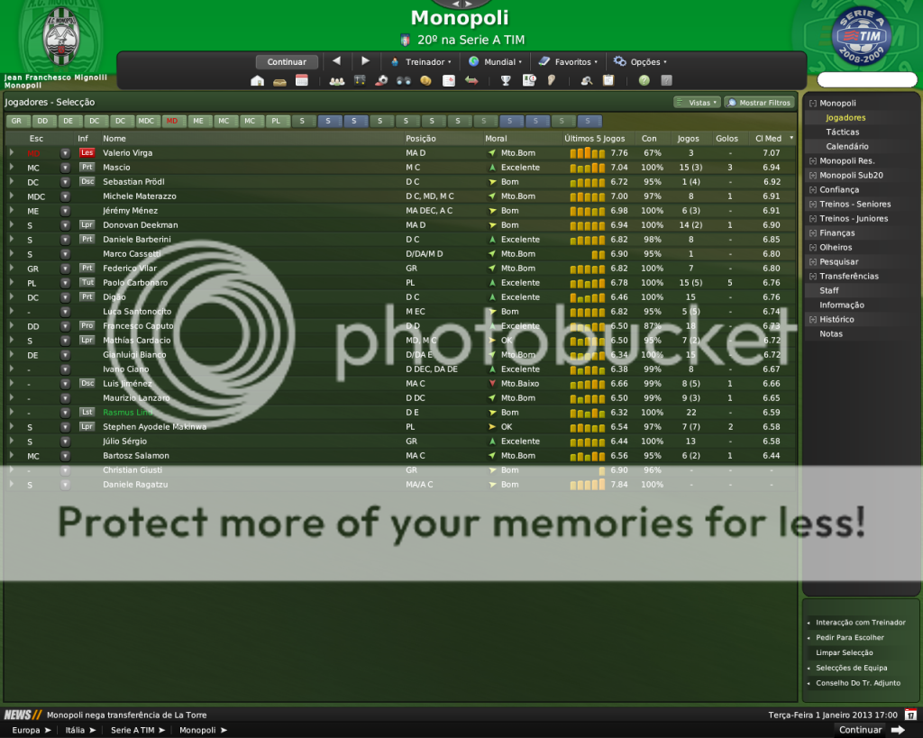 Jirimias Postado 14 de Abril 2009 Autor Denunciar Postado 14 de Abril 2009 Ufa, acabou o ano!Como esperava por este momento de parar de perder hehe.Até que o nosso último jogo foi bom, vencemos um jogo que deveríamos ter perdido, aliás o FM tem este dom de motivar bastante uma equipe em desespero, sempre lembrando que estarmos nesta situação é normal. Associazione Calcio Monopoli Dejá vu Como na temporada passada, fomos eliminados pela Roma, na mesma 1º eliminatória e pelo mesmo placar.Totti esteve infernal e olha que ele está bem acabadinho.A Roma venceu como era esperado, goleou de forma merecido e classificou como pedia o figurino, a nós resta apenas a busca pela manutenção. Associazione Calcio Monopoli E agora quem poderá nos defender? Lá se vão 17 rodadas, e hoje sete pontos nos separam da fuga do rebaixamento, nem parece muito já que uma pequena sequência poderia diminuir bem esta margem, o problema maior é conseguir uma sequência de bons resultados. Vamos aos últimos resultados: No último jogo , um alento: uma vitória sobre o Gênoa, apesar de ser uma gota no oceano, serviu pelo menos para terminar o ano com alguma esperança.Carbonaro voltou a marcar depois de 525 minutos sem fazer um gol, mascio também voltou a fazer uma exibição fantástica...seria a volta dos bons momentos do Monopoli? Fiquei feliz de ver o Pescara ali juntinho, teremos um confronto mais á frente que poderá valer 6 pontos nesta briga contra o rebaixamento.O Cagliari também está por ali, e quadno vejo o time deles superior ao nosso, eu começo a entender o porquê de estarmos nesta situação. Estatísticas Série A Tim : Série A - Clubes | Série A - Jogadores Associazione Calcio Monopoli Próximos passos. Não vou disponibilizar, por enquanto ,as estatísticas dos jogadores pois eu tirei a SS após algumas negociações.Abaixo relacionei alguns pontos que trabalharei neste período sem jogos: Negociar Kerlon: já se contundiu duas vezes nesta temporada, e ainda assim reclama titularidade.Wisla estaria interessado nele.A transferência deve rondar uns €2M, nada mau para um jogador que veio a custo zero.Negociar Meira: apesar de ser um jogador útil, teve uma grande queda de atributos, como há interesse de alguns clubes, vou negociálo.Concretizar a venda de Marsili: Por €6,5M e mais 20% na próxima transferência o central espetacular foi negociado com a Lázio.Resolvendo com isso dois problemas: o relacionamento de alguns jogadores, já que Marsili era desafeto de um grupo de jogadores e os problemas financeiros, pelo menos provisoriamente.Contratar um zagueiro que também seja médio-defensivo: Estou aguardando os relatórios do Brasil e da Argentina para chegar ao nome ideal. Citar