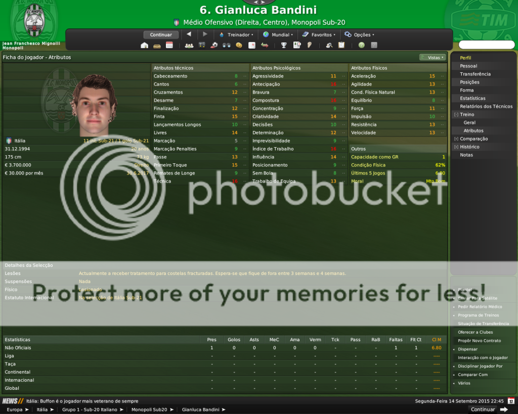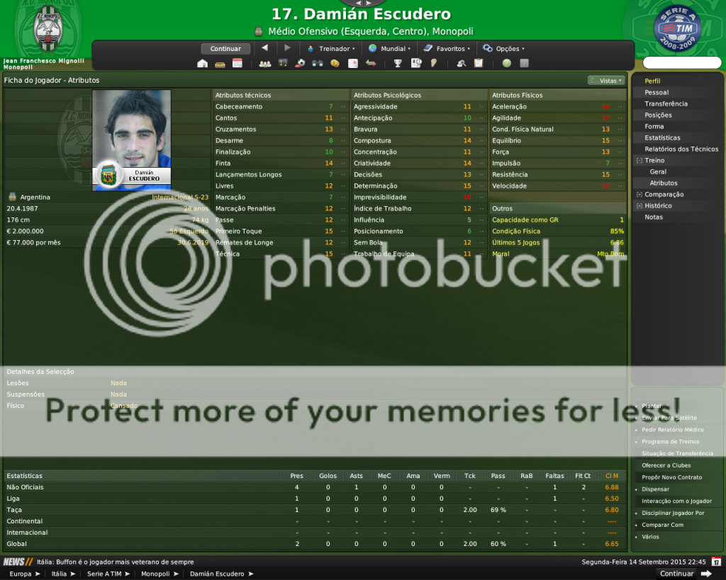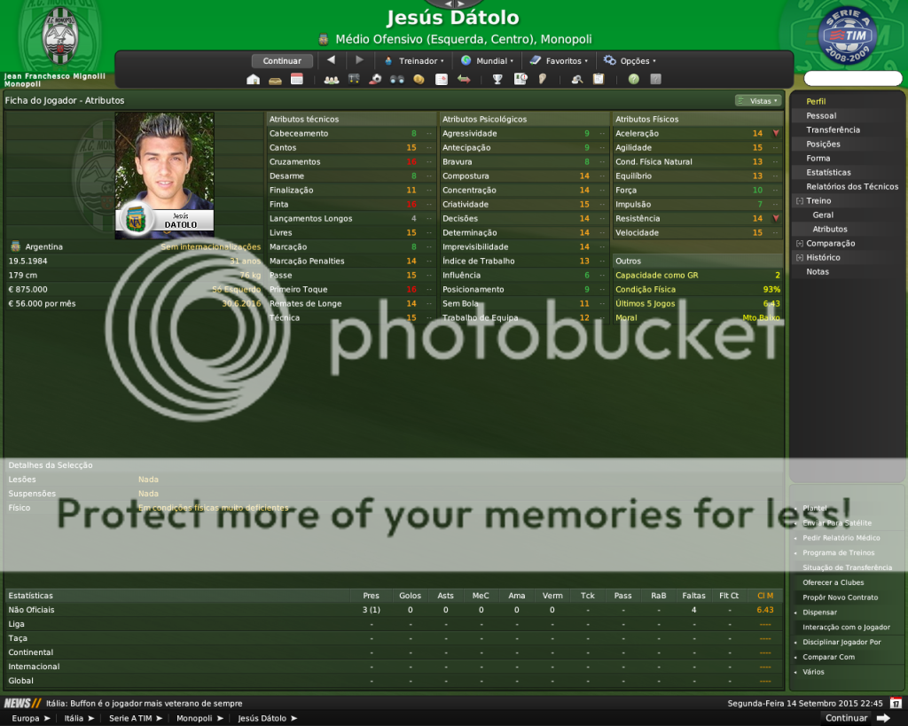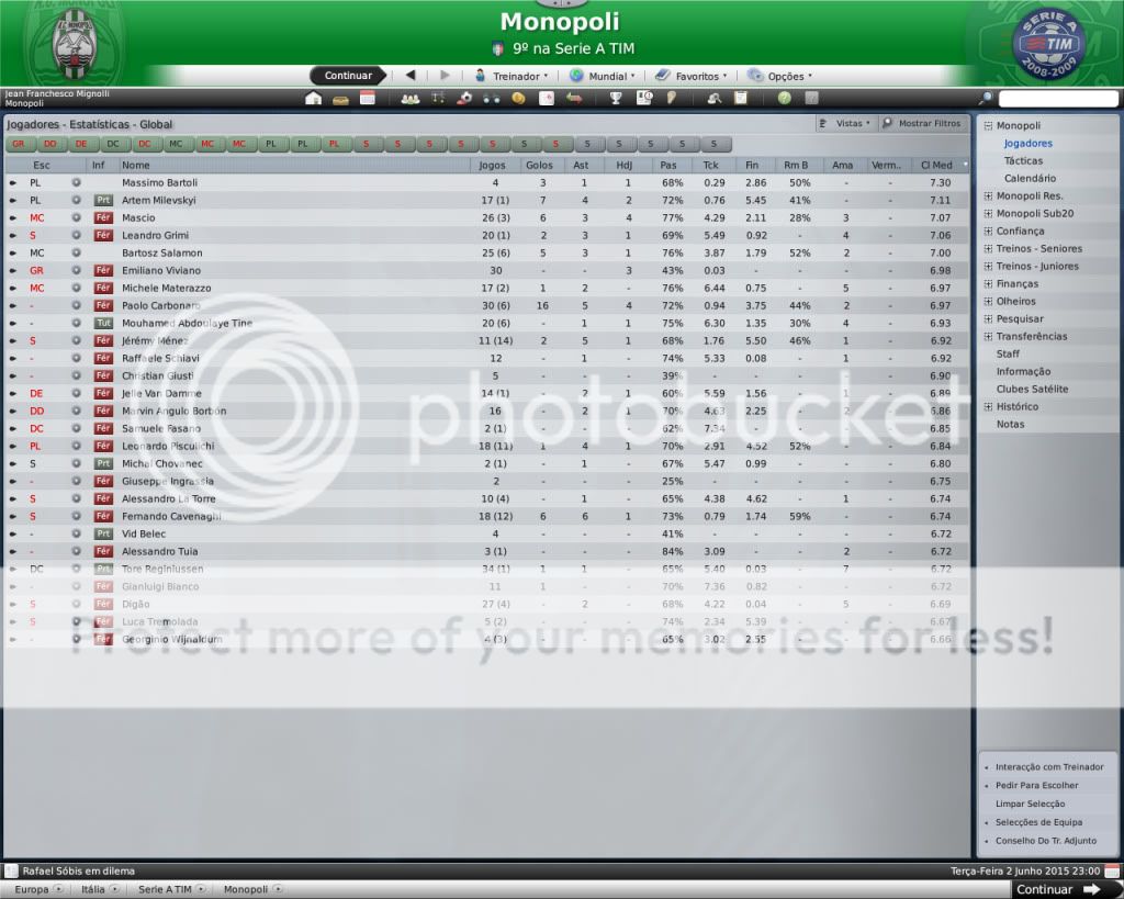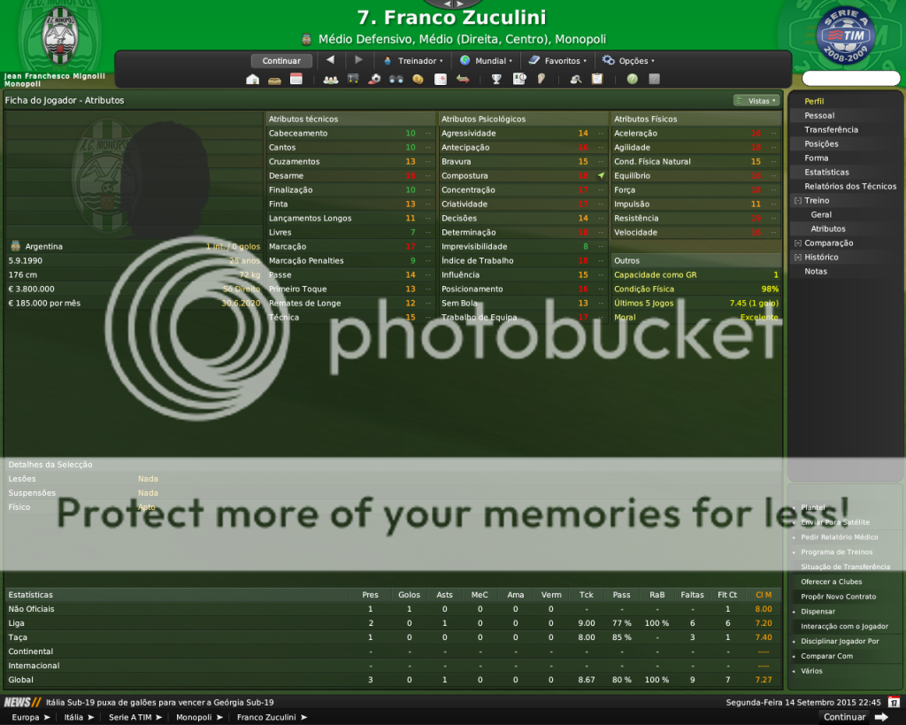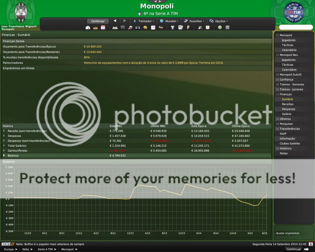 Jirimias Postado 16 de Maio 2009 Autor Denunciar Postado 16 de Maio 2009 A.C. Monopoli Jogos e Tabelas /Fala Treinador! Chegou a hora de resumir a temporada e apresentar as expectativas da próxima temporada, para isso resolvi abrir mão da ficção entre uma temporada e outra. Quando iniciei este save havia traçado objetivos a curto,médio e longo prazo, em nenhum deles citava a posssibilidade de chegar à Europa, nem só pelas limitações do clube, mas pelas minhas próprias de manter um save que precisaria de persistência, mas aí chegamos à uma nova realidade: o clube já é conhecido na Itália, e uma nova colocação acima da metade da tabela juntamente com a base para o futuro certamente consolidará a equipe na elite italiana. Pelo segundo ano seguido , o Monopoli apresentou número negativo em suas finanças. Então o foco desta temporada será a solidificação financeira e a consolidação da equipe na elite com um desempenho tão bom quanto o anterior, de preferência com uma classificação para competições européias.No caso da solidificação financeira ela deverá ser obtida com a venda de alguns jogadores, mas será uma venda cautelosa e criteriosa já que é importante manter a base do time para que o clube tenha um time competitivo para temporadas futuras.A negociação dos contratos será também uma alternativa, e a razão para algumas despedidas. Marcados em verde estão os objetivos cumpridos: No caso do estádio, somente resta a construção de um novo, se para expandir 1.800 demorou tanto imagine para contruir... Já as estruturas de treinos vem melhorando gradualmente, não me preocupa mais. Objetivo a longo prazo: Consolidar o Monopoli na elite italiana Objetivo a médio prazo: Estruturar o Monopoli ( aumento do estádio, melhora na estrutura dos treinos e solidez financeira ) Objetivo a curto prazo : Promoção na primeira temporada Já somos uma hipótese. Rumo à Europa!. Enfm um fornecedor de material esportivo decente. Resumo Campeonato Italiano Números do Monopoli Histórico de Temporadas Resumo das temporadas2008/2009Série C2CampeãoPromovidoSupertaça C2 2009/2010Série C1 3º colocadoPromovido Copa Itália C 2010/2011Série B12º colocadoManutenção Nenhum 2011/2012Série BCampeãoPromovido Nenhum2012/2013Série A18ºRebaixado Nenhum2013/2014Série BCampeãoPromovidoNenhum2014/2015Série A9º colocadoNenhumNenhum Citar