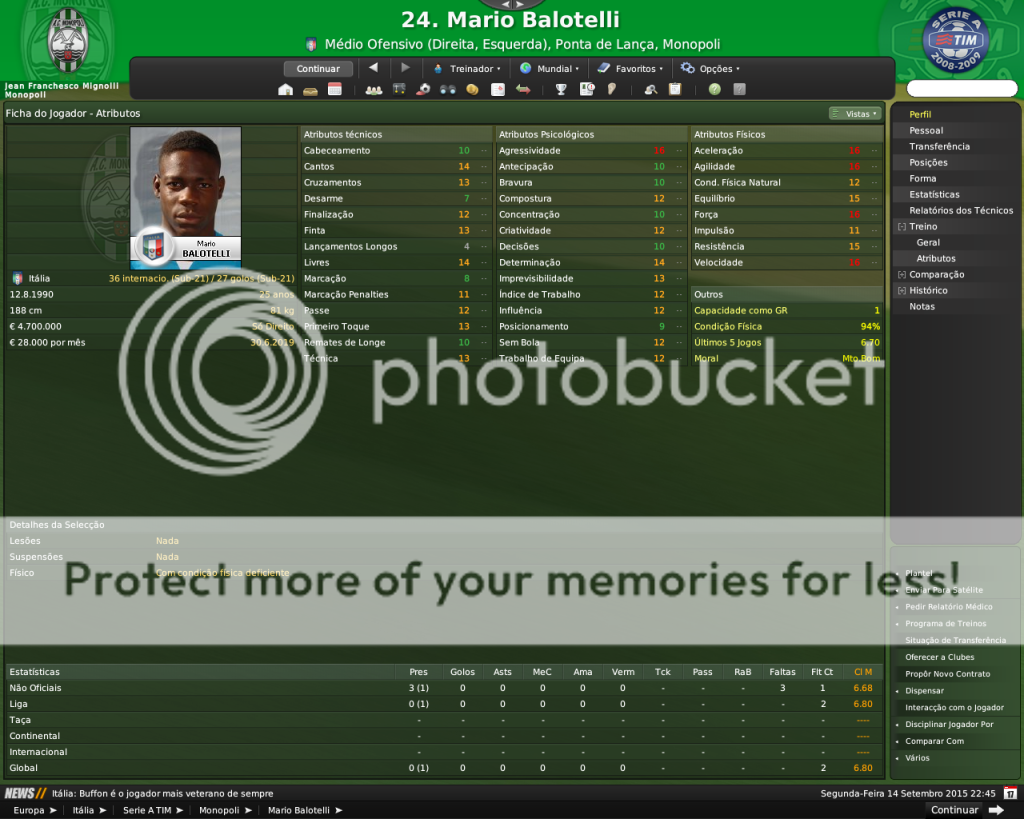 Jirimias Postado 19 de Maio 2009 Autor Denunciar Postado 19 de Maio 2009 Não conseguiu superar meu Universitario que meteu nada mais que 13 a 0 num time infeliz lá do Equador. Quem vinga desse reforços aí? Acho que o Dátolo é só drible mesmo... Balotelli tá fraquinho nos atributos. Gostei do Zuculini. Que físico, hein? Ficou legal as imagens redondinhas. (Essa já é a centésima skin? :heh:) è não foi dessa vez, 13x0 era muito pra mim. Olha, me arrependi muito,Zuculini é o melhor. Fiz um teste arrendondando e deu certo,ficou legalzinho. Centésima quinta pra ser mais exato. :heh: assustou na pre-temporada huaheuahue mas das derrotas, todas foram contra times fortes (exceto o salernitana) shauhsua nem me fala, fi zum monte de testes táticos, posições e etc.Mas espero coisas melhroes qdo as coisas ficarem sérias. melhorando bastante o nivel dos reforços...sem brunos cazarines da vida hauhauhauhauhauhauhuaa boa temporada!acho que pega uma vaga na UEFA hsuahsuhaushuahsua Bruno Cazarine só lembrei que eu havia comprado pq recebi 10% do passe dele . Rumo à Uefa. ;) Citar