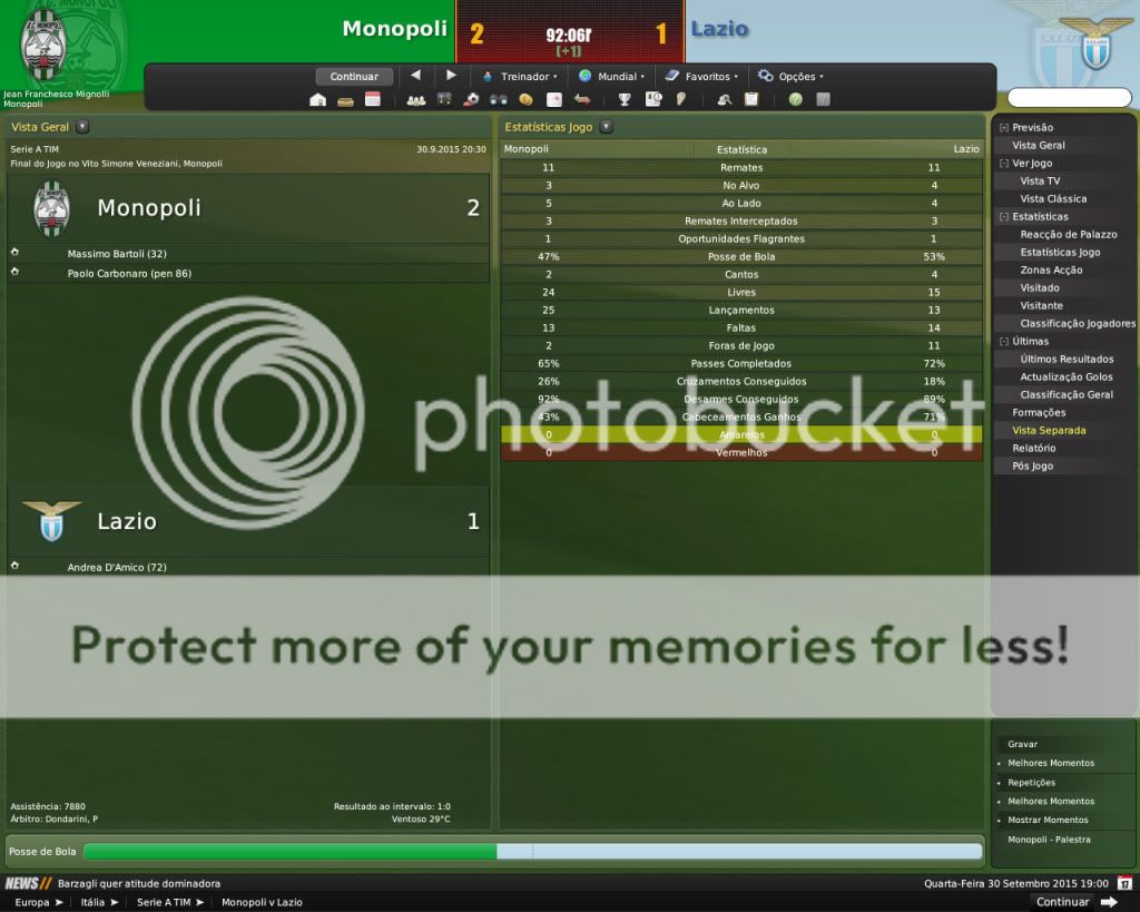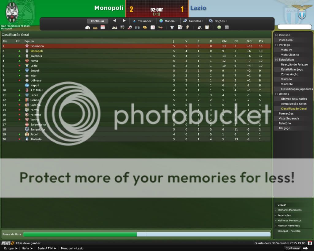 Jirimias Postado 20 de Maio 2009 Autor Denunciar Postado 20 de Maio 2009 Chega de pensar pequeno... ...queremos a liderança!. Escalação | Estatísticas "Esta é a temporada de afirmação do Monopoli" - as palavras de Jean Franchesco pareciam otimistas demais depois equívocos cometidos com alguns reforços, mas há de se concordar treinador foi preciso nas palavras.O começo do Campeonato Italiano está sendo qualquer coisa de espetacular, vice-líder invicto após cinco rodadas, o Monopoli anda surpreendendo a Itália. Ontem foi a Lázio a nova do Monopoli vítima.Em grande noite de " Máximo Bartoli" , que retornava de lesão, o Monopoli abriu o marcador .Bartoli, o pretendido por todos, recebeu cruzamento de Dátolo da esquerda e cabeceou no contrapé de Espinoza. Melhor no jogo o Monopoli continuava criando chances e perdendo gols.Veio o segundo tempo, e a Lázio estava decidida a mudar as coisas.De fora da área D' Amico surpreendeu o selecionável italiano, Viviano, com um belo chute de fora da área no ângulo.O gol foi bonito,mas fez raiva. Quando as coisas pareciam certas e o empate já nos conformava, Bartoli sofre pênalti para Carbonaro enfim marcar seu primeiro gol no ano.Vencemos por 2x1. Últimos jogos Últimas notícias Menez é o destaque da temporada Monopoli eliminado da Coppa da Itália Escalação de "equipe B" custa caro ao Monopoli Números do Calcio Menez é o artilheiro do Monopoli na temporada Enzo Corinna Enzo Corinna é um dos fundadores da Bad Boys, tem 51 anos e é artista plástico. Citar
