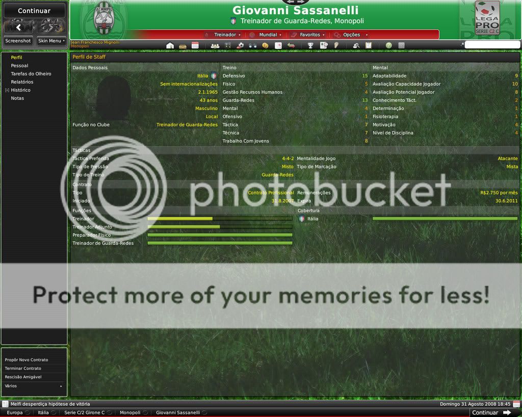 Jirimias Postado 14 de Fevereiro 2009 Autor Denunciar Postado 14 de Fevereiro 2009 Rapidamente é meio complicado, masss tu entendeu o que eu quis dizer, isso é o que importa. USHAUHUSHUAS :heh::heh: hsuahsuhaushau entendi sim :lol: Dificil este tipo de aventura. Mais está muito interessante! Vlw, apesar da dificuldade tem sido legal jogar o save. Tem que ter ambição mesmo. Senão, não dá certo. É vero! ;) O meu clube na Bielorrússia ainda vale menos 90 mil € :lol: Fogo o Paolo Carbonaro dá mesmo um jeitão, quem me dera ter um também Bem bela vitória no amigável, vamos ver como vai ser na liga Boa sorte já agora não conseguiste encontrar uma foto do estádio?queria comparar com meu hehehe. E por favor não ofereça saco e batatas pelo Carbonaro, pq a oferta teria que ser feita ao Palermo. :lol: A estréia foi boa, manter a qualidade na liga aí já é outra história, Eu até achei, mas a imagem era gigante, tinha que editá-la e acabou que eu me esqueci, mas vou ser arrumo aqui. To acompanhando aqui...ta mt bom Queria tira uma duvida: vc só dize q iria contrata jogadores indicados pelos olheiros, mas qd vc contrato o unico ate agora, n foi por indicação do olheiro, mas foi por um suposto interesse seu, e ai sim vc mando o seu olheiro prepara um relatorio...Vc só vai contrata por indicação do lolhero ou vc vai manda fz um relatorio de qm ele n indico, pra vc ai sim contrata(n sei se fico confuso hehhehe) Otra coisa é que se vc vai olha perfil de jogador ou não Obrigado. Sim, mas as regras da LLm foram feitas em versões antigas do Fm onde não tinha esta de especulação e tal, então ainda não li sobre um consenso a respeito dos jogadores que são apresentados pelo jogo, entenda, não fui eu que o busquei o nome dele, ele chegou pela indicação da imprensa, eu deveria ter especificado isso lá, mas me prendi ás regras da LLm que são de versões antigas.Mas só fui contratá-lo através do relatório e assim é feito os olheiros indicam jogadores para mim e não o contrário, exceto quando estes nomes são ventilados pela imprensa, que sugere que houve um interesse anterior ao meu pedido de relatório por alguém do clube.E olhar o perfil, só o fiz nos três indicados pelo adjunto, depois não o fiz até pq não adianta, pq vc não consegue ver poquíssima coisa e tb desanima pra caramba contratar qdo vc olha :lol: . Objetivos realistas, pode subir (é dificil) e depois que conseguir subir, acredito que primeiro estruturar um pouco o clube, nem q deixe o futebol (um pouco) de lado, mas sempre pensando na estrutura e na reputação do clube, pra depois pensar em nova promoção! O ruim que a estrutura muitas vezes depende dos resultados em campo, mas tb é horrível quando a equipe faz muito em campo e por trás ha uma estrtura de time de terceira, isso aocnteceu no save que fiz com o Ribeiro Junqueira.Por enquanto estou preocupado com a promoção, que seria um passo a frente para a restruturação, mas depois é mesmo jogar com o tempo. Citar