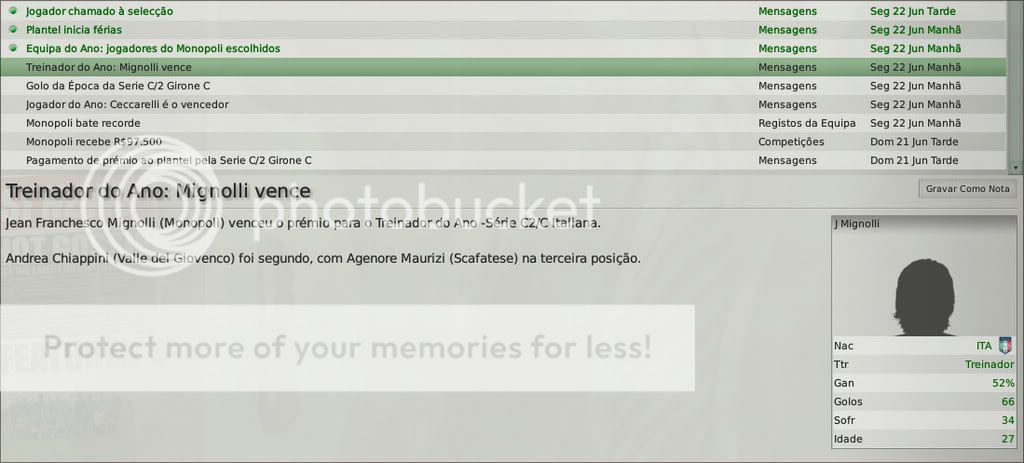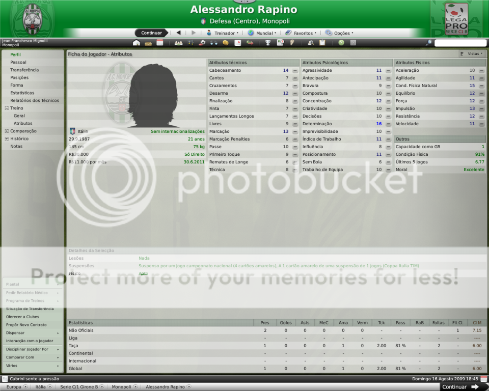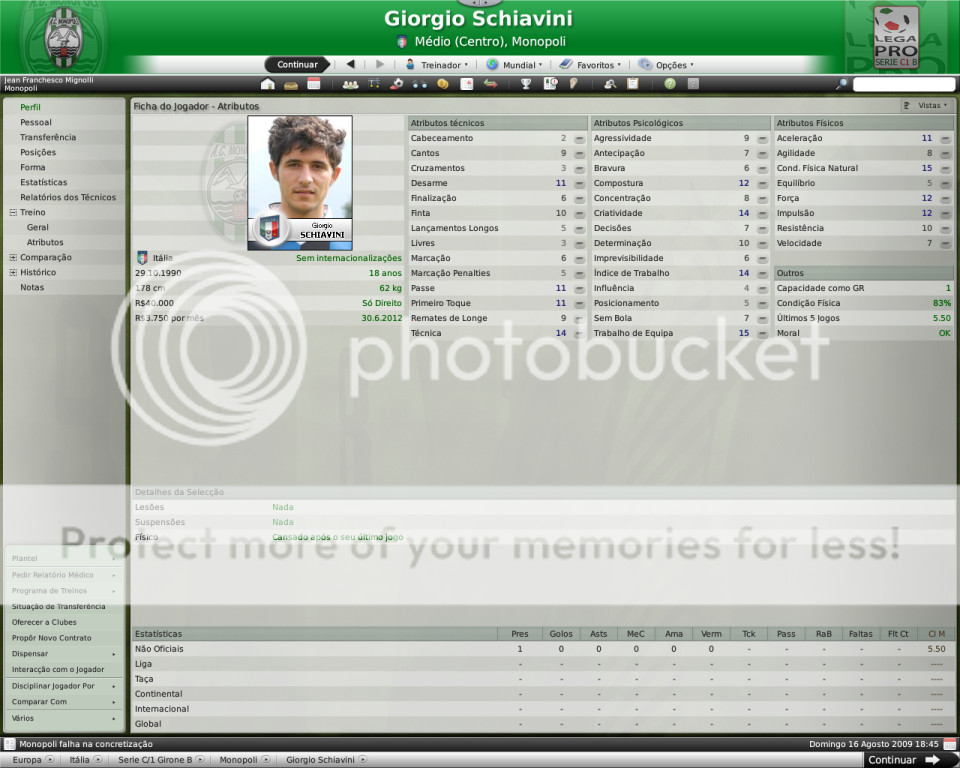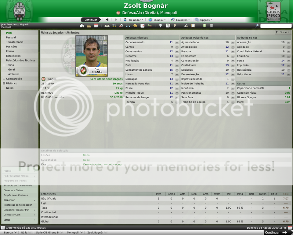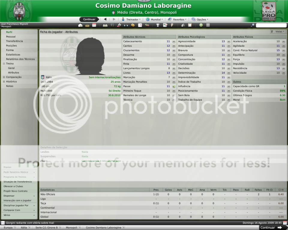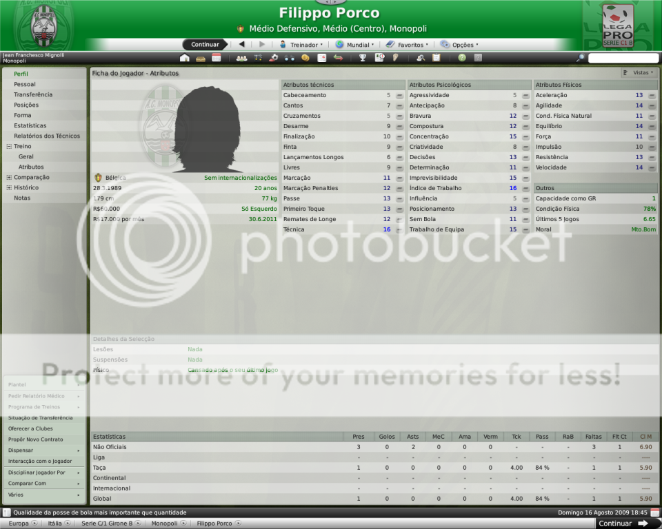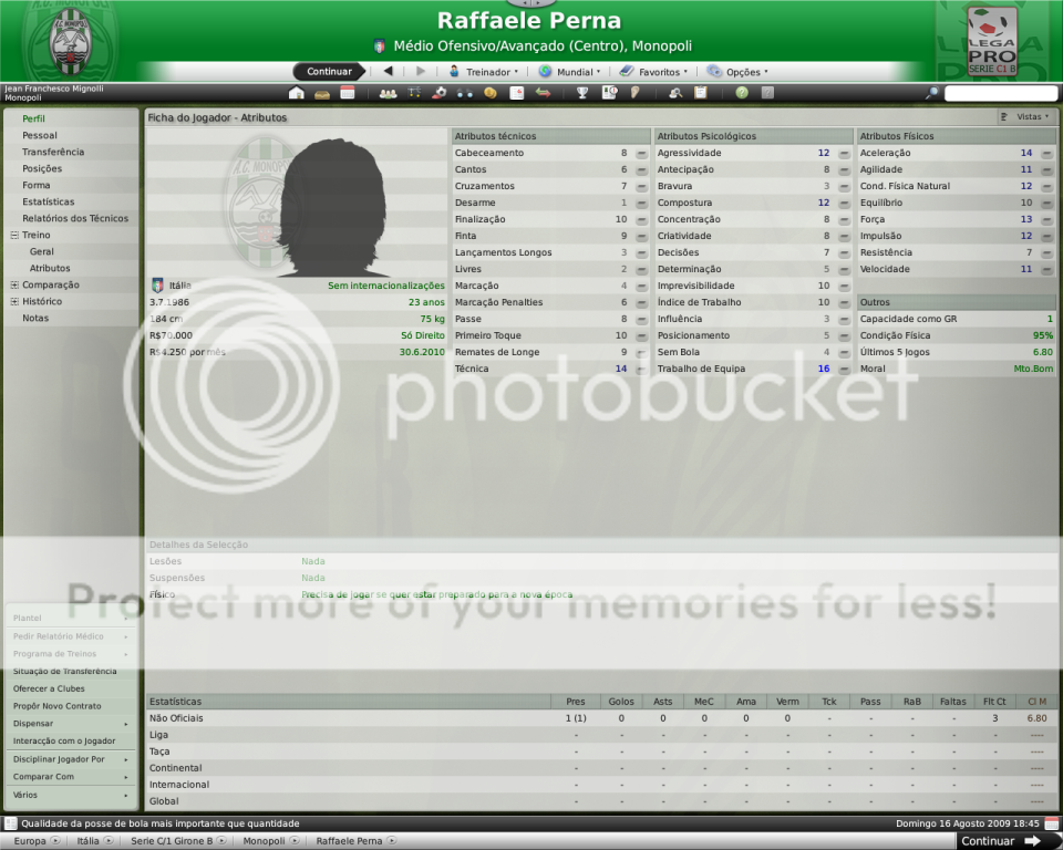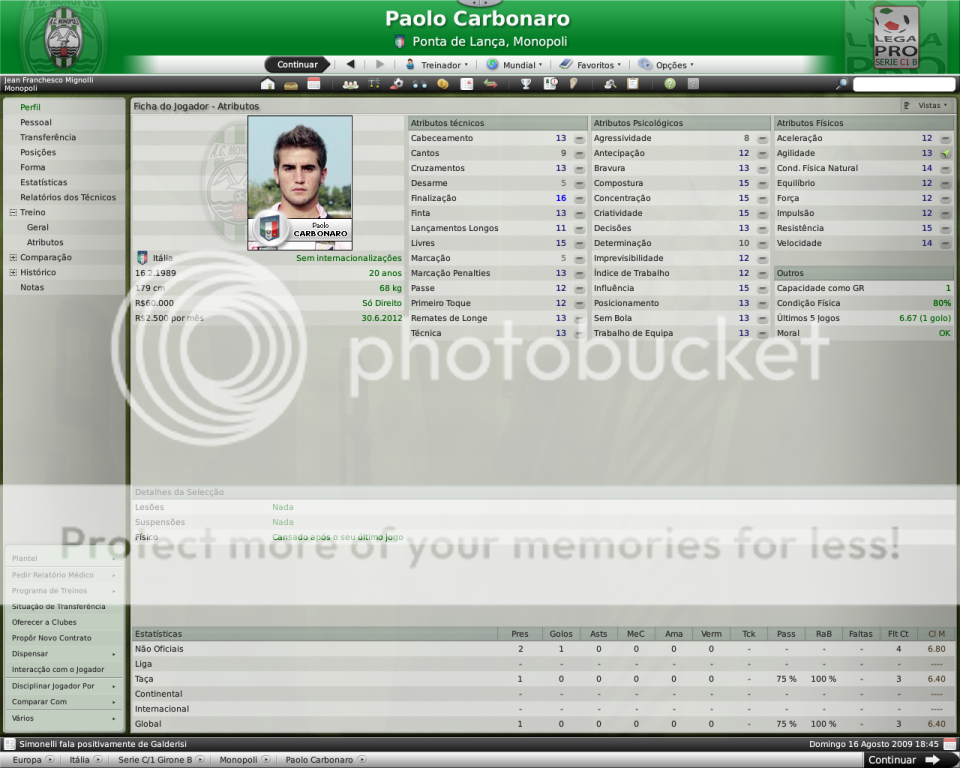 Jirimias Postado 11 de Março 2009 Autor Denunciar Postado 11 de Março 2009 2009/2010 - Um novo Monopoli Esta temporada já promete ser uma temporada bem tranquila, pelo menos financeiramente.A diretoria disponibilizou mais de R$250m para salários, ou seja, dobrou a verba para as renumerações, e de lambuja ainda liberou outros R$70m para transferências.Esses R$70 mil apesar de ser pouco, foi o suficiente para a realização de um sonho meu e de todos torcedores do Monopoli: Paolo Carbonaro. Sobre Carbonaro falarei mais abaixo.Mudando de assunto, na intenção de resguardar o meu emprego no Monopoli, não prometi a promoção, mas sim a classificação na metade da tabela, depois olhando superficialmente os times da Série C1, notei que talvez fosse mais seguro aceitar a sugestão dos apostadores em apenas lutar contra o rebaixamento. Mas de qualquer forma, esse negócio de lutar para não cair não me agrada muito. Mudanças na equipe Após alguns momentos turbulentos, enfim consegui garantir que a base do Monopoli fosse mantida.Perdemos alguns jogadores, mas estes fizemos até alguma força para que saíssem.Juntaram-se ao clube um bom número de jogadores que acabou trazendo um outro problema: as limitações de jogadores impostas nestas divisões inferiores: limite de 16 jogadores com mais de 23 anos e limite de 14 jogadores com até 21 anos.Esta restrição acabou tirando da equipe Lacarra e Tucci, o último ainda conseguiu um lugarzinho no Messina, onde vai ficar emprestado por uma temporada. Mas as mudanças não aconteceram apenas no plantel: com a subida de promoção a diretoria liberou mais 7 vagas de preparadores físicos, e a partir daí coloquei anúncio para preenchê-las e finalmente ter um sistema de treino no mínimo decente.Mais informações sobre as mudanças na comissão técnica voc~es podem conferir na aba "notícias". 2009/2010 - Transferências Com apenas um olheiro, já que o outro deixou o clube por uma mixaria do Cesena, consegui alguns reforços que realmente me surpreenderam. Kingsley Umunegbu, Giorgio Schiavini e Salvatore Papa vieram do dia de testes. Cosimo Damiano Laboragine e Raffaele Perna vieram por indicação de confrontos diretos com seus antigos times.Pern,a por exemplo, marcou dois gols em um dos confrontos contra o Monopoli. Carbonaro dispensava apresentações, sua boa temporada vestindo a camisa do Monopoli dizia tudo, mesmo tendo jogado metade dela devido à uma lesão.Ele veio agora de forma definitiva ao clube, em uma briga feia travada com alguns notáveis da Itália e da Europa, que no fim o atacante aceitou nossa proposta, o dobro do que recebia no Palermo e a garantia de que será titular.Carbonaro avaliado na temporada passada em R$2,5M custou apenas R$60 mil e 20% ao Palermo em uma futura transferência: a lesão na temporada passada não foi mesmo uma boa? Os demais jogadores foram frutos do relatório de Montanari, o olheiro, durante todo ano passado. Kingsley Umunegbu | Alessandro Rapino | Cosimo Damiano Laboragine | Filippo Porco | Gaetano Grieco Giorgio Schiavini | Giulio Falcone | Paolo Carbonaro | Paulinho Betanin | Raffaele Perna | Salvatore Papa | Zsolt Bognar 2009/2010 - Jogadores Monopoli Este é o plantel do Monopoli para disputa das competições da temporada, talvez ainda seja adicionado algum jogador para as posições de goleiro e médio defensivo, que são, ao meu ver, as que precisam de mais opções. 2009/2010 - Pré-temporada Fizemos neste ano uma pré-temporada menor, e nem foi proposital.Estava tão envolvido nas negociações de Carbonaro e de outros jogadores que esqueci de marcar mais jogos.Nos três jogos, dois deles contra equipes reservas da Série A, não conhecemos a derrota, um bom indício que não se confirmou na estréia, e ao mesmo tempo, despedida da Coppa da Itália. 2009/2010 - Coppa da Itália Série A TIM Avelino, uma das equipes que teremos que encontrar na nova divisão, fez uma visita no mínimo ingrata em nosso estádio.Em um jogo apático, digno de vaias, o único caminho para o gol talvez fosse um chute de fora da área ou uma jogada parada.Sorte do Avelino que fez melhor uso do "caminho certo", com um chute de fora da área liquidaram a partida nos descontos do primeiro tempo, muito longos por sinal, 8 minutos sem justificativa alguma, a não ser a vonta de do árbitro de dar uma mãozinha. Mas sme choramingos, que vem a Série C 1, que venha Avelino e outros... A nova comissão técnica A diretoria liberou enfim novas vagas para a comissão técnica, e conseguimos alguma qualidade nos nossos treinos, que antes eram de uma ou duas estrelas.Dois nomes foram dispensados: um preparador físico e o o adjunto retardado Paoloni.A busca agora é para o substituto de Paoloni, e estou confiante que os candidatos tenham qualidade para merecer um cargo tão honroso. :lol: O que mudou no Monopoli? Ainda me pergunto cadê o meu nome entre os favoritos do Monopoli.Brincadeiras à parte, eu me conformo com o prêmio de melhor treinador da Série C 2 recebido junto com o Ceccarelli, que ganhou e mereceu o prêmio de melhor do ano. Mas pergunta é: o que mudou de um ano para cá? Informações do clube Antes / Depois "Associazione Calcio Monopoli" Ano fundação : 1966 Situação : Profissional Lendas : Francesco Bitetto e Fernando Alberto Galetti Ícones: Nada Pessoal Favorito: Nada Principais rivais: F. Andria, Barletta e Brindisi Preço médio do ingresso: R$35,41 / R$51,00 Preço pacotão de ingressos para toda a temporada: R$418,50 / 548,00 Detentores do bilhete para toda a temporada: 459 / 1848 Valor estimado: R$1,5M / R$1,7M Previsão da Imprensa: Série C2 7º / Série C1 14º Maior artilheiro do clube: Fernando Alberto Galetti : 35 gols * o número de detentores dos bilhetes anuais não foram atualizados na info, pois a ss foi tirada antes do fechamento do número de sócios. Citar