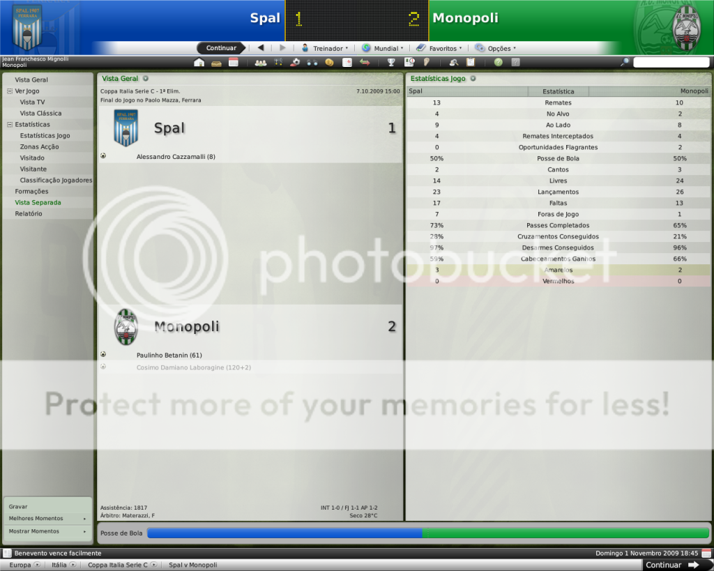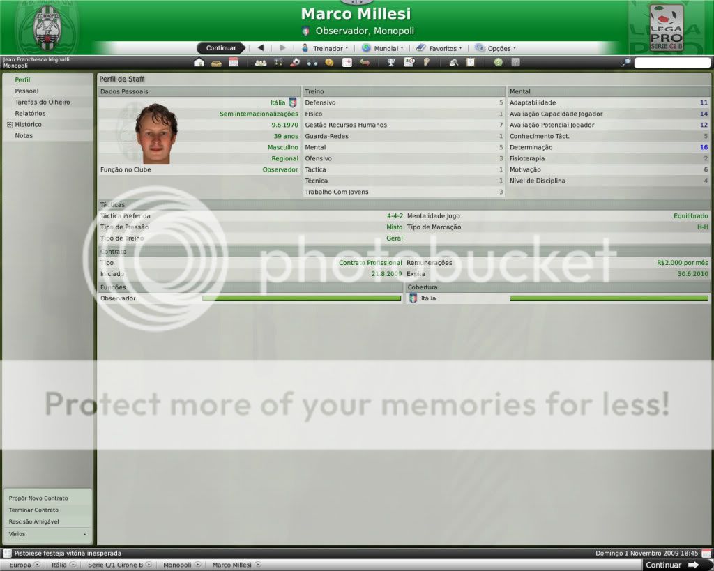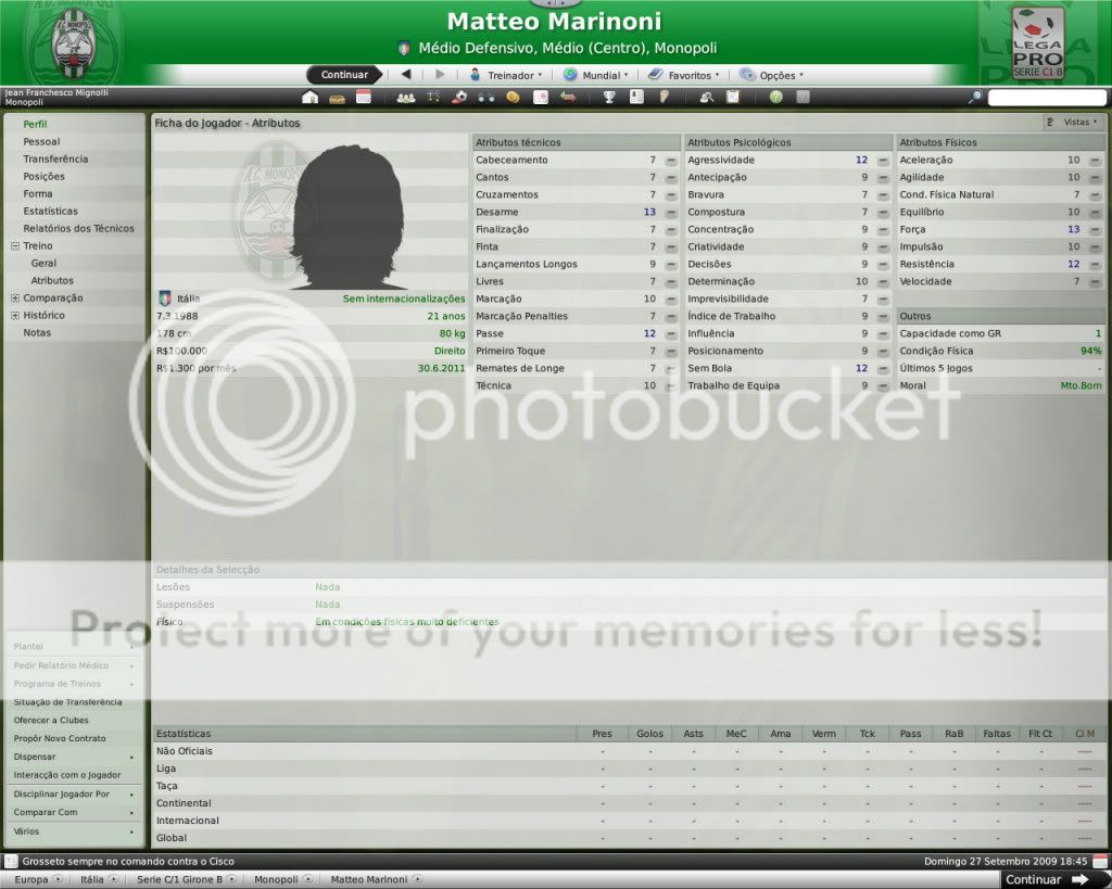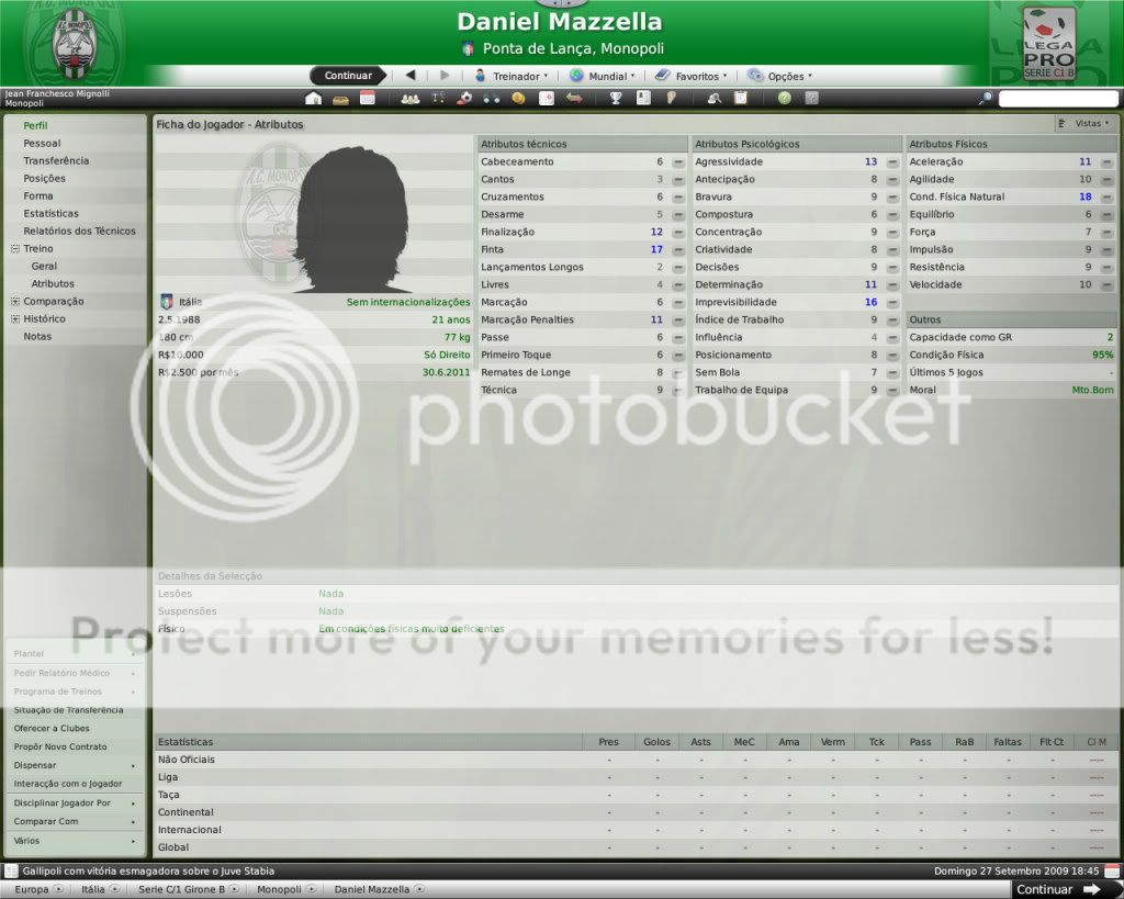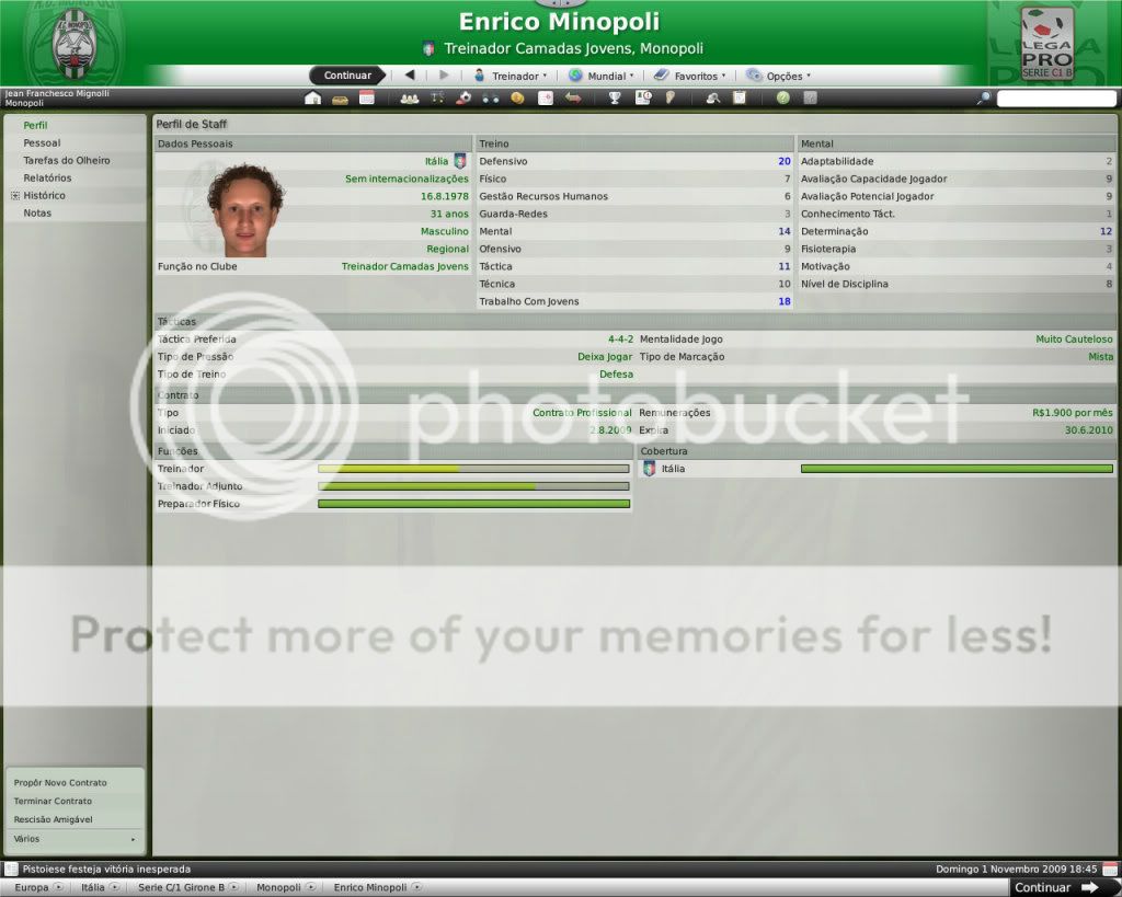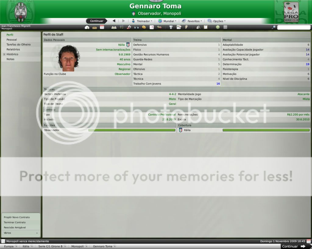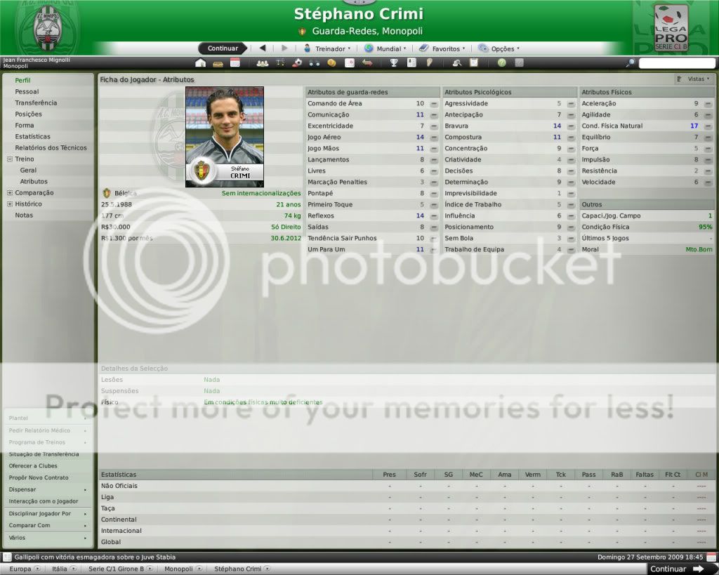 Jirimias Postado 13 de Março 2009 Autor Denunciar Postado 13 de Março 2009 2009/2010 - Uma queda esperada Não posso reclamar, a quarta posição que hoje nos daria uma vaga nos playoffs é um feito, isso é inegável,mas sempre fica aquele gostinho amargo de que poderia ter sido um pouco diferente naqueles jogos em que a bola rejeitou entrar nas redes adversárias. Como eu esperava, a ausência de cinco titulares dificultou muito o desempenho da equipe, tanto que à medida que eles foram retornando de lesão a equipe voltou a vencer.Para evitar novo problema com as lesões em treinos, reduzi os treinamentos físicos e aeróbicos, uma medida que deu alguns sinais de melhora, contudo ainda é cedo para dizer que as lesões em treinos estão solucionadas.Agora temos dois jogadores no departamento médico. ambos lesionados em jogos: Lorusso, que voltou ao time depois de ter sido condenado à reserva ainda no começo da temporada passada, portanto não é uma perda, e Zsolt Bognar, nosso lateral direito que após recuperado de lesão, voltou a se lesionar e passa a fazer parte do seleto grupo dos Canelas de Vidros S/A. 2009/2010 - Série C/1 Quando eu falava que as lesões comprometeriam o desempenho da equipe não era exagero, e não só por todos serem titulares, mas principalmente pelo fato de três jogadores fazerem parte do setor defensivo, que diga-se de passagem, passou por momentos agudos.Marsill, o nosso jovem espetacular fez muita falta na zaga ,assim como Falcone, pois os três primeiros adversários jogavam de uma forma diferente do que o Monopoli tinha encontrado até agora: o tridente, com dois pontas abertos e um homem de área: e aí como fez falta ter três zagueiros para matar estes excessos do ataque adversário. O goleio Ingrassia também fez falta, acho que só na ausência dele pude perceber que ele era um bom goleiro. Contra o Sangiustese, a terceira vitória consecultiva e a marca de cinco jogos sem perder.A marca só foi alcançada faltando oito minutos para o final, em uma cobrança ensaiada de falta: ensaiada na hora mas muito bem aproveitada por Grieco. A classificação ficou assim: os dois times à nossa frente estão com apenas um ponto de vantagem, enquanto o Avellino, que encabeça a tabela, colocou uma vantagem tranquila sobre os outros graças á uma campanha impecável até o momento.Só vale ressaltar que eles ainda não jogaram contra nós nesta Série C. 2009/2010 - Coppa Itália Série C Com a eliminação da Copa da Itália Série A, restava ainda tentarmos a sorte na Copa da Itália Série C.Vencemos a nossa primeira partida com alguma dificuldade, e depois encontramos também dificuldades contra o Canavese, que nos trazia boas lembranças da conquista da Supertaça.O jogo que sno classificou para a 3º Eliminatória confirmou a boa fase do atacante brasileiro Paulinho Betanin, que é o atual artilheiro da equipe. Com a vitória seguimos para a terceira eliminatória que não é eliminatória, aqui jogaremos contra os outros dois clubes em turno único.Para seguirmos para a semi-final é necessário consguirmos a primeira colocação do grupo. 2009/2010 - Nova comissão técnica Conforme falei anterioremnte, reforçamos o quadro de staffs, o que já causou bons efeitos de treinos aos nossos jogadores.A comissão técnica agora precisa apenas de um adjunto, já que rescindi com o que estava no grupo desde a temporada passada por achar ele bem limitado.No entanto, um bom adjunto é uma coisa difícil de encontrar por aqui, já foram abertos dois anúncios e sem nenhum bom resultado, no terceiro aberto ontem espero contratar um para me auxiliar,ainda que não consiga alguém de grande qualidade. A.Cacciatore | A.Pittalis | C.Bonnano | E.Minopoli | F.Benincasa | G.Toma | G.Giordano | L. Marcato | M. Millesi | T. Serra 2009/2010 - Nível de confiança da diretoria Citar