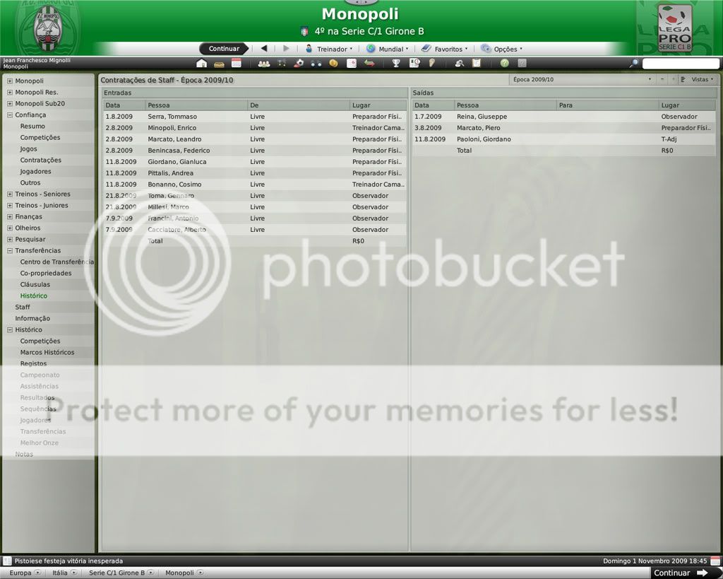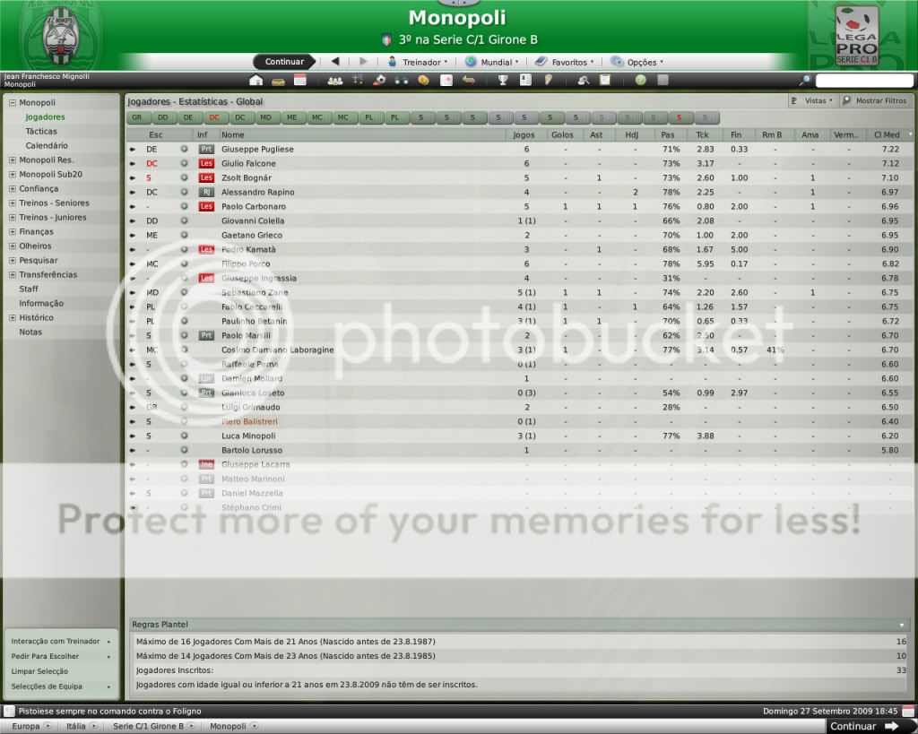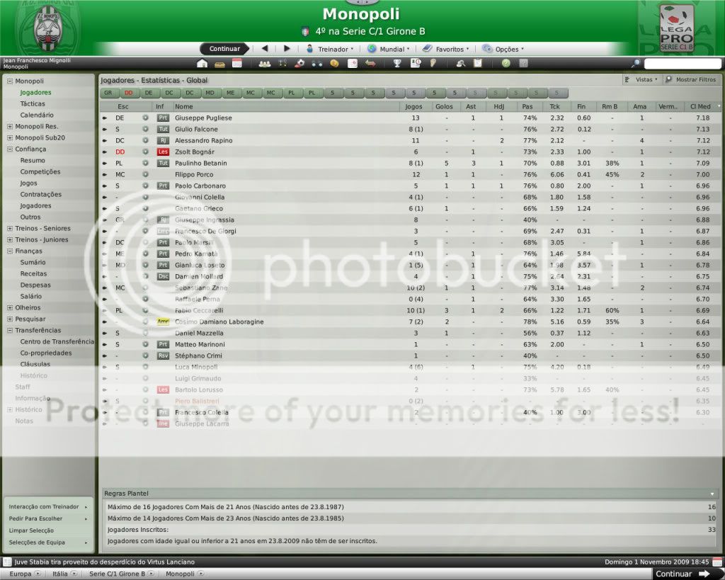 Jirimias Postado 12 de Março 2009 Autor Denunciar Postado 12 de Março 2009 2009/2010- Bom começo Acima das expectativas, é assim que o Monopoli tem sido nesta sua estréia na Série C1.Aparentemente chegar ao fim da competição na metade da tabela não será problema, o problema mesmo é acreditar demais em uma promoção ou até em um título tomando base este início de campeonato. Por outro lado, assim como os ouros times estamos ainda nos acertando, algumas peças ainda procuram se encaixar ao plantel e alguns jogadores ainda não apresentaram seu melhor.Um detalhe curioso deste início de temporada foi o fato do Fábio Ceccarelli não ter jogado nada nos primeiros jogos ao lado do Carbonaro, e quando o seu parceiro não pôde jogar devido à uma lesão, ele simplesmente jogou tudo. Falando em lesão, elas voltaram com força total neste início de temporada.O que me preocupa realmente é que Carbonaro novamente é nome certo no departamento médico, a terceira vez em duas temporadas.Semc ontar, que o departamento médico tem metade do time que vinha jogando, nem o goleiro ficou de fora.Triste! 2009/2010 - Série C/1 Os primeiros jogos da Série C1 prometiam ser negros.Os dois primeiros jogos eram contra Sorrento e Grosseto, duas equipes tidas como favoritas ao título desta divisão.Os jogos comprovaram que esses clubes mereciam este favoritismo,contudo, merecedores ou não, fomos nós quem tiramos vantagem nestes confrontos, dois empates contra os dois mais temidos. Sem temer mais ninguém, conseguimos uma sequência de vitórias: 3 nos últimos 3 jogos.Sequência importante para dar moral á esta equipe, e que será difícil de manter com a perda de 5 titulares. O nosso velho conhecido de Série C2 , o Valle, foi nosso último adversário nestes primeiros cinco jogos.Em casa, e neste momento com 4 titulares de fora por lesão, vencemos os visitantes pelo placar mínimo construído por Ceccarelli, de volta aos gols, logo nos primeiros segundos de jogo. A vitória nos colocou ali bem coladinho na liderança com Taranto e Avelino, dois adversários fortíssimos que teremos que superar se quisermos mais do que a metade da tabela. 2009/2010 - Mais caras novas Continuamos contratando até o fechamento da janela, são jogadores com idade até 21 anos e que não precisam ser inscritos:Daniel Mazzella (atacante), Matteo Marinoni ( volante), Stephano Crimi ( goleiro).Todos eles indicados pelo olheiro como boas contratações.Destaque para Mazzela que chegou a interessar ao Messina. Com estas contratações asseguramos nosso primeiro lugar na Velha Bota como o clube que mais contratou. 2009/2010 - Histórico de recordes Citar