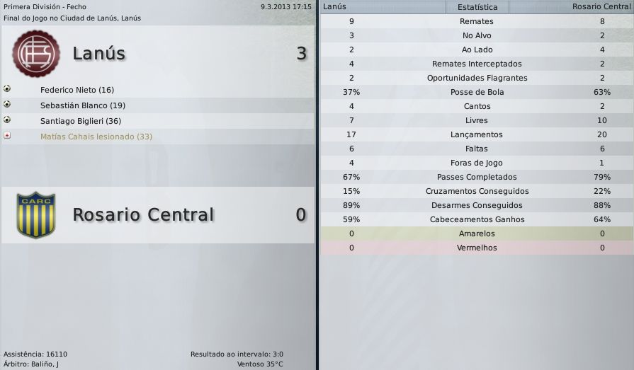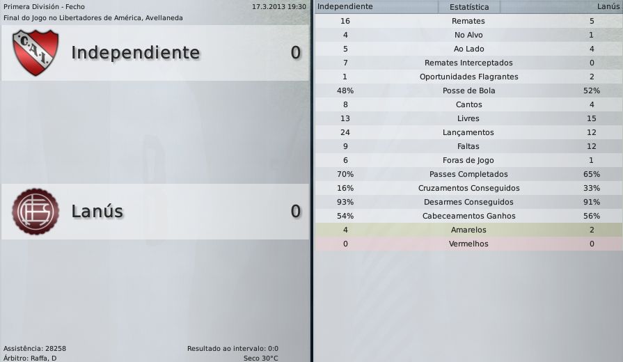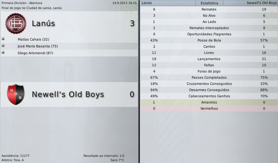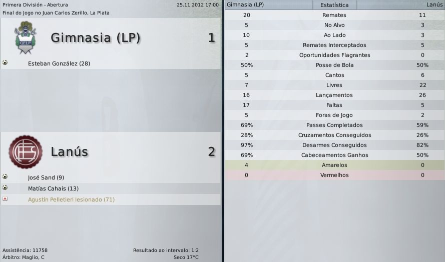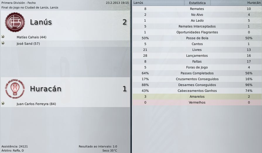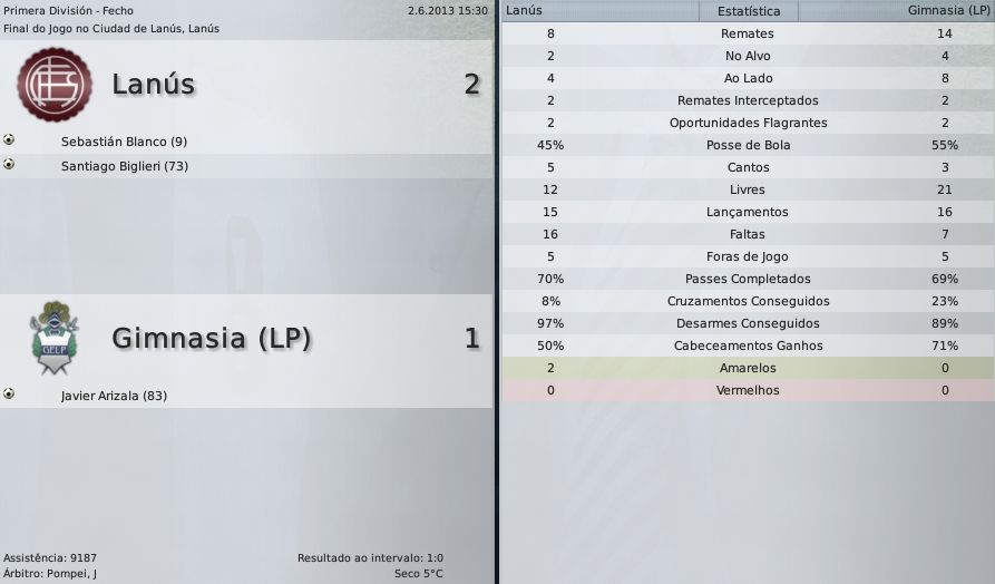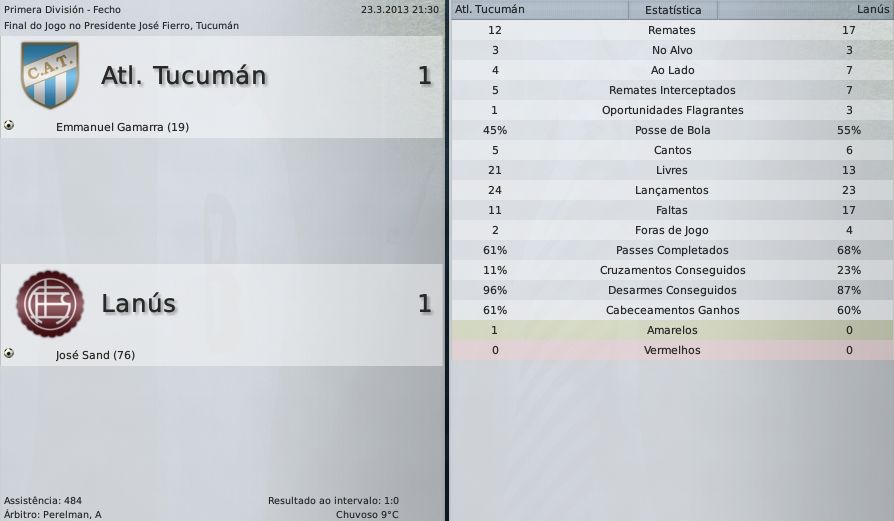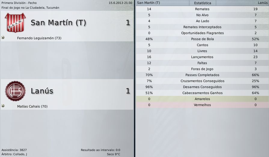 gq-tricolor Postado 6 de Julho 2009 Autor Denunciar Postado 6 de Julho 2009 Aqui estou eu, novamente a comentar! Seu save está muito agradável de se acompanhar, gq-tricolor! :yes: Bom, quanto à exibições individuais: Biglieri, Rinaldo e Jose Sand vem se mostrando cada vez mais peças chave para a finalização das jogadas de ataque do Lanús! (OBS: não me lembro de ter visto o perfil de José Sand por aqui.) Quanto aos jogos: Excelente partida contra o River Plate! Mesmo coma derrota, a equipe se mostrou muito equilibrada e jogou melhor! Criou muito mais jogadas de ataque que o River. Deve ter sido um belo jogo para se assistir. Pena a sorte estar do lado do adversário dessa vez. Uma vitória fora de casa contra o San Lorenzo também foi bastante interessante. Ao que podemos ver foi uma partida bastante aguerrida, para não dizer "porradaria geral". Ao todo foram 3 jogadores lesionados, 28 faltas e 6 cartões amarelos no jogo. Os ânimos estava alterados no estádio Pedro Bidegain. Não preciso falar sobre o 3x0 em cima do Vélez em Buenos Aires. Partida exemplar. Mesmo sendo dominado, o Lanús soube chagr ao gol adversário e concluir numa demosntração única de pontaria: 100% de chutes na direção do gol, 50% de finalizações convertidas em gol. Tudo isso jogando fora de casa. Impressionante! O único tropesso acredito que tenha sido a derrota para o Chacarita. Acho que foi mais azar do que incapacidade mesmo. Dominaram o jogo todo, mas o gol simplesmente não saiu. Acontece... Quanto a situação do Lanús no campeonato: Não vejo de maneira alguma uma séria queda no desempenho da equipe. Acho que os jornais foram sensacionalistas. Depois dos jogos que citei acima, não existem motivos para reclamar do elenco. Três jogadores em plena forma à marcar em quase todos os jogos não é para qualquer um. Matias Cahais com o papel de zagueiro artilheiro. Uma das defesas menos vazadas do campeonato. Vejo simplesmente um time em plena forma. Mas que sofre alguns contratempos de vez enquando. Continuando assim, é vaga na Libertados certa para o ano que vem. Quanto à atuação na Libertados, certamente alguns erros e carências deverão ser reparados ou a eliminação será bastante precoce, não tenha dúvidas. É isso aí ! :thumbsup: Forza Lanús ! O time tem estado num ótimo nível. Ótimo mesmo. Mas sabe como é né? Quando a gente se acostuma a ganhar bastante e surpreender times mais fortes fora de casa qualquer ropeço vira motivo pra ficar muito irritado. Gutiérrez pega pesado com seus jogadores, dá resultado é verdade, mas ele é perfeccionista demais pro meu gosto. :) Atacantes em grande forma e defesa também. É o equilíbrio tático que o uruguaio conseguiu no comando do Lanús. Estou aprendendo muito jogando esse save. Estou ligado na formação tática durante o jogo, paro inúmeras vezes durante um jogo para dar aquela arrumada nas instruções coletivas e individuais. Vem surtindo efeito. Não tinha posto ainda uma screen do Sand porque ele já estava no elenco quando cheguei e não achei que fosse um dos destaques naquela vez que postei uns cinco perfis dos melhores jogadores do plantel. Está aí agora o velhinho lenda do Lanús: José Sand Os grenás tem totais chances de ir para a Libertadores do ano que vem, é só manter a forma e esquecer esses últimos três jogos. Valeu, João! Obrigado pela força! É chato demais comentar depois do Moutinho, ele deixa a gente sem assunto shuahsuhausha. Enfim, que coisa aquele jogo contra o Chacarita, é o típico jogo que tinha tudo apra ser um jogo tranquilo, mas a bola teima em não entrar, e pior cisma de entrar contra o melhor time em campo, assim é o futebol. River e Boca não vieram para brincadeira neste Clausura, estão apelando mesmo, não perderam. A campanha não é ruim, talvez alguns empates não poderiam ter acontecido,mas conseguiu tantas vitórias importantes que eu não vou apostar em nada por enquanto...dá pra ganhar tudo até o jogo do Boca,hein!rsrs :heh: :heh: Tivemos dois gols anulados contra o Chacarita, sacanagem... Mas dou crédito ao juizão, a culpa não foi dele e sim do time que não soube finalizar bem quando a jogada era legal. Faz parte, é o futebol. O Dunga e o Muricy fazem de tudo para destruir os dois gigantes argentinos mas não conseguem. O Dunga até que não é tão insano como o Muricy porque traz uns brasileiros interessentes (fora o tal de Rodrigo Pimpão). O Muricy traz jogadores brasileiros que são reservas no Vitória, no Cruzeiro, Bahia, enfim... Citar