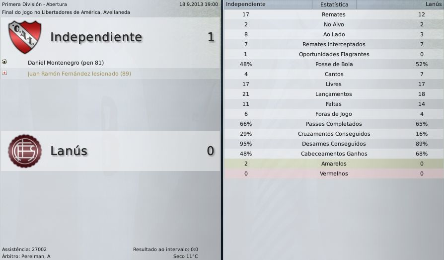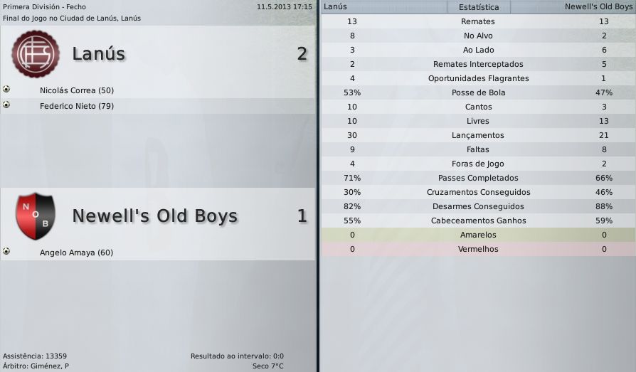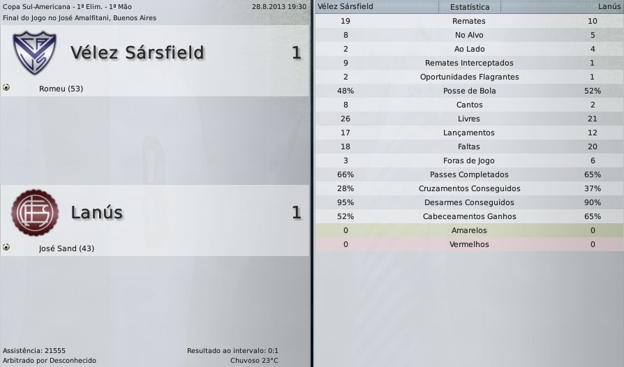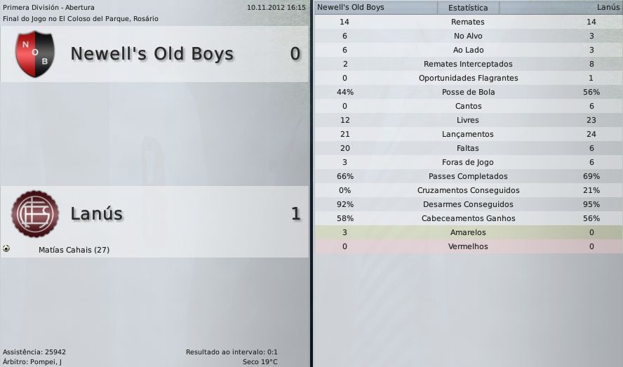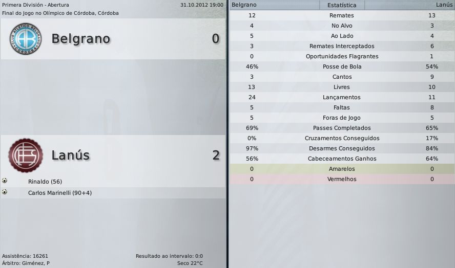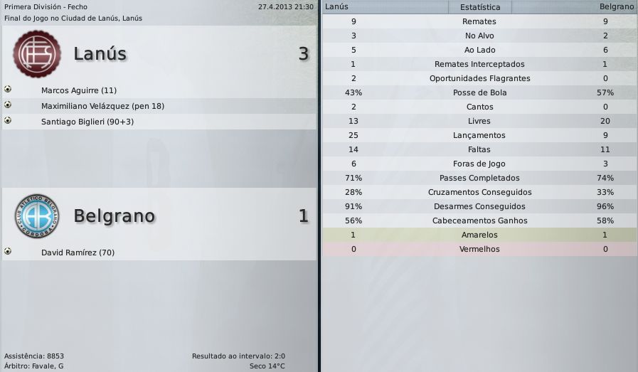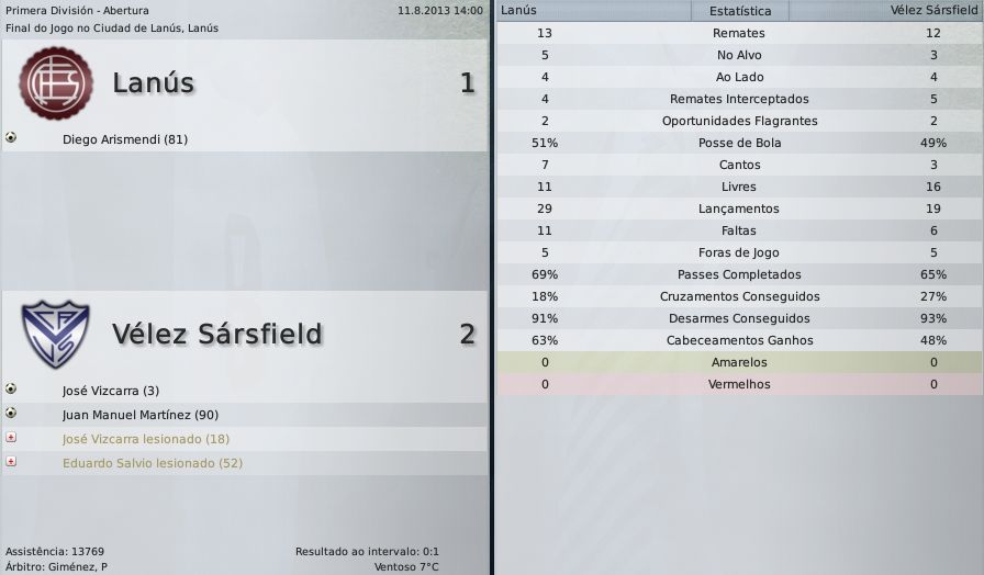gq-tricolor Postado 6 de Julho 2009 Autor Denunciar Postado 6 de Julho 2009 Aqui estou eu, novamente a comentar! Seu save está muito agradável de se acompanhar, gq-tricolor! :yes: Bom, quanto à exibições individuais: Biglieri, Rinaldo e Jose Sand vem se mostrando cada vez mais peças chave para a finalização das jogadas de ataque do Lanús! (OBS: não me lembro de ter visto o perfil de José Sand por aqui.) Quanto aos jogos: Excelente partida contra o River Plate! Mesmo coma derrota, a equipe se mostrou muito equilibrada e jogou melhor! Criou muito mais jogadas de ataque que o River. Deve ter sido um belo jogo para se assistir. Pena a sorte estar do lado do adversário dessa vez. Uma vitória fora de casa contra o San Lorenzo também foi bastante interessante. Ao que podemos ver foi uma partida bastante aguerrida, para não dizer "porradaria geral". Ao todo foram 3 jogadores lesionados, 28 faltas e 6 cartões amarelos no jogo. Os ânimos estava alterados no estádio Pedro Bidegain. Não preciso falar sobre o 3x0 em cima do Vélez em Buenos Aires. Partida exemplar. Mesmo sendo dominado, o Lanús soube chagr ao gol adversário e concluir numa demosntração única de pontaria: 100% de chutes na direção do gol, 50% de finalizações convertidas em gol. Tudo isso jogando fora de casa. Impressionante! O único tropesso acredito que tenha sido a derrota para o Chacarita. Acho que foi mais azar do que incapacidade mesmo. Dominaram o jogo todo, mas o gol simplesmente não saiu. Acontece... Quanto a situação do Lanús no campeonato: Não vejo de maneira alguma uma séria queda no desempenho da equipe. Acho que os jornais foram sensacionalistas. Depois dos jogos que citei acima, não existem motivos para reclamar do elenco. Três jogadores em plena forma à marcar em quase todos os jogos não é para qualquer um. Matias Cahais com o papel de zagueiro artilheiro. Uma das defesas menos vazadas do campeonato. Vejo simplesmente um time em plena forma. Mas que sofre alguns contratempos de vez enquando. Continuando assim, é vaga na Libertados certa para o ano que vem. Quanto à atuação na Libertados, certamente alguns erros e carências deverão ser reparados ou a eliminação será bastante precoce, não tenha dúvidas. É isso aí ! :thumbsup: Forza Lanús ! O time tem estado num ótimo nível. Ótimo mesmo. Mas sabe como é né? Quando a gente se acostuma a ganhar bastante e surpreender times mais fortes fora de casa qualquer ropeço vira motivo pra ficar muito irritado. Gutiérrez pega pesado com seus jogadores, dá resultado é verdade, mas ele é perfeccionista demais pro meu gosto. :) Atacantes em grande forma e defesa também. É o equilíbrio tático que o uruguaio conseguiu no comando do Lanús. Estou aprendendo muito jogando esse save. Estou ligado na formação tática durante o jogo, paro inúmeras vezes durante um jogo para dar aquela arrumada nas instruções coletivas e individuais. Vem surtindo efeito. Não tinha posto ainda uma screen do Sand porque ele já estava no elenco quando cheguei e não achei que fosse um dos destaques naquela vez que postei uns cinco perfis dos melhores jogadores do plantel. Está aí agora o velhinho lenda do Lanús: José Sand Os grenás tem totais chances de ir para a Libertadores do ano que vem, é só manter a forma e esquecer esses últimos três jogos. Valeu, João! Obrigado pela força! É chato demais comentar depois do Moutinho, ele deixa a gente sem assunto shuahsuhausha. Enfim, que coisa aquele jogo contra o Chacarita, é o típico jogo que tinha tudo apra ser um jogo tranquilo, mas a bola teima em não entrar, e pior cisma de entrar contra o melhor time em campo, assim é o futebol. River e Boca não vieram para brincadeira neste Clausura, estão apelando mesmo, não perderam. A campanha não é ruim, talvez alguns empates não poderiam ter acontecido,mas conseguiu tantas vitórias importantes que eu não vou apostar em nada por enquanto...dá pra ganhar tudo até o jogo do Boca,hein!rsrs :heh: :heh: Tivemos dois gols anulados contra o Chacarita, sacanagem... Mas dou crédito ao juizão, a culpa não foi dele e sim do time que não soube finalizar bem quando a jogada era legal. Faz parte, é o futebol. O Dunga e o Muricy fazem de tudo para destruir os dois gigantes argentinos mas não conseguem. O Dunga até que não é tão insano como o Muricy porque traz uns brasileiros interessentes (fora o tal de Rodrigo Pimpão). O Muricy traz jogadores brasileiros que são reservas no Vitória, no Cruzeiro, Bahia, enfim... Citar