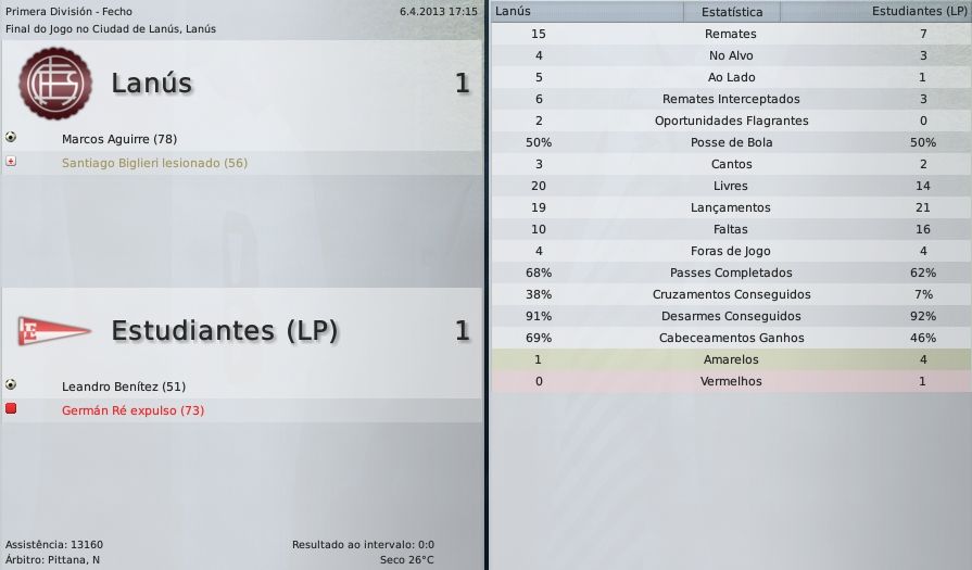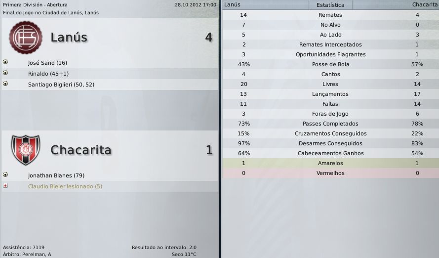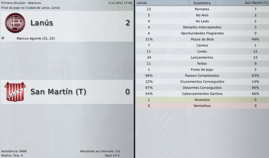 João_Moutinho_RoX Postado 6 de Julho 2009 Denunciar Postado 6 de Julho 2009 Aqui estou eu, novamente a comentar! Seu save está muito agradável de se acompanhar, gq-tricolor! :yes: Bom, quanto à exibições individuais: Biglieri, Rinaldo e Jose Sand vem se mostrando cada vez mais peças chave para a finalização das jogadas de ataque do Lanús! (OBS: não me lembro de ter visto o perfil de José Sand por aqui.) Quanto aos jogos: Excelente partida contra o River Plate! Mesmo coma derrota, a equipe se mostrou muito equilibrada e jogou melhor! Criou muito mais jogadas de ataque que o River. Deve ter sido um belo jogo para se assistir. Pena a sorte estar do lado do adversário dessa vez. Uma vitória fora de casa contra o San Lorenzo também foi bastante interessante. Ao que podemos ver foi uma partida bastante aguerrida, para não dizer "porradaria geral". Ao todo foram 3 jogadores lesionados, 28 faltas e 6 cartões amarelos no jogo. Os ânimos estava alterados no estádio Pedro Bidegain. Não preciso falar sobre o 3x0 em cima do Vélez em Buenos Aires. Partida exemplar. Mesmo sendo dominado, o Lanús soube chagr ao gol adversário e concluir numa demosntração única de pontaria: 100% de chutes na direção do gol, 50% de finalizações convertidas em gol. Tudo isso jogando fora de casa. Impressionante! O único tropesso acredito que tenha sido a derrota para o Chacarita. Acho que foi mais azar do que incapacidade mesmo. Dominaram o jogo todo, mas o gol simplesmente não saiu. Acontece... Quanto a situação do Lanús no campeonato: Não vejo de maneira alguma uma séria queda no desempenho da equipe. Acho que os jornais foram sensacionalistas. Depois dos jogos que citei acima, não existem motivos para reclamar do elenco. Três jogadores em plena forma à marcar em quase todos os jogos não é para qualquer um. Matias Cahais com o papel de zagueiro artilheiro. Uma das defesas menos vazadas do campeonato. Vejo simplesmente um time em plena forma. Mas que sofre alguns contratempos de vez enquando. Continuando assim, é vaga na Libertados certa para o ano que vem. Quanto à atuação na Libertados, certamente alguns erros e carências deverão ser reparados ou a eliminação será bastante precoce, não tenha dúvidas. É isso aí ! :thumbsup: Forza Lanús ! Citar