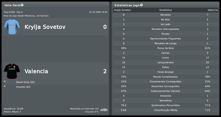 Bruno Trink Postado 6 de Novembro 2009 Autor Denunciar Postado 6 de Novembro 2009 Poxa, isso aconteceu comigo com o Corinthians no 10! Os jogadores são bons, valorizados, mas ninguem oferece uma proposta concreta e que valha a pena! A saida é emprestar e bota uma clausula de transferencia... Só goleada, Villa e Silva são o pulmão, coração, pés e mãos desse time, hein?! Foi o que eu fiz com quase todos eles, só o Maduro saiu por transferência. Villa e Silva, você ainda não viu nada... ;) Que mara-Villa! ninguém tinha dúvidas de que David Villa seria, junto com Silva, um dos pilares do elenco che nessa temporada. O chino é o maestro do time, todas as bolas passam pelos seus pés e ele sempre contribui com assistências decisivas. Mas é el guaje o grande nome desses primeiros meses de trabalho de Cañizares. Villa consegue estar melhor do que na temporada passada, quando marcou 46 vezes em 57 partidas pelo Valencia e pela seleção. Ainda bem, porque Cañi ainda não conseguiu montar uma defesa plenamente confiável. Pablo e Marchena ainda não formam uma dupla de zaga sólida e principalmente Carlos ainda não mostrou porque a torcida o chama de Marchenbauer. César Arzo até que está razoavelmente bem como protetor da zaga, mas o Albelda está perdidinho nessa nova função. Está sempre mal colocado, faz muitas faltas e já recebeu dez cartões amarelos. Nos primeiros jogos, inclusive, foi um festival de advertências, mas parece que Cañizares acertou isso depois do empate com o Xerez. Esse empate, inclusive, contra uma equipe que é candidata ao rebaixamento, não pode acontecer, mesmo fora de casa. Nem aquele outro contra o Tenerife. Pontos perdidos assim podem fazer uma diferença enorme lá na frente. Dos times que, na teoria, são nossos concorrentes diretos, já enfrentamos três. Logo na estreia na Liga, recebemos o Atletico de Madrid e vencemos bem. Depois saímos para pegar o Barça, sem Ibra e Messi, e quase surpreendemos Guardiola com uma estratégia de contra-ataques, mas vacilamos no final dos dois tempos e Thierry Henry virou a partida. Na sequência, um jogaço contra o Sevilla. O primeiro tempo, pelo menos, foi fantástico. Eles fizeram 2 a 0 mas o time se recuperou e empatou. Estamos razoavelmente bem na tabela, na 4ª colocação, mas em determinado momento, com alguns jogos atrasados, chegamos a ficar em 13º e a torcida se preocupou. O Real Madrid disparou, já venceu o derby contra o Barcelona e, pelo jeito, vai ser difícil de ser alcançado. Falando um pouco da Europa League, depois de passar pelo PAOK, caímos em um grupo bem tranquilo. Estreamos contra o IFK Gotemburgo, no Mestalla, e ganhamos sem problemas. Em compensação, tomamos um sufoco enorme em Berlin mas conseguimos vencer o Hertha num contra-ataque mortal. Vencemos depois o frio e a chuva russos além, claro, do time do Krylja Sovetov. Como esperado, lideramos o grupo e eu não acredito que fiquemos de fora da próxima fase. Uma notícia boa nesses últimos dias foi o aumento de verbas para transferência. Não sei de onde Llorente está tirando essa grana, já que o papo que vem do clube é de que estamos tendo prejuízo todo mês. Pra nós, torcida, o que importa é que, assim, poderemos ter reforços para o time na próxima janela de transferências. ¿Vale? Postado por pacoChe em 04.11.2009, 16:47 Citar