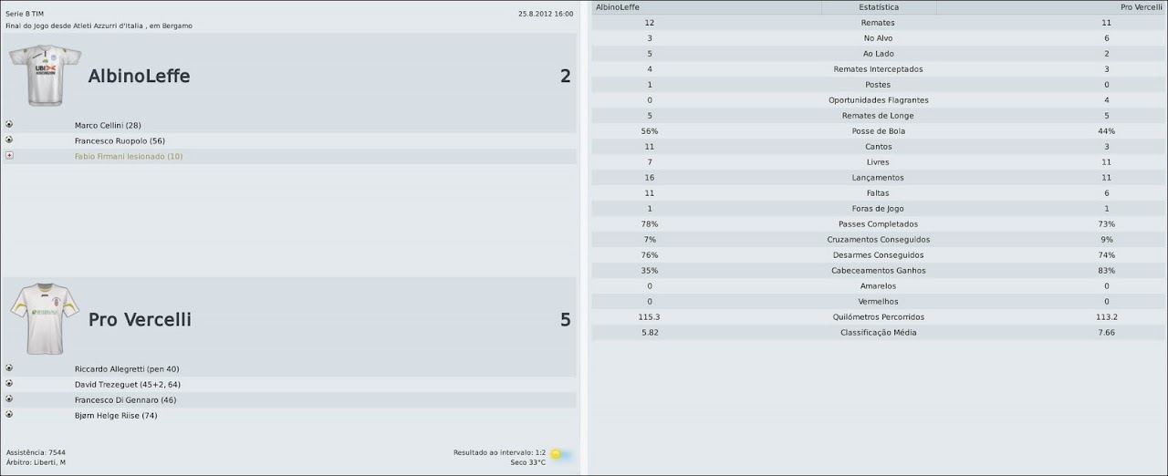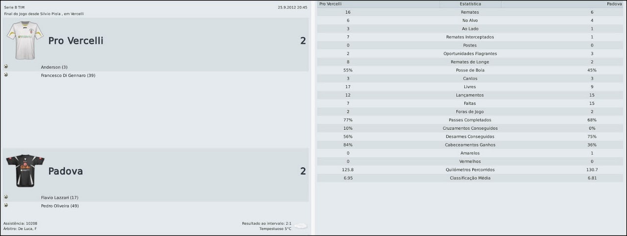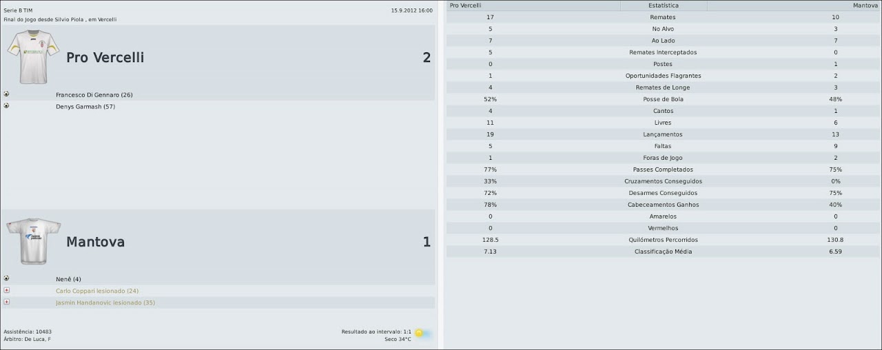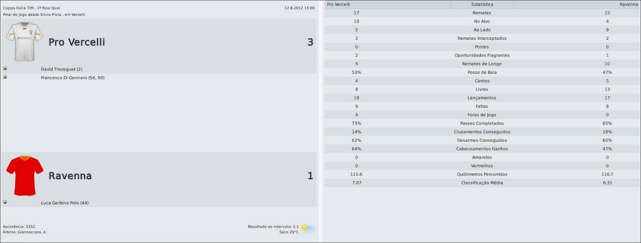 Tsuru Postado 12 de Abril 2010 Denunciar Postado 12 de Abril 2010 Técnico de futebol, Ricardo Scirea tem 32 anos. É filho do lendário jogador Gaetano Scirea, um dos maiores ídolos da história do Juventus. Pelo Pro Vercelli, time que treina atualmente, Riccardo conquistou a Série C2/A, a Supertaça da Série C2, a Série C1/B e a Supertaça da Série C1. Nova temporada, velhos problemas Vercelli, 30 de setembro de 2012 Depois de um início animador, com a chegada de Trezeguet e as vitórias sobre Roma e Getafe, a torcida e todos no Silvio Piola acreditávamos em uma ótima temporada para o Pro Vercelli, brigando diretamente pela promoção à Série A. Mas, em campo, a realidade tem sido um pouco diferente. Até começamos muito bem na Série B, mas o time voltou a apresentar os mesmos problemas defensivos do ano passado, caiu de rendimento, e assim, já está há três jogos sem vencer. COPPA ITALIA TIM Ravenna | Fiorentina Depois de uma vitória tranquila sobre o Ravenna, a tabela nos reservou uma pedreira: Fiorentina no Artemio Franchi. Optei pelo mesmo esquema tático que deu certo contra o Roma, e o jogo seguia equilibrado até que decidi arriscar mais. Aí a Viola fez o primeiro gol e "abriu a porteira". Resultado: 3 a 0 e eliminação da Coppa Italia. Quem sabe no ano que vem não conseguimos ir mais longe? SÉRIE B AlbinoLeffe | Crotone | Frosinone | Mantova | Cagliari | Padova | Ancona Foi um bimestre muito regular, para o bem e para o mal - ou ganhamos várias em sequência, ou perdemos da mesma forma. Começamos muito bem, com ótimas vitórias sobre AlbinoLeffe, Crotone, Frosinone e Mantova. Mas, depois disso, o time sentiu claramente a goleada para o Cagliari, em um jogo onde tivemos dois pênaltis contra e não merecíamos ser goleados. A partir daí, cedemos o empate ao Padova após abrir 2 a 0 e perdemos merecidamente para o Ancona, que jogou muito melhor. As derrotas também coincidiram com as contusões de Trezeguet (embora Anderson o esteja substituindo bem) e de Riise, já que o "curinga" Daud não tem rendido tão bem na ala. Nos jogos, abrimos o placar, mas não conseguimos manter os resultados e levamos sufoco mesmo quando jogamos melhor. A zaga não rende, mesmo com Santos e Pellegrino, e tem deixado muitos espaços nas costas, permitindo toque de bola, lançamentos e jogadas em velocidade. Com os resultados, ocupamos o quinto lugar da Série B, a cinco pontos do líder Bolonha. Reparem ainda que temos o melhor ataque da competição, mas, ao mesmo tempo, uma das defesas mais vazadas. A imprensa está afirmando que perdi o comando do time e que minhas mudanças, tanto técnicas quanto táticas, não funcionam mais. Mentira. Embora eu tenha a sensação de que o problema é mais grave do que o da temporada passada, tenho certeza que é só uma má-fase. Vamos seguir trabalhando para superá-la e retonar à briga direta por uma vaga na Série A. Por Riccardo Scirea às 16h44 12 comentários | Comente!