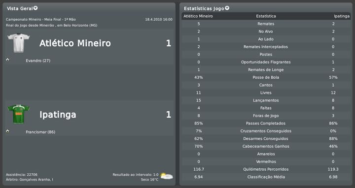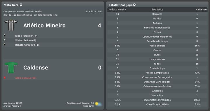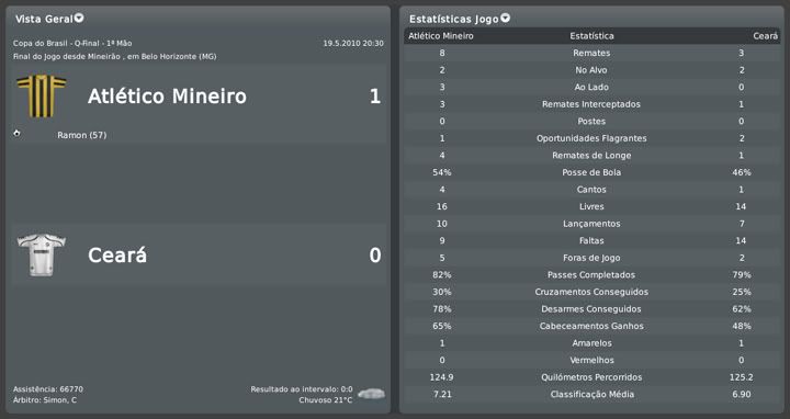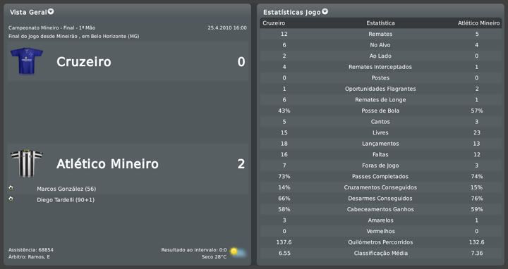 Bruno Trink Postado 31 de Janeiro 2010 Autor Denunciar Postado 31 de Janeiro 2010 Abril/2010 Está nítida a melhora do Tardelli depois da alteração nas instruções que eu passo para ele. Mais focado em finalizar, ele marcou mais seis gols no último mês e é um dos artilheiros do elenco. Empatado com ele, com 14 gols, está nossa jogada de bola parada. Rodolfo, Benítez, González e Welton Felipe, ao todo, marcaram também 14 gols, que deixam o Correa como principal assistente. Renato Abreu caiu como uma luva no meio de campo e, sinceramente, não dá para apontar o Tardelli como destaque do time. A força desse Atlético está no grupo bem homogêneo. Descontando as três vitórias seguidas sobre a Caldense, nosso retrospecto nesse mês não foi nada de especial. Vencemos três, empatamos duas, mas foi suficiente para passar para a próxima fase na Copa do Brasil e colocar uma mão na taça do Mineiro. Caldense [C] Caldense [F] Caldense [C] Santo André [C] Ipatinga [C] Ipatinga [F] Cruzeiro [F] Santo André [F] A goleada sobre a Caldense na última rodada nos deixou na frente do Cruzeiro na classificação da primeira fase e colocou a própria Caldense como nosso adversário. Atropelamos e, na semifinal, tivemos um pouco de dificuldade contra o Ipatinga. Chegamos, então, à final esperada por todos. A torcida do Galo já estava começando a ficar traumatizada por causa dos dois últimos anos mas a história não se repetiu. Na primeira partida, tivemos mais posse de bola, mas finalizamos menos. O Cruzeiro chutou muito, verdade, mas a metade das finalizações foi de fora da área. Nós fomos mais eficientes e levamos uma vantagem interessante para a partida de volta. Não foi fácil passar pelo Santo André, não. No Mineirão, vencemos apenas por 2 a 1, resultado perigoso. Mas o gol do Rodolfo logo no começo tranquilizou o time. O lateral Carlinhos ainda empatou no final, mas a classificação era nossa. Enfrentaremos o Ceará e nosso caminho até a final ficou, teoricamente, mais tranquilo com a eliminação do Santos. Próximo post: Maio/2010 Citar