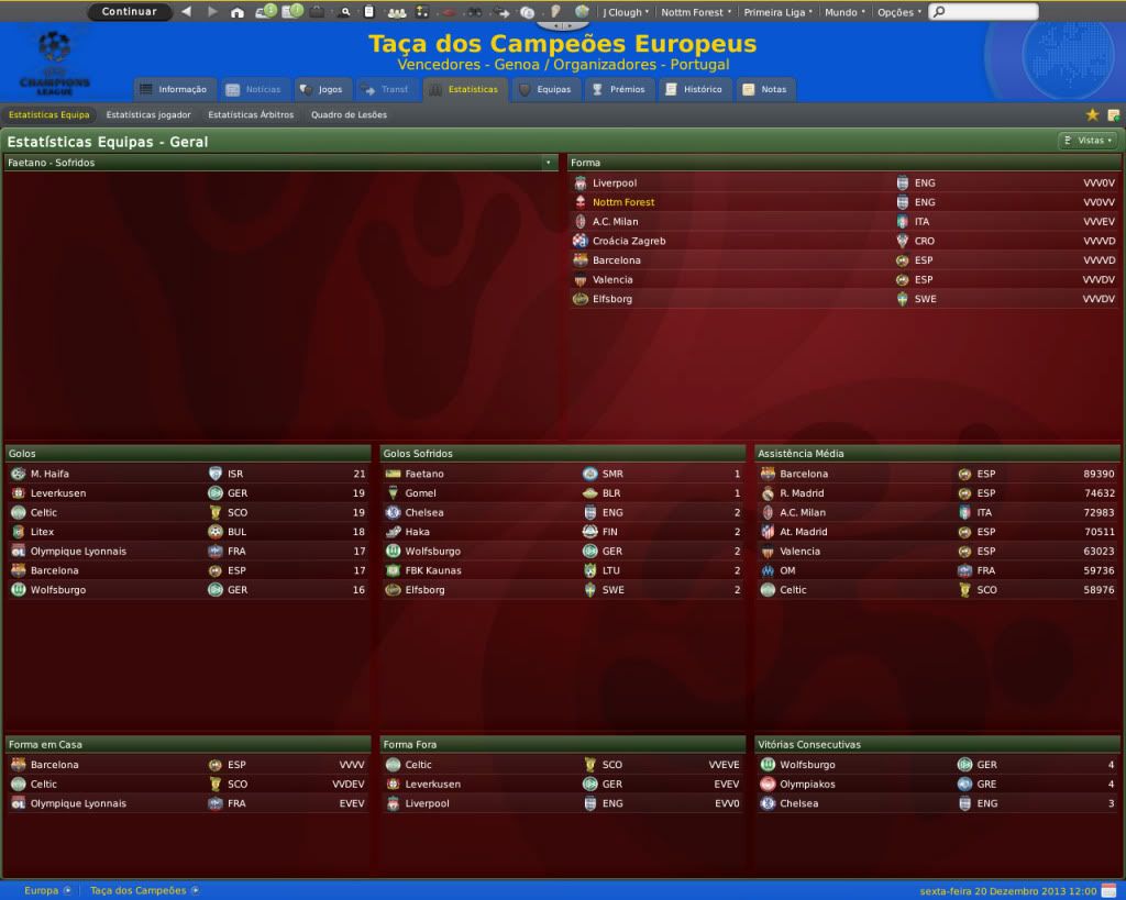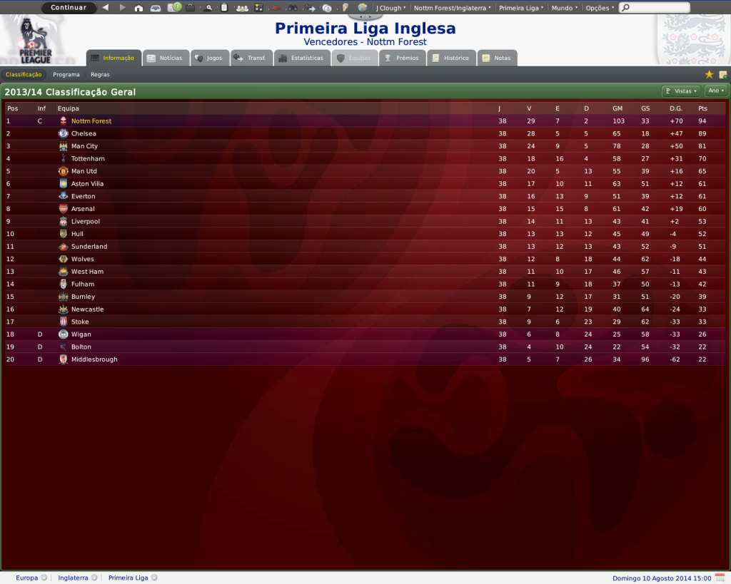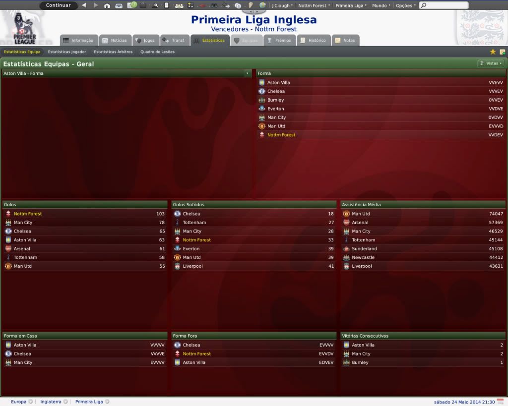Jirimias Postado 27 de Abril 2010 Autor Denunciar Postado 27 de Abril 2010 O trauma das copas. Será que chegará ao fim. Nossa vida não foi nada fácil até agora.O sorteio não foi nada generoso com nossa equipes, ou talvez não tenha sido para com Tottenham, Chelsea e Man. City, que atravessaram o nosso caminho. Agora enfrentaremos o Liverpool do artilheiro Fernando Torres,na outra semi-final jogam Arsenal e Leeds. Invencibilidade também na UCL. Primeiro lugar no grupo, agora começa o desafio. Terminamos a Fase de Grupos da UCL como primeiro colocado, e a uma certa distância dos outros adversários.Um grupo que deu espaço a grandes confrontos, destaco os jogos contra o Bayern: o primeiro terminou empatado em 0x0, apesar da força ofensiva das duas equipes; já o segundo jogo teve até virada de placar.No fim das contas, o Bayern acabou ficando fora da próxima fase, melhor para o Genoa, que não deve ir muito longe se repetir o futebolzinho da primeira fase da competição. Na próxima fase começam a se desenhar os verdadeiros donos da festa.O Atlético de Madrid é apenas um dos grandes adversários que poderemos enfrentar. Estatísticas Clubes | Estatística jogadores Olha o recorde! Um time que quer ficar na história. A equipe de marketing do Forest anunciou os números na nova era do clubes.Sinceramente, não esperava que tantos recordes foram batidos neste nosso trabalho.Aos poucos os jogadores atuais tomam conta dos números construídos pelos jogadores o passado comandados por outro Clough. Agora um número parece ser difícil de bater: o tempo de invencibilidade.Ainda assim os nossos números são um motivo de orgulho para todos nós.Chegamos a 34 jogos sem perder se considerarmos também os amistosos.Se desconsiderarmos os amistosos, são 49 jogos sem derrotas, a útliam foi em 14 de março de 2013 para o Napóli pela Europa Liga. Rumo ao Bi!! Diferença de pontos pode ser crucial na reta final. Na Premier League nossa equipe não poderia estar melhor.São 7 pontos de diferença para o vice-líder Manchester City, diferença que acredito que será difícil de manter até o final em uma competição tão equilibrada como essa, mas ainda assim é uma diferença que poderá respaldar a equipe de um momento ruim.Vale lembrar que ainda teremos mais um confronto com o City, então não podemos vacilar. Estatísticas Clubes | Estatísticas jogadores Nomes repetidos. Sucesso garantido. Rat e Cardozo continuam arrasando.O lateral é o responsável pelas bolas paradas e tem liberdade para chegar até a linha de fundo, com cruzamentos precisos ele consegue desequilibrar um jogo em pouco espaço de tempo. Cardozo é completo, bola alta, bola no pé, chute de fora da área ou chute com pouco espaço, o paraguaio, melhor jogador europeu deste ano, é simplesmente letal. Mas Cardozo também tem um companheiro bom de bola.Dzeko infernizado pelos boatos de transferência para Real Madrid e Barcelona, segue marcando gols importantes e ocupando a vice-liderança da artilharia do Forest. O novo ano vai trazer mudanças: Diakhaté está no final de seu contrato, e estamso correndo para renovar ou conseguir vendê-lo antes que ele saia de graça.Digard é indisciplinado e não cumpre o papel defensivo tão bem como eu espero de um volante.Outras mudanças virão, agora a prioridade é segurar o terror do mercado de inverno. Citar