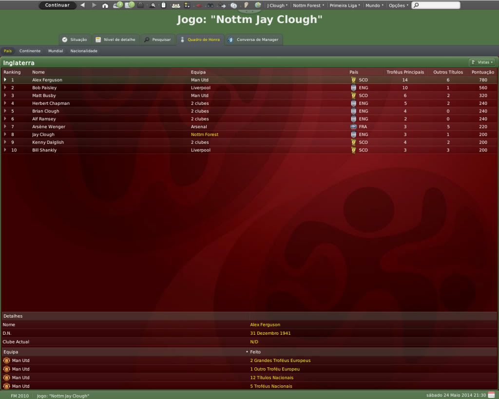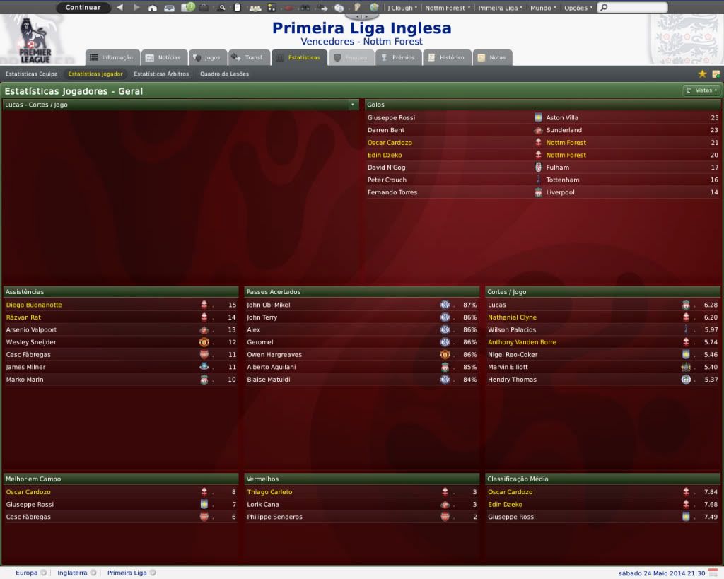 Jirimias Postado 1 de Maio 2010 Autor Denunciar Postado 1 de Maio 2010 Copas: vitória e lamento O único título que perdemos. Nottm e Manchester City estavam destinados a se encontrarem e proporcionarem jogos cheio de emoções.O encontro entre ambas as equipes na FA Cup se deu na semi-final da competição.Com uma atuação sensacional de Gareth Barry, marcando dois dos três gols do City, acabamos sentindo o gosto amargo da eliminação.Nem de longe parecíamos a equipe que nesta mesma competição havia goleado o Arsenal por 6x1.Melhor para os comandados de Cesare Prandelli, venceram e praticamente garantiam ali o título da competição, dias depois confirmada com uma fácil vitória por 2x0 sobre o Fulham. Retrospecto da competição Sem o City na final, já que havíamos deixado-os pelo meio do caminho, a final foi disputada contra o Arsenal.Para eles o jogo era uma forma de esquecer a temporada que foi absolutamente desastrosa.O começo do jogo me assustou, tínhamos uma desvantagem de dois gols no placar, parecia mesmo que as copas domésticas se tornaria um problema crônico do Nottm.Mas o gol de Cohen no final do primeiro tempo trouxe a equipe de volta ao jogo, e na volta ao segundo tempo a virada veio.Final do jogo ainda teve pressão do Arsenal, mas o placar terminou 4-3 e garantíamos o terceiro título da temporada. Um jogo tão difícil contra o Arsenal, e um jogo tão fácil contra este mesmo Arsenal semanas depois pela FA CUP, reflexo do que uma final pode fazer com uma equipe desacreditada. Retrospecto da competição Revanche. Preferia perder mil FA CUPs. A Liga dos Campeões da Europa não poderia ser mais inglesa, e em ano de Copa do Mundo esse domínio poderia fortalecer a aposta de quem brilharia no mundial de seleções.Poderia...porque o futebol inglês nunca foi tão pouco inglês.Deixando de lado o nacionalismo, pelo menos por enquanto, devo narrar o que foi esta Liga dos Campeões para nós. Depois do 1º lugar no Grupo E, passamos a acreditar que não perderíamos de ninguém, e que em qualquer momento a magia do ataque resolveria tudo.E o ataque resolvia, mas o que dizer da defesa nos dois jogos contra o Atlético de Madrid?Oito gols marcados, oito gols sofridos, e uma vitória sofrida nas penalidades, penalidades estas que voltariam acontecer. Seguíamos em frente, mas agora o pensamento agora era outro, precisávamos ter cuidado.Saímos do "salto alto" e jogamos memoráveis partidas contra o Milan (eterno freguês), e Liverpool( time feio), ambos tiveram que aturar 4-1 no resultado agregado.Adversários vencidos, eis que reencontrávamos o único time capaz de nos trazer insegurança: O Manchester City.E foi um jogo daqueles.E inacreditavelmente sem gols, já nem lembro quando isso aconteceu pela última vez em nossos jogos.A verdade é que a mira dos jogadores estava nervosa, ansiosa e tímida.Fator comprovado até nas penalidades, mas sem deixar de destacar o mérito dos goleiros. No duelo entre o excêntrico selecionável inglês, Joe Hart, e o "gelado" Kasper Schmeichel, quem levou a melhor foi o queridinho da torcida do Nottm: três penalidades defendidas.Das mãos de Kasper, e não dos pés dos atacantes, é que veio o título mais importante de minha carreira e da recente história do Nottm. Retrospecto da competição Bicampeonato. Graças à "gordurinha". Os nossos três últimos jogos da Premier League não foram nada brilhantes, sorte de que antes do jogo contra o City já éramos campeões, graças ao empate do Chelsea.Como de praxe o City causou-nos problemas, até o morto Liverpool deu o ar da graça jogando no The City Ground.Tanta euforia pelo título antecipado fez a equipe tornar o jogo contra o rebaixado Bolton em uma verdadeira luta, vencida com suor.Graças à diferença de pontos, que na 32º rodada era de 10 pontos, garantíamos que nenhum destes embaraços nos tirassem o bicampeonato, e nem mesmo o brilho de uma campa inoxidável. Estatísticas Clubes | Estatísticas jogadores Nomes que não mais repetirão. Mas fazem parte da história. Além de mostrar o desempenho dos jogadores do Nottm nesta temporada, este espaço servirá como uma fotografia para ser vista quando a saudade de alguns nomes vier a bater.Os jogadores da recente história do Nottm deixarão lugar a outros, mesmo aqueles que ainda são capazes de fazer muito pelo clube.A razão é simples: o Nottm quer ser mais do que a base para o English Team, o Nottm quer ser um Time Inglês. Não será um time inglês em sua totalidade, alguns reforços já firmados antes da implantação desse projeto, bem como alguns reforços que chegaram no mercado de inverno serão mantidos.A meta é que 70% deste time seja inglês, e que seis façam parte da seleção inglesa, número de jogadores do City, a atual base do English Team.Com a venda dos estrangeiros é que viabilizaremos a compra de ingleses selecionáveis, uma tarefa árdua, tendo em vista a valorização destes jogadores, uma vez que a maioria atua no país, e quase nenhum clube quer "armar o inimigo". Aos jogadores que brilharam deixo meus agradecimentos e ofereço mais um título de treinador do ano e minha entrada na galeria de honra dos treinadores ingleses, a eles devo o sucesso de minha carreira. Promoção á Premier League Título da Premier League Título da Copa da Liga Bicampeonato da Copa da Liga Título da FA Cup Título da Europa League Título da Supercopa Európéia Título da Liga dos Campeões da Europa Bicampeonato da Liga dos Campeões da Europa Título Mundial de Clubes Treinar Seleção Inglesa Ter o time como base da Seleção Inglesa Citar