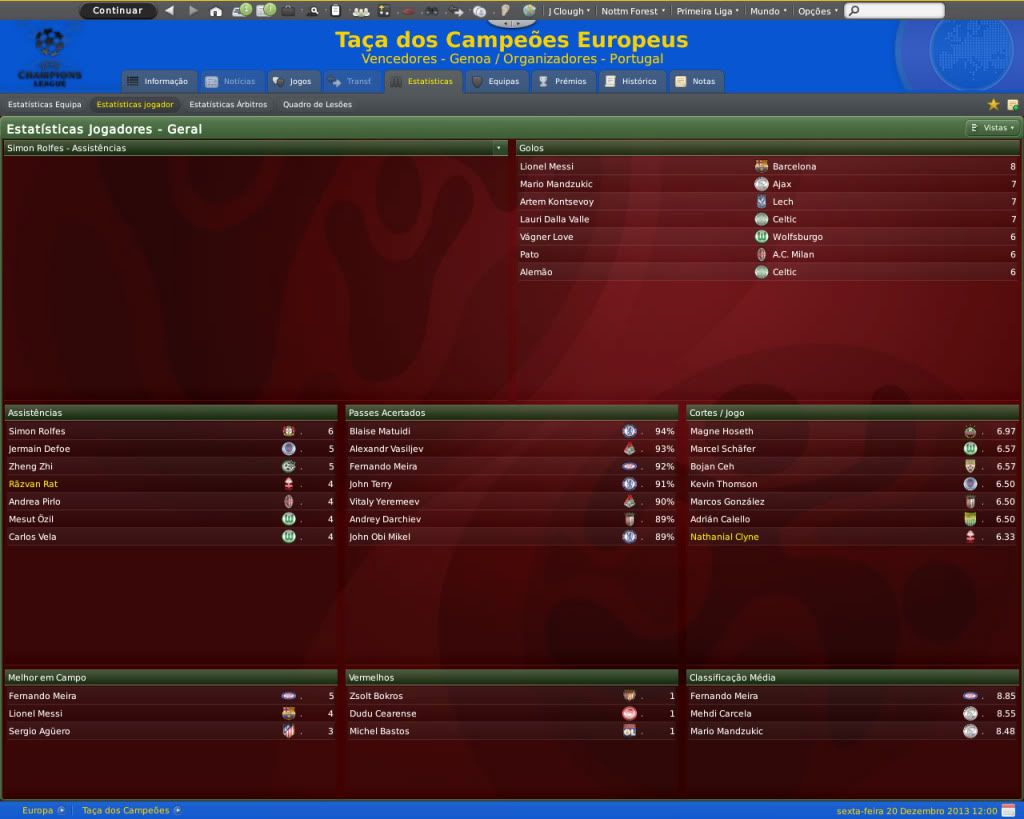 Jirimias Postado 24 de Abril 2010 Autor Denunciar Postado 24 de Abril 2010 Matou o Manchester! Caraca! Cardozo e Dzeko, da vontade até de fazer um savezin rápido com o Mancheat e comprar os dois para testar xD! Walcott jogador do segundo tempo.. deduzi certo! Depois de vencer Chelsea e MU, quem irá parar o Notts? ;X hehe essa dula é boa mesmo. Deduziu certíssimo, Walcott entra muito bem no segundo tempo, e aí entra a tática com apenas um atacante e dois pontas. Espero que ninguém pare o Nottm. Po que time irmaum!!! timasso,para meter 5 no MAN eu diria que,só me falta tu ganhar a UCL ai ja pode fechar o save! Hehe, com a UCL ainda não dá pra fechar o save, quero ver se consigo ir além. Começou com a corda toda vencendo o Genoa, com gol de Cardozo, o cara joga muito mesmo. E parece que o time italiano tá bem demais, tá na UCL...Teu grupo é muito equilibrado, mas acho que tu passa. O que que foi isso contra o Manchester United? Senhor amado, deve ter sido lindo de se ver hein? E fez certo em meter o pau no Ancelotti, jogo psicológico se não bem respondido afeta o time sim. Se não fosse o Burnley e o Newcastle estaria 100%, mas tá bem demais. Depois de tanto tempo, acho que o Nottm irá copar uma PL! Boa sorte, Jiri. :thumbsup: Sobre o Genoa o time teve um grande momento no ano anterior, valorizou a vitória na Supertaça.E é isso aí o grupo da UCl promete. Foi bonito mesmo, nem tava acreditando, o time jogando sob música.Não podia dar mole para o Ancelotti, e a resposta veio das formas possíveis hehe. Empatar foi muito ruim, os empates atrapalharam, e é bom termos cautela com esses times. Valeu! Que isso? 5 no Manchester? Fantástico...esse é o verdadeiro Notts! Parabéns pelo título da Supercopa Européia! Na UCL, pegou um grupo muito difícil a meu ver, tem Genoa que é o atual campeão, Bayern que fala por si, e ainda o time mala do Bordeaux (bem pior que pegar uma equipe do Leste Europeu, por exemplo). Mas também, se passar tranquilo, estará no caminho do título. Go go Notts :specool: Foi fantástico mesmo, foi como os velhos tempos do Nottm. Acho que o grupo vai mostrar para que veio o Nottm na UCL, e aí podemos saber até ond eo time pode ir, mas depois de encontrar com Real, Barcelona,Milan,Juventus e etc vai ser barra.Valeu,tsuru! Começo de temporada excelente, não há porque ficar irritado, mas com o sobrenome Cluogh, isso é sempre mais comum do que o esperado. Grupinho equilibrado, mas com um time inglês e jogando a bola que está, acho que passa com tranquilidade. Depois que li o Rafael22 dizer que basta o título da UCL para fechar o save, fiquei com um dúvida. Seu objetivo na UCL passa pela conquista de dois títulos da UCL, mesmo que alternados, ou seu desejo é bi consecutivo? Tb estou confiante, mas ainda temo as eliminatórias da UCL.Clough sangue quente, e este Ancelotti é um bobo,já falei que vou atrapalhar o Chelsea de todas as formas possíveis, não sossego enquanto não causar a demissão dele hsuahsuhausha O bi consecutivo é o objetivo, como fez o Nottm no passado, mas é aquilo, as metas foram criadas para ter algo para me inspirar durante o save, porém ter uma obsessão por isso eu não quero, enquanto der vontade de jogar,vou jogando. :thumbsup: Pô, num teve dó nem piedade do meu Mancheseeter <_< <_< Prometo que terá revanche aqui no meu save :heh: Está muito bem, venceu mais um título, liderando a Premier e ainda venceu o Chelsea também. O time tá jogando bonito, vamos que vamos! Hehe deixa a revanche para o seu save então :lol: . O time vai muito bem, agora sinto o time jogando de igual para igual e até mesmo sendo superior, pois na temporada passada não merecíamos o título, foi golpe de sorte. Lindo save! Bela trajetória. Grande Jiri! :D Força sempre para o histórico Notts! Valeu,gq! O Nottm já ganhou reconhecimento continental, anda fazendo bonito, e quero mais.Valeu pela força! Parabéns por mais um título. Cardozo sempre decisivo! E no Inglês deu um passo importante, partindo na frente e ainda com um jogo a menos em relação ao segundo colocado. Forest, a lenda mesmo! Cardozo destrói, e eu nunca tinha jogado com ele no FM, e até me surpreendo com tanta eficácia. A campanha na Premier tá indo bem mas não dá para amolecer, perder pontos pode ser decisivo. Agora quero tornar o Jay Clough uma lenda. :thumbsup: Citar