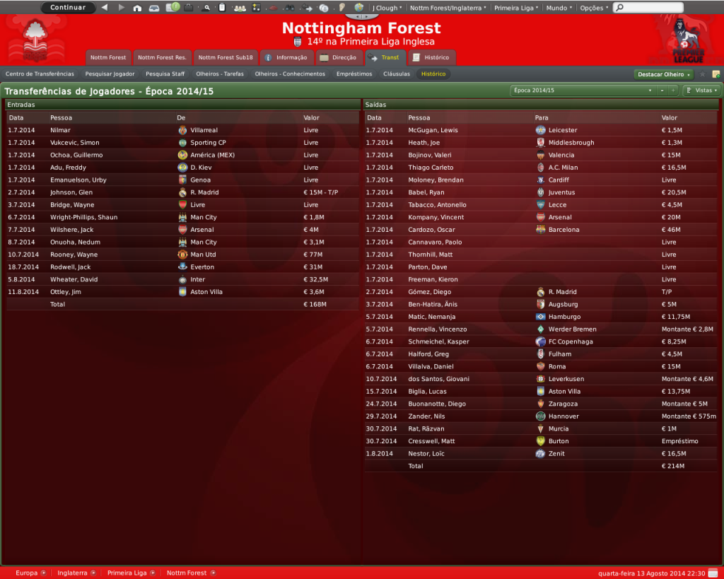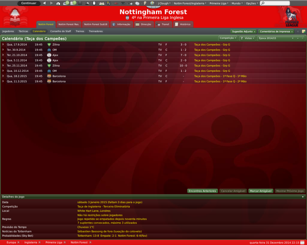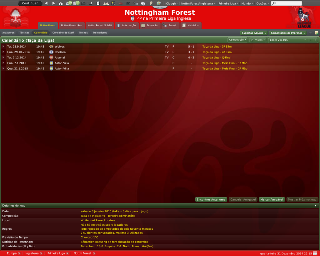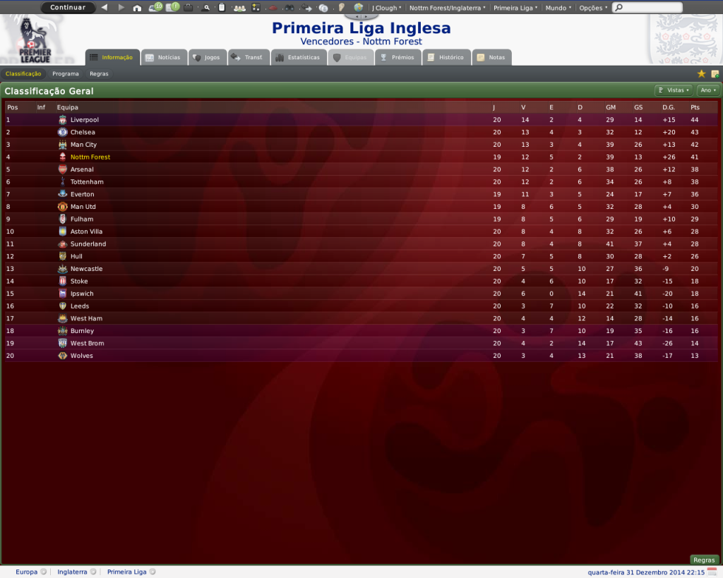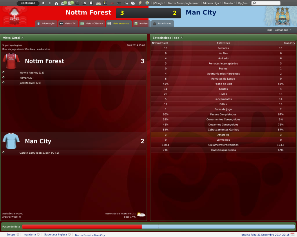 Jirimias Postado 7 de Maio 2010 Autor Denunciar Postado 7 de Maio 2010 Decidi que esta será a última temporada do save, decisão tomada após verificar que não estou mais curtindo jogar com o Nottm, talvez porque jogar um save de clube é para mim difícil de avançar várias e várias temporadas, defendendo as mesmas cores, e no caso do Nottm, chegar a um ponto de evolução do clube que para mim é o final.Sair do Nottm para uma equipe semelhante desvirtua o objetivo do save que era tornar o Nottm uma lenda depois de vinte e tantos anos, objetivo que por sinal foi cumprido.Ainda que no fim do save todos os objetivos propostos não sejam alcançados, a missão foi cumprida. Acabou a magia, ou foram os mágicos que foram embora?? A última temporada deste save se tornou talvez a mais desafiadora.Vender uma equipe inteira, vender o artilheiro - entenda-se Cardozo, perder para o tempo aquele que era o garçom - leia-se Razvan Rat, enfim tornar uma equipe mais nacional que as outras, não seria de perto uma tarefa fácil. Os títulos das Supercopas foram renovados.Na Supercopa Européia o Manchester City, manteve a sina de valorizar a vitória, mas no fim entregar o título. Já o Zaragoza era um adversário desconhecido, e foi fácil ser surpreendido por eles, que jogaram um bom futebol, mas no fim valeu o gol de Rooney( nome mais comum desta temporada quando formos falar de gols).Mal começava a temporada e já éramos bicampeões. Com um começo desse tudo apontava para mais uma temporada gloriosa,pode até ser que termine assim, mas pelo andar da carruagem as coisas não serão tão simples. A campanha na Premiership tem mostrado isso.Apesar de ficarmos boa parte das rodadas na liderança e até pelo fato de mesmo na quarta colocação estamos há 3 pontos da liderança e um jogo a menos que os três concorrentes, a campanha tem tido alguns momentos turbulentos, e o título este ano só virá se nos esforçamos bem mais.( jogo a jogo Premier).Rooney esta na terceira colocação entre os goleadores com 14 gols.A equipe marcou até agora 39 gols e sofreu 13, a segunda melhor defesa do campeonato.Viva Paul Lewin, o miúdo maravilha da zaga. Um dos grandes traumas da temporada passada foi talvez a perda do título da FA Cup.A competição começa contra o Tottenham fora de casa nos três primeiros dias do ano.O Tottenham vai querer revanche da goleada sofrida em casa no último jogo entre as duas equipes válidas pela Premiership. Por outro lado a Carling Cup caminha para o bicampeonato.Depois de eliminarmos Chelsea e Arsenal, o Aston Villa não deverá mudar isso.Jogamos contra o Villa já de olho no City que joga contra o Hull na outra semi-final.Está com cara de reencontro. Outra competição que lutamos pelo bicampeonato é a Champions League.Este ano foi difícil a fase de grupos, principalmente nos jogos contra o Marseille.O time francês derrotou-nos em casa, resultado que os colocaram no primeiro lugar no grupo, e nos jogou em uma enrascada de nome Barcelona de Cardozo e Messi, entre tantos outros.Bicampeonato ameaçado.Destaque para Rooney entre os goleadores com 9 gols e Dzeko que tem 6 gols, 6 assistências e tem a segunda melhor média do campeonato.Sim, Rooney e Dzeko jogam muito quando estão juntos! Por fim, o Mundial de Clubes.Dane-se a competição só é febre para os sulamericanos, falou que é taça, nós estamos juntos.Pensava eu que aquele 10x0 sobre o Zilina seria impossível de ser superado, mas o que dizer dos 13x0 sobre o ...o... qual era o time mesmo? A mesma facilidade não encontramos contra o River da Argentina.A final já anunciada foi bem disputada, até que eles cansaram, e nós goleamos.Mais um título para a galeria do lendário Jay Clough. Quanto ao English Team, falarei no último post, jogamos amistosos, fiz algumas estréias e realizei um desejo pessoal: levar Chris Cohen à Seleção Nacional, o que aconteceu falarei depois. Mas antes vale salientar que ele, Chris Cohen mereceu a convocação.Sem as chegadas de Rat pela linha de fundo, o Nottm perdeu sua melhor jogada.Por outro lado, foi bom pois Cohen passou a jogar mais adiantado, o que fez com que ele mostrasse o melhor futebol de toda a sua carreira. Citar