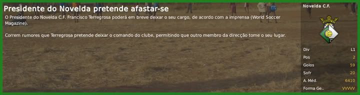 Bruno Trink Postado 26 de Maio 2010 Autor Denunciar Postado 26 de Maio 2010 Ainda não é hora de sair 27.05.2015 Depois da dupla eliminação na Champions League e na Taça do Rei, restava a nós juntar os cacos e focar na Liga. O objetivo era o vice-campeonato, já que o título estava praticamente nas mãos do Real Madrid. A vaga na próxima Champions estava quase certa, mas entrar direto na fase de grupos é importante para estender a pré-temporada. O bicampeonato merengue, como era esperado, veio com cinco rodadas de antecedência. Eles bateram os recordes de pontos e de gols marcados em uma temporada e só não venceram cinco das 38 partidas. Nossa campanha, dentro das possibilidades, também foi brilhante. Se ficamos bem atrás dos campeões, conseguimos uma vantagem de 12 pontos sobre o Valencia, terceiro colocado. Quem decepcionou foi o Barcelona, que terminou com a 4ª vaga para a Champions. Pelo que jogou nessa temporada, todos acreditavam piamente que o Real Madrid conquistaria a tríplice coroa. Ainda mais depois que, nas semifinais da Champions League, conseguiu empatar com o Genoa fora de casa. Mas eu conhecia a força da equipe genovesa e não me surpreendi com a vitória deles dentro do Bernabéu. Sobrou para eles a dupleta ao vencer o Barcelona na final da Taça do Rei Na véspera da última partida, contra o Real Madrid, nosso presidente Francisco Terregrosa anunciou que pretende se afastar do cargo. Bem ou mal, por melhor que seja meu trabalho à frente do futebol do clube, sempre fica um certo receio do que pode acontecer. Sabemos que cada um tem suas preferências e estamos sujeitos a elas. Pelo que eu tenho ouvido nos bastidores, é grande a possibilidade de algum membro da diretoria assumir a presidência, mas não há nada certo. A única coisa certa mesmo foi a proposta que eu recebi do Porto logo após a derrota para os madridistas. Proposta interessante financeiramente para substituir o demitido André Villas Boas, mas eu recusei. Pensei bastante, mas resolvi continuar no Novelda pelo menos mais uma temporada. Acho que falta coroar minha passagem pelo clube com um título. Nesses seis anos no La Magdalena, conseguimos ótimas campanhas, levamos o clube a um nível nunca imaginado pelos torcedores, mas faltam troféus. O único campeonato conquistado foi o da Segunda B, já que eu não considero a vitória na primeira fase da Tercera como título. Quero montar um time ainda mais forte para a próxima temporada, alguns jogadores já estão acertados com o clube e outros ainda podem vir. A torcida do Novelda pode esperar por mais uma temporada brilhante. Postado por Gathii Citar