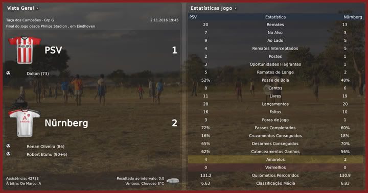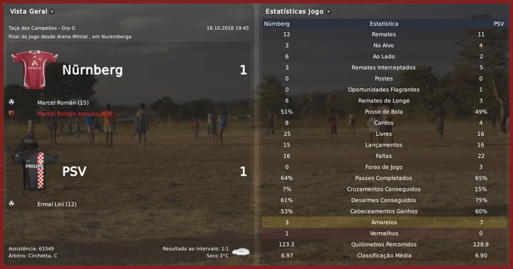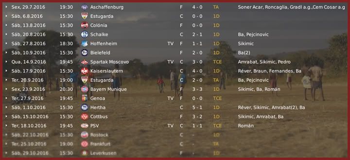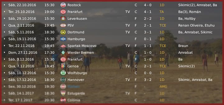 Bruno Trink Postado 14 de Junho 2010 Autor Denunciar Postado 14 de Junho 2010 Tentando entrosar, mas as lesões não deixam 18.10.2016 O início dos trabalhos oficiais no novo clube foi complicado, como eu já supunha. Com muitas novidades e um esquema um pouco modificado em relação ao que era utilizado na temporada passada, o time sentiu nos primeiros jogos. Não na estreia na DFB-Pokal, já que uma equipe reserva não teve dificuldade nenhuma para bater o fraco Aschaffenburg. Mas, nas quatro partidas seguintes pela Bundesliga, empatamos três vezes e fomos salvos por uma jogada de bola parada contra o Schalke. O que me fez pensar em mudanças no esquema. O 4-1-4-1, com alguns ajustes, ficou apenas para as partidas mais difíceis fora de casa. A ideia é um meio de campo mais fechado e saindo rápido com Amrabat pelo meio e Pedro e Sikimic pelas extremidades. Nos jogos em casa ou contra adversários mais fracos, mudamos para um 4-2-3-1 mais ofensivo que vem funcionando muito bem. O trio de meias recebe a companhia de um dos meias centrais, normalmente o Badelj, e faz bem o suporte ao Ba, não deixando nosso atacante isolado. Depois do começo turbulento na Bundesliga, o time melhorou com a nova formação e os resultados passaram a aparecer. Podíamos estar entre as melhores defesas do campeonato, se não fossem os três gols sofridos no épico empate com o Bayern, mas o ataque está sobrando, principalmente com Demba Ba. Por falar em ataque, iniciamos a temporada com mais uma contratação, o nigeriano Robert Etuhu. Para quem não se lembra, Etuhu foi uma aposta minha no Novelda, duas temporadas atrás, mas a nova diretoria passou por cima de mim e autorizou sua venda para a Inter de Milão. Pouca gente sabe mas esse episódio foi, inclusive, quando eu comecei a pensar em deixar o clube. Mas o garoto evoluiu, só que não tinha chances no Giuseppe Meazza. A princípio, é o reserva imediato do Ba, mas é questão de tempo que eu comece a utilizar os dois juntos no ataque. Duas expulsões marcaram nosso começo na UEFA Champions League. Em um grupo complicado, demos a sorte de estrear contra, teoricamente, a equipe mais fraca em casa. Aproveitamos a Arena Mintal cheia e derrotamos o Spartak sem contestação. Saímos depois para encarar o Genoa que manteve a mesma base de dois anos atrás quando sofremos com o Novelda. Fomos sufocados, mas aguentamos bem a pressão até os 22 minutos do segundo tempo, quando Fabian Delph foi expulso. Ainda tentei chegar a uma vitória, mas o 0 a 0 não foi de todo ruim. Só que hoje recebemos o troco na mesma moeda. Já não tivemos Demba Ba, suspenso nas três primeiras partidas, e o número de desfalques para o jogo contra o PSV chegou a cinco. Quase meio time fora complica para qualquer um. Ermal Lini abriu o placar de cabeça, mas Marcel Román empatou em um chutaço de fora da área logo depois. Não estávamos fazendo um bom jogo e a situação piorou com a expulsão do uruguaio. Dessa vez não dá pra dizer que o empate foi bom. O grupo está muito embolado e precisaremos de bons resultados fora de casa para avançar para a próxima fase. Postado por Gathii Citar