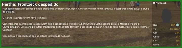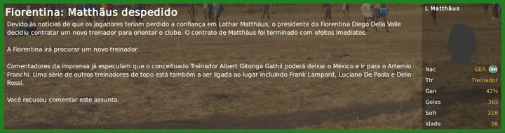 Bruno Trink Postado 29 de Junho 2010 Autor Denunciar Postado 29 de Junho 2010 De volta ao trabalho 20.12.2018 Finalmente, chegaram ao fim as minhas "férias forçadas", quatro meses depois do final da Copa do Mundo. Na verdade, três meses já que as especulações começaram antes. A primeira foi logo depois do fim da Copa, mas eu não tinha a intenção de trabalhar no Brasil, queria voltar para a Europa. Passei algumas semanas viajando com a família mas depois voltei a frequentar os estádios de futebol. Vi Stoichkov reforçar muito o seu Liverpool com Neymar, Higuaín e mais praticamente meio time. Vi meus ex-clubes, Novelda e Nürnberg, começarem bem os respectivos campeonatos nacionais. Então chegou novembro e, com ele, as mudanças de treinadores. A primeira foi na Fiorentina, que até cogitou meu nome, mas preferiu acertar com Francesco Moriero. Na mesma época, fiz alguns contatos para assumir o cargo vago no Milan, mas o escolhido foi Marco van Basten, com muito mais identificação com o clube. O mês foi de muitas especulações, mas nada concreto. A maioria em clubes na Espanha, como com Valencia, Atletico de Madrid, Deportivo e Betis, mas não estava nos meus planos ter que enfrentar diretamente o Novelda. Não queria também trabalhar nos turcos Kayserispor e Trabzonspor por achar que perderia visibilidade numa liga menor. O que não é o caso da Premier League, mas esperava um clube com a reputação um pouco maior que Everton e Sheffield United. Estava começando a ficar um pouco impaciente com a falta de perspectivas e até cogitei a hipótese de tentar quebrar a nova hegemonia do Lyon na França, mas não cheguei nem a conversar com o Bordeaux, que acabou contratando David Trezeguet. O ano estava chegando ao fim e, com ele, as possibilidades também diminuiam. O Leverkusen trocou Jürgen Klopp por Tim Borowski dois dias antes da notícia que mudou todo o panorama: Rafa Benítez não resistiu a má campanha do Real Madrid na Liga e caiu. Florentino Pérez não perdeu tempo e bancou a multa rescisória de Gian Piero Gasperini com o Genoa, líder da serie A italiana. Multa que não deve ter sido baixa já que Gasperini estava há quase 10 anos no clube rossoblu. Foi quando o meu telefone tocou. Em condições normais, eu aceitaria na hora. Trabalhar no campeonato italiano seria um sonho, ainda mais no atual campeão e líder da atual temporada. Um time que complicou minha vida sempre que o enfrentei. Mas pedi uma semana para avaliar outras situações. Mais especificamente um boato de que Rijkaard seria demitido do Chelsea. Boato que se confirmou na mesma tarde. Enquanto Abramovich deixava Paul Clement como interino, eu não cheguei nem a tomar conhecimento da notícia de que Tony Mowbray tinha sido demitido do Manchester United. Larguei tudo e vim para Manchester. A possibilidade de dirigir o clube treinado por sir Alex Ferguson mexeu comigo. Não vou negar também que a proposta salarial também ajudou. Apesar do famoso empréstimo de quase €600M, a situação financeira do clube é estável, muito graças aos 75797 lugares do Old Trafford e aos prêmios das competições europeias. O elenco é bom. Conversei com Mike Phelan sobre o grupo e pude perceber que já conhecia muitos dos jogadores. A defesa não me preocupa. Temos David Postma, talvez o melhor goleiro dessa nova geração, além do Luca Pergolizzi, titular da seleção italiana. Nas laterais, o brasileiro Rafael e o saudita Hatim Al-Otaibi. O grande destaque, de acordo com Phelan, é o zagueiro Kevin Ziegler, que apareceu como um meteoro no Rapid Viena e que, inclusive, eu tentei contratar antes de sair do Nürnberg. Do meio para a frente, poderei contar com a experiência de Yoann Gourcuff, Theo Walcott e Wayne Rooney. À primeira vista, faltam no grupo um atacante, um volante e opções nas alas e eu já tenho até alguns nomes na mira. Os diabos vermelhos estão em 7º lugar na Premier League e se classificaram bem na Champions League. O problema é que o Arsenal disparou na liderança e, mesmo melhorando a performance do time, vai ser difícil alcançá-los. O caminho começa logo com o derby de Manchester, na casa do City, daqui a três dias. Mas não estamos em condição de escolher adversário nem palco. Postado por Gathii Citar