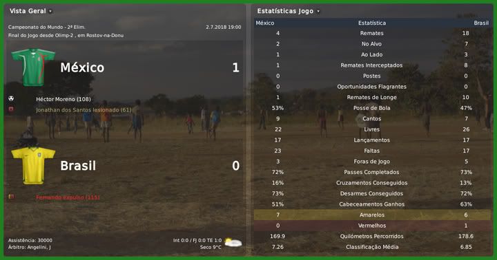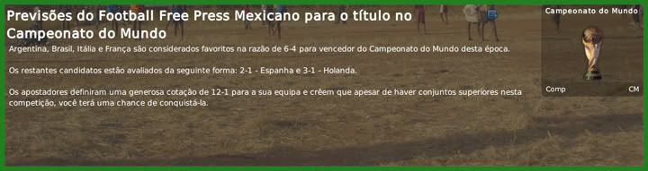 Bruno Trink Postado 28 de Junho 2010 Autor Denunciar Postado 28 de Junho 2010 O mundo tem um novo campeão 15.08.2018 Depois da Grécia bater na trave em 2010, o G-7 de campeões mundiais tem um novo membro e virou G-8. Para isso, a República Tcheca teve que derrotar, em sequência, três deles e conquistou a Copa do Mundo. Mesmo com a eliminação do México, fico feliz pelo Prochazka, ótimo garoto que começou comigo no Novelda é hoje é titular absoluto da seleção tcheca. Posso dizer que, com o México, fizemos uma campanha muito digna, demos o azar de precisar enfrentar três campeões mundiais e caímos de pé nas quartas de finais. Assim, deixo o cargo com a sensação do dever cumprido. Antes da Copa, fizemos apenas um amistoso contra o Cazaquistão, um jogo onde os titulares não se arriscaram e os resevas nos deram a vitória. Sem jogos da seleção, rodei o mundo assistindo potenciais convocados e adversários e, quando jornalistas me viam, logo especulavam que eu estaria acertando com algum clube. Foi assim com Stuttgart, PSG, Wolves, Hertha e Fiorentina. Mas meu foco era todo na Copa. Obviamente, não estávamos entre os favoritos, mas eu tinha certeza de que poderíamos cumprir as expectativas da Federação, que era chegar às quartas. Daí, o que viesse era lucro. Argentina | Brasil | Itália | França | Espanha | Holanda Estreamos logo contra os tricampeões do mundo. Um time muito forte, muitos jogadores na casa dos 30 anos e com muita experiência internacional. Muitos diziam que Messi, Agüero, Tévez e companhia estavam decadentes, mas encaramos os argentinos com muito respeito. Nava foi derrubado, Giovani converteu e imaginei, por alguns instantes, que conseguiríamos uma vitória histórica. Mas o gol de Kun Agüero empatou a partida cinco minutos depois. O jogo seguinte, contra a Suiça, era uma decisão. Para seguir adiante na Copa, tínhamos que vencer. Não foi nada fácil, principalmente para segurar o resultado nos minutos finais, depois da expulsão do Montes de Oca. A classificação ainda não estava 100% garantida, mas eu optei por poupar os jogadores pendurados contra a Coreia do Sul. A partida foi difícil e só conseguimos a vitória no segundo tempo. A fase de grupos teve algumas surpresas, como a eliminação precoce de duas favoritas, Espanha e Holanda, e, por um gol, terminamos em 2º lugar no grupo F. Assim, caímos numa chave muito mais complicada em que, logo nas oitavas de finais, o adversário seria o pentacampeão Brasil. É verdade que, desde 2002, a seleção brasileira vem numa sequência de fracassos e trocas seguidas de treinador, mas é sempre a seleção brasileira de grandes talentos. A nossa estratégia, novamente, era de jogar nos contra-ataques. Sem o Sandro e, principalmente, o Neymar, eles perdiam muito da força e conseguimos manter o zero a zero durante todos os noventa minutos. Já no segundo tempo da prorrogação, numa cobrança de escanteio da esquerda, Moreno subiu muito e fez o gol da vitória. A intenção, contra a Itália, era repetir a maneira de jogar. Os contra-ataques foram raros mas, num deles, Raúl Nava abriu o placar. Pena que, numa confusão na nossa área logo no lance seguinte, a bola bateu no Ochoa e entrou. A azzurra era muito melhor do que foi o Brasil, mas nos segurávamos bem. No início do segundo tempo, a pressão foi absurda, até que Acquafresca virou o jogo. Passamos ao ataque, mas não foi suficiente para empatar, nem mesmo depois da expulsão do Chiellini. Estou oficialmente desempregado. Como já estamos no meio de julho, acho difícil que apareca alguma oportunidade interessante para mim antes do início da temporada. Sei que algumas seleções ficarão sem treinador depois da Copa, mas não pretendo, pelo menos não agora, treinar outra seleção. É mais provável que eu fique alguns meses de férias forçadas, apostando na já tradicional queda de treinadores antes da janela de inverno. Postado por Gathii Citar